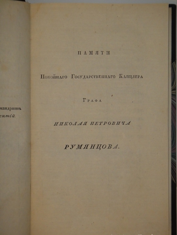 Посвящается: " Памяти покойного Государственного канцлера графа Николая Петровича Румянцева ".