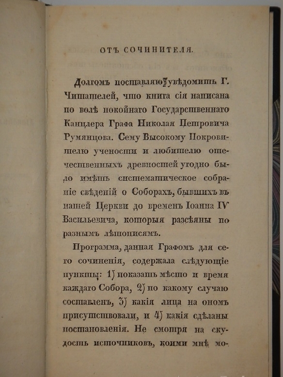 В Предисловии автор указывает, что, к сожалению, труд не был окончен при жизни издателя-мецената и что он имеет честь представить его любителям отечественных древностей, как первый ещё исторический опыт о древних Соборах церкви нашей.
