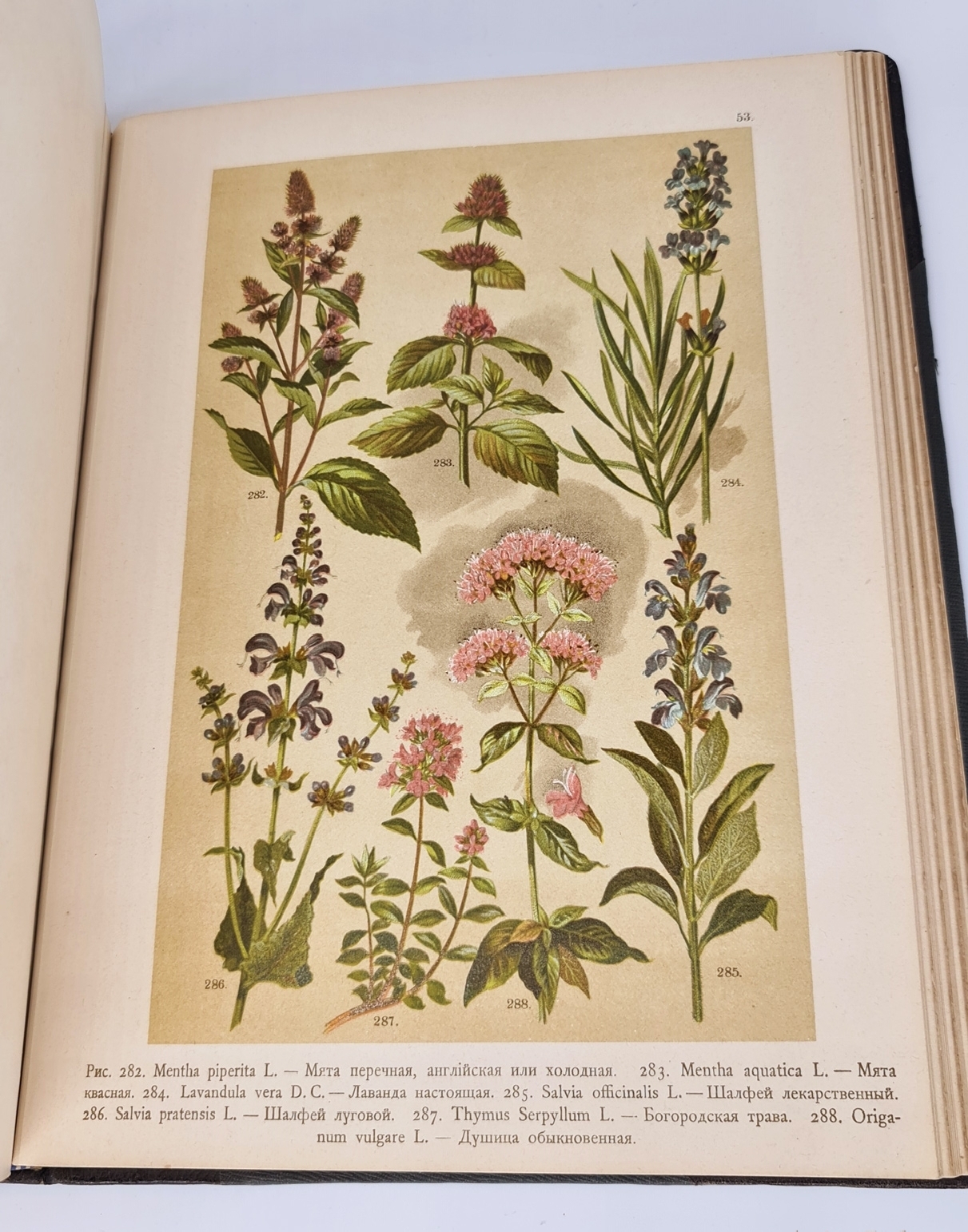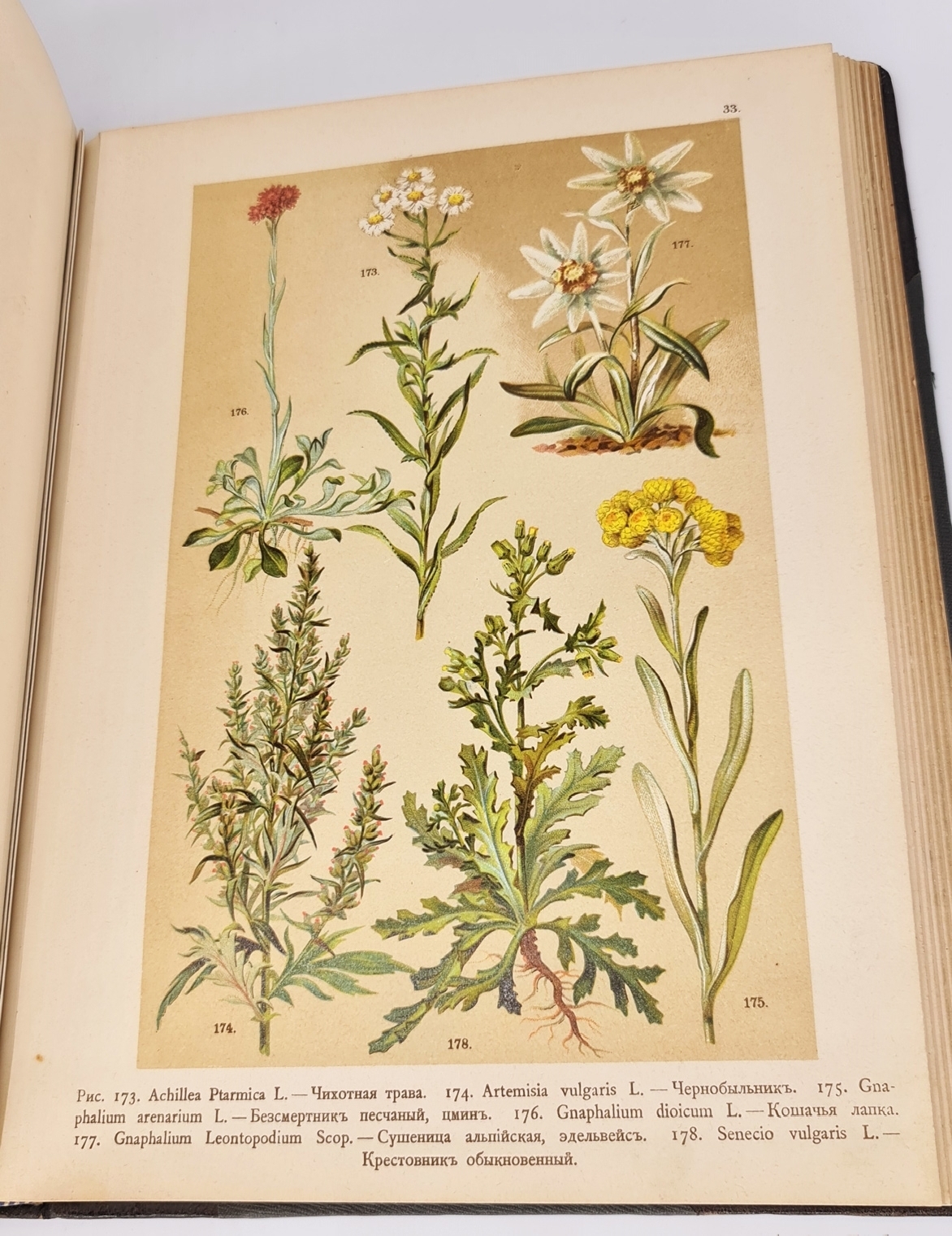 Под редакцией Н.А. Монтеверде, главного ботаника Императорского С.-Петербургского Ботанического сада. 80 хромолитографированных таблиц, изображающих 459 растений в красках, и 42 л. текста с 735 политипажами. С изменениями и дополнениями применительно к России. 2-е издание, исправленное и значит дополненное. [10], XXXIV, 273, XVI стр, 80 л. цв. ил. Комплектное издание. Большой формат: 29x23см. Сохранность очень хорошая.