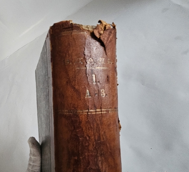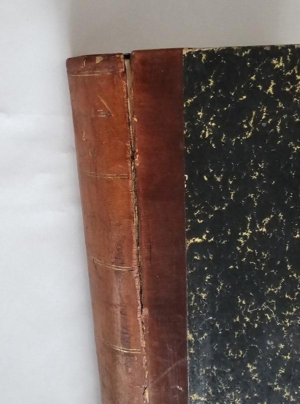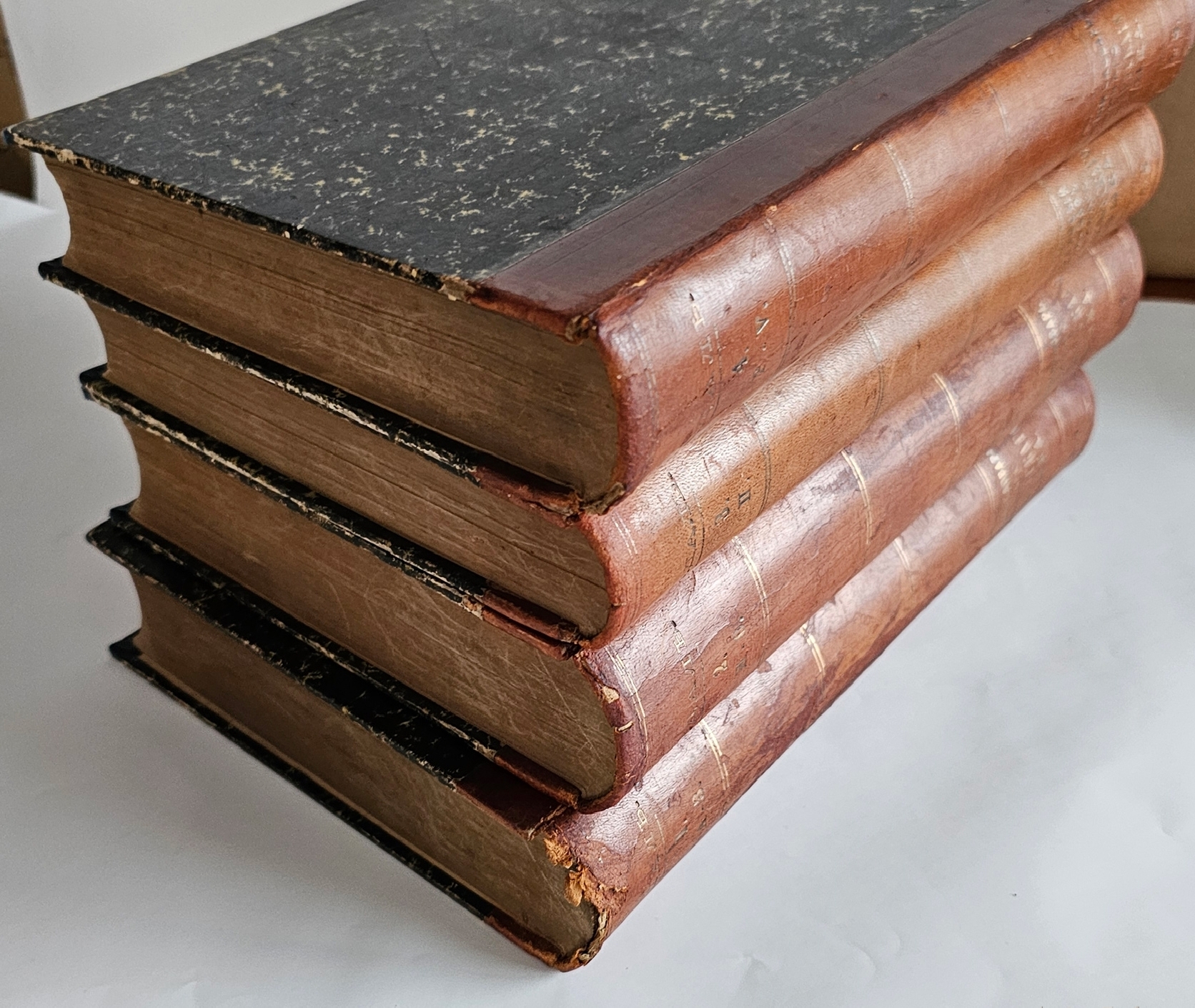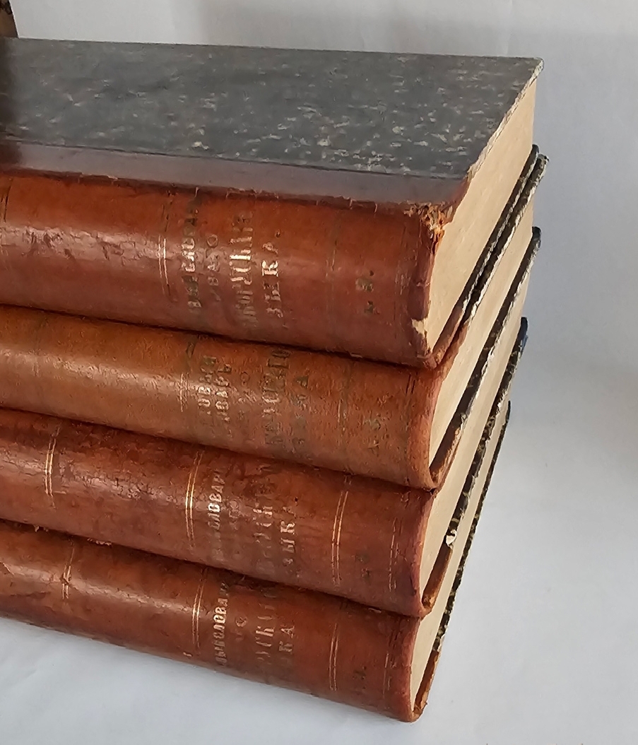 В четырех полукожаных переплетах эпохи. Потертости переплетов, небольшие разломы по форзацам, трещины по сгибам корешка в т. 1 и 2. Блоки преимущественно чистые. Дореволюционные экслибрисы на форзацах каждого тома.