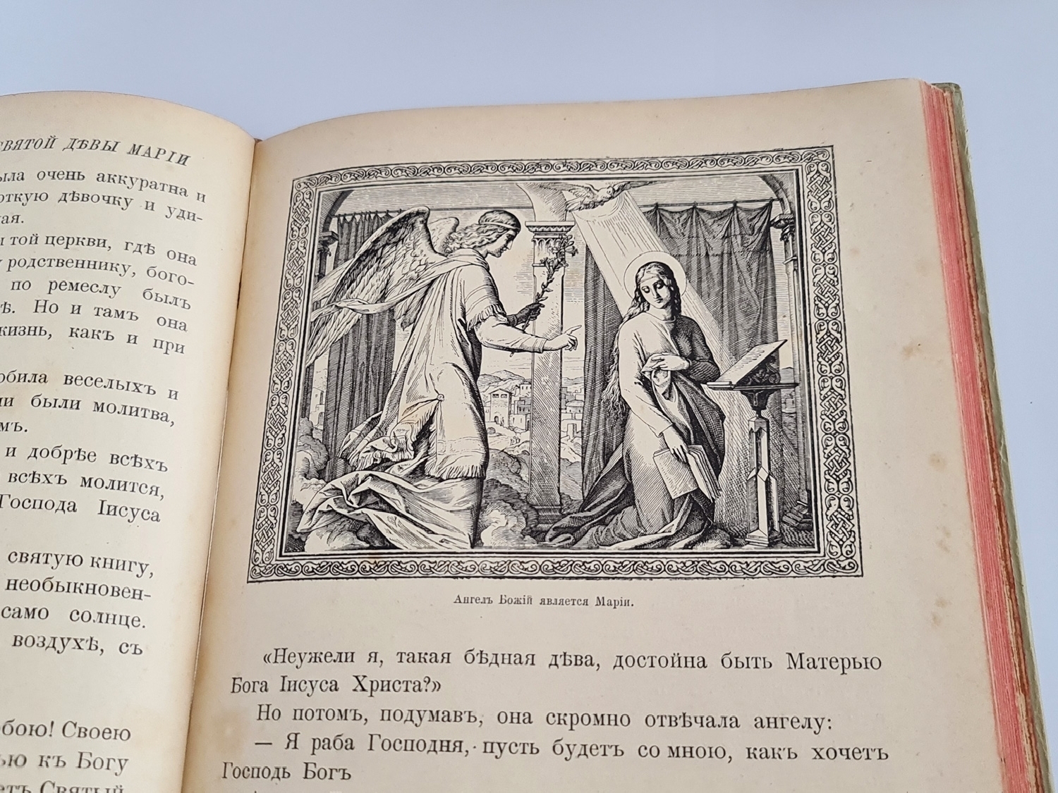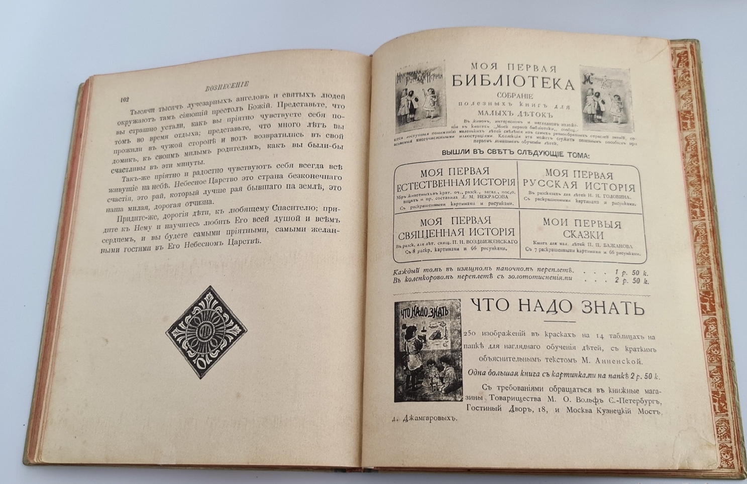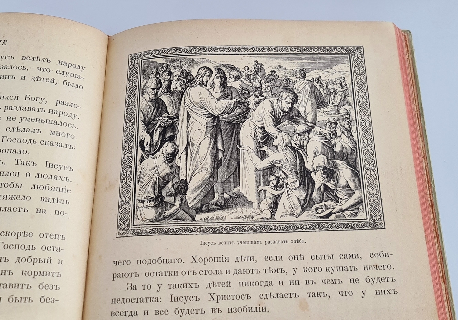 С 8 раскрашенными картинами и 66 рисунками. Учение Христа, изложенное для детей. Рисунок на верхней крышке переплета художницы Е.Бём. Елизавета Меркурьевна Бём — русская художница, иллюстратор, силуэтист.