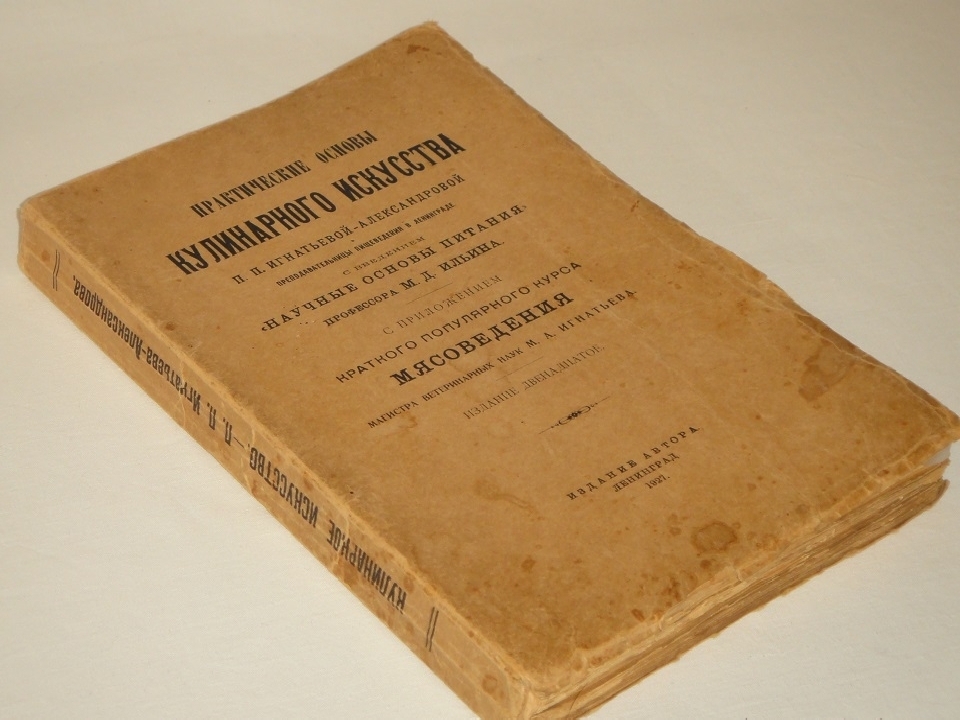 Полное название: Практические основы кулинарного искусства П.П.Игнатьевой-Александровой преподавательницы пищеведения в Ленинграде с введением " Научные основы питания " профессора М.Д.Ильина. С приложением краткого популярного курса Мясоведения магистра ветеринарных наук М.А.Игнатьева. Издание автора.