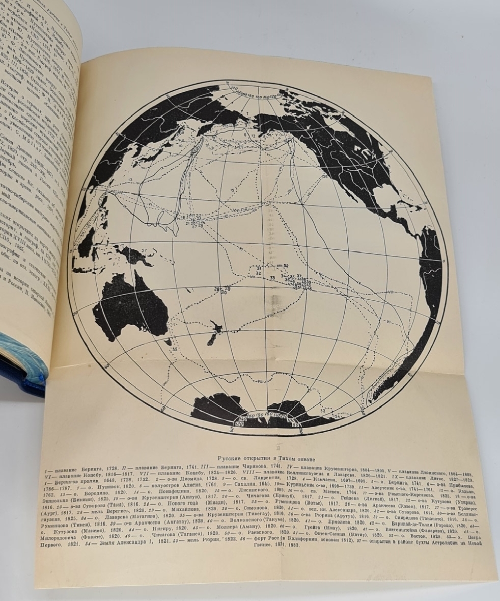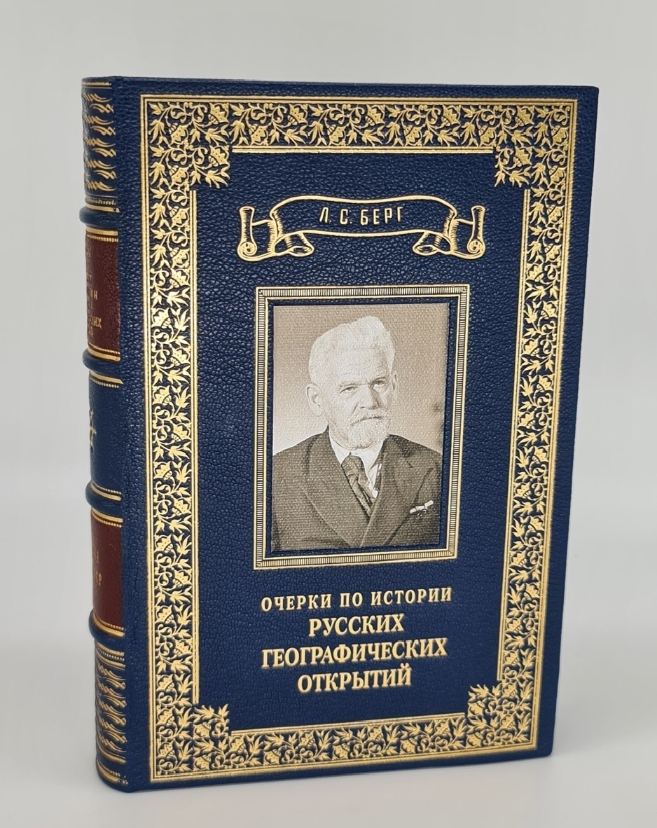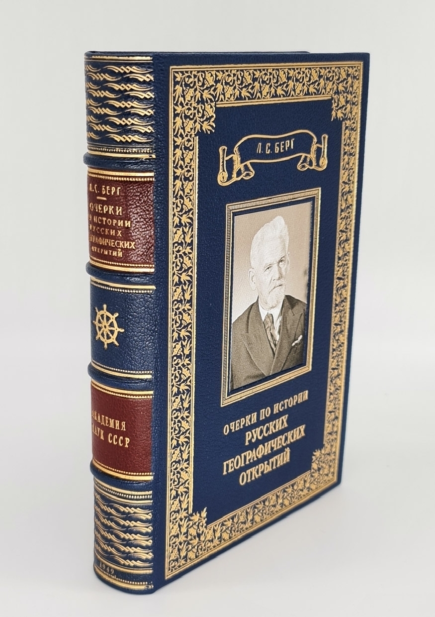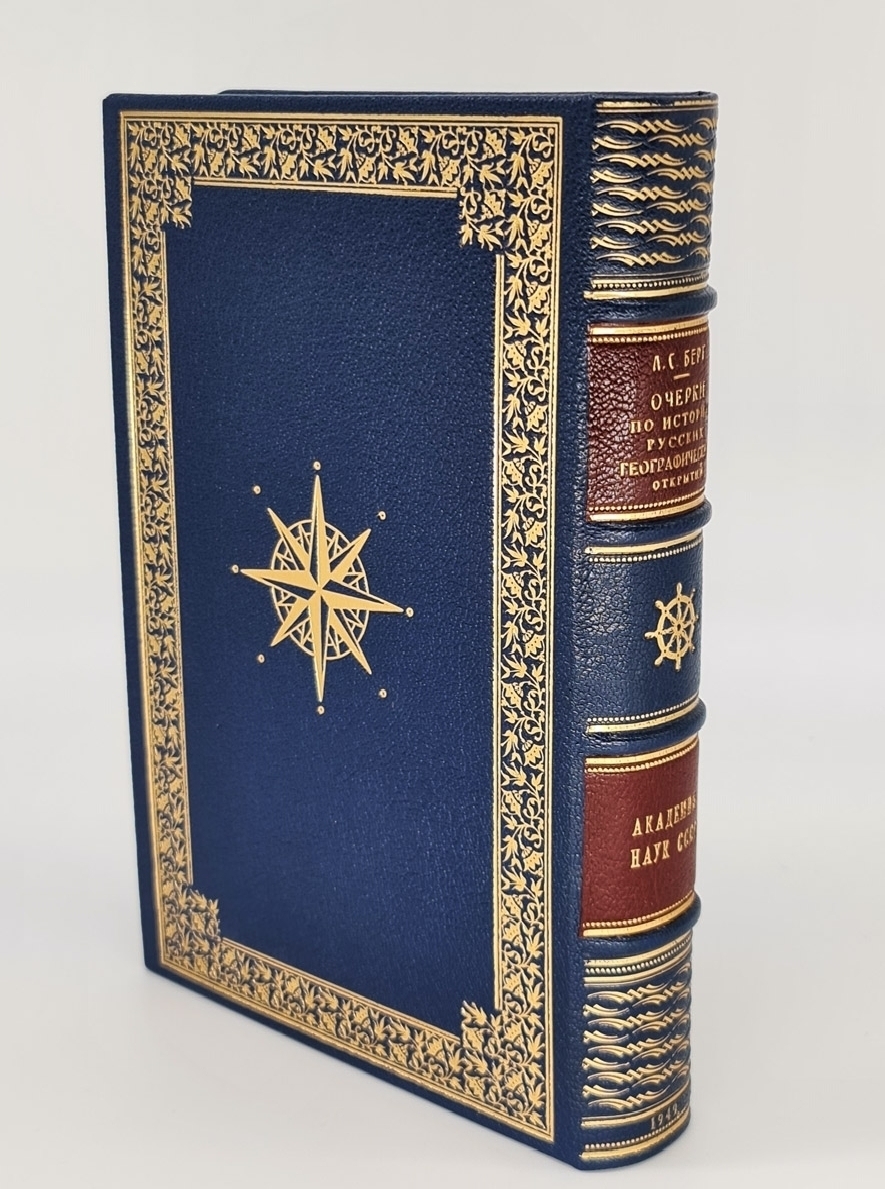 Книга в цельнокожаном переплете с инкрустированной вставкой на верхней крышке. Красивое золотое художественное тиснение. Декоративный обрез. Форзацы - "фрегат в шторме". Книга отлично проиллюстрирована заставками, рисунками в тексте, картами, портретами выдающих русских путешественников. Очень интересное издание. Формат: 22х15,5 см., 466 стр. Состояние отличное.