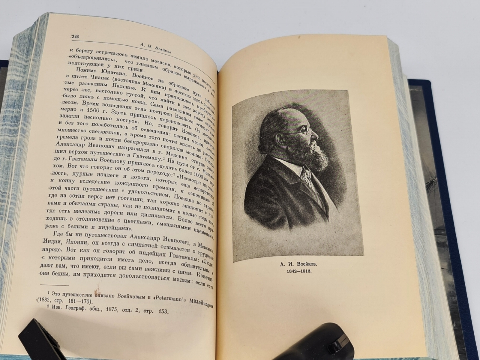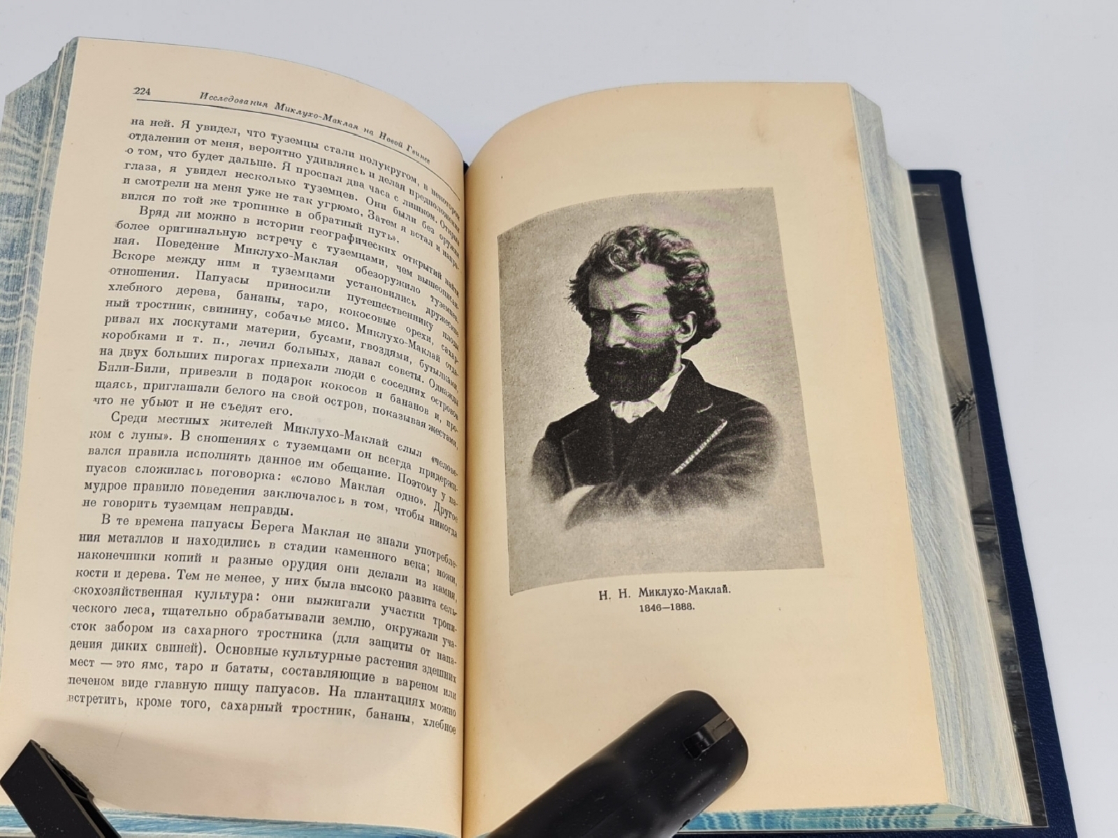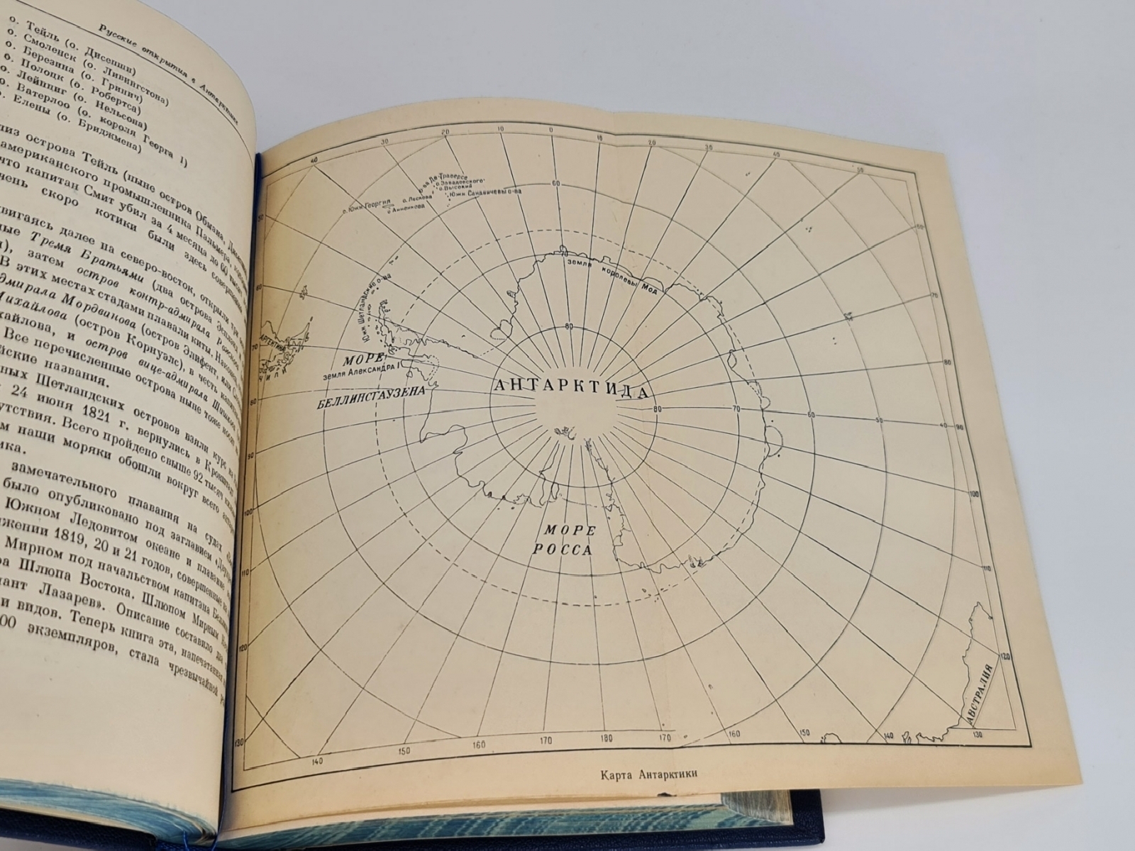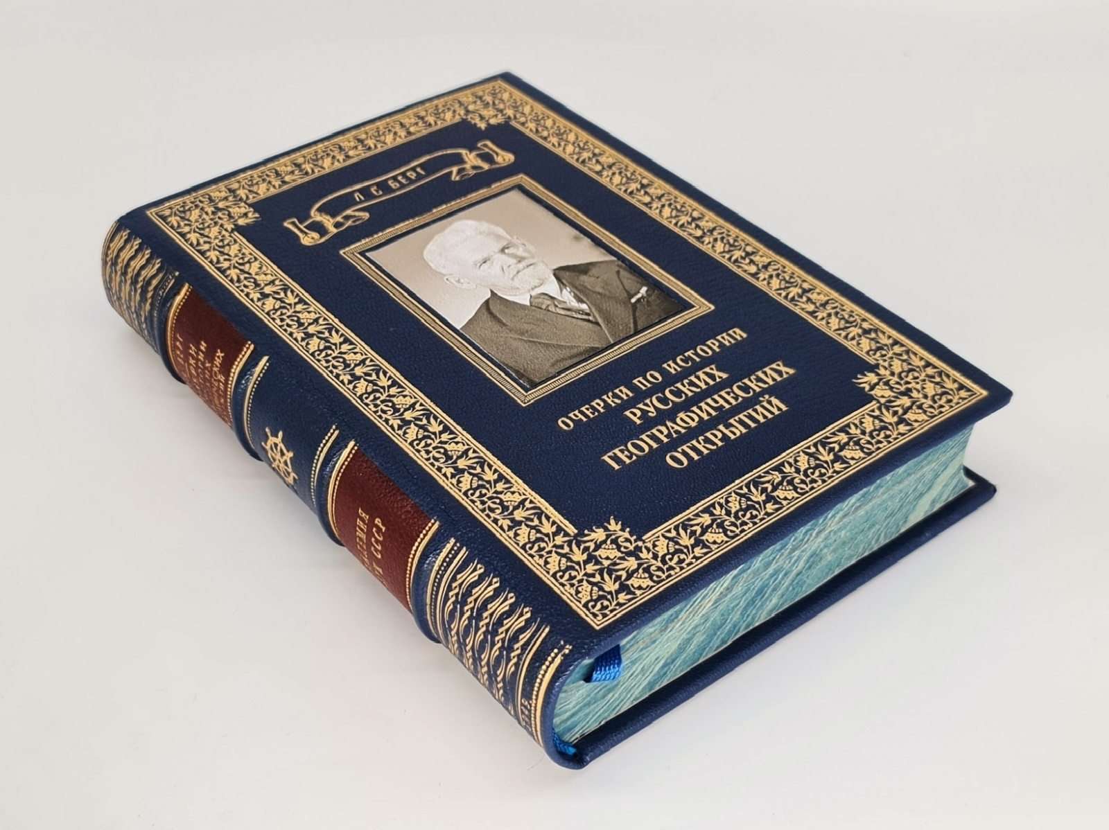 Книга в цельнокожаном переплете с инкрустированной вставкой на верхней крышке. Красивое золотое художественное тиснение. Декоративный обрез. Форзацы - "фрегат в шторме". Книга отлично проиллюстрирована заставками, рисунками в тексте, картами, портретами выдающих русских путешественников. Очень интересное издание. Формат: 22х15,5 см., 466 стр. Состояние отличное.