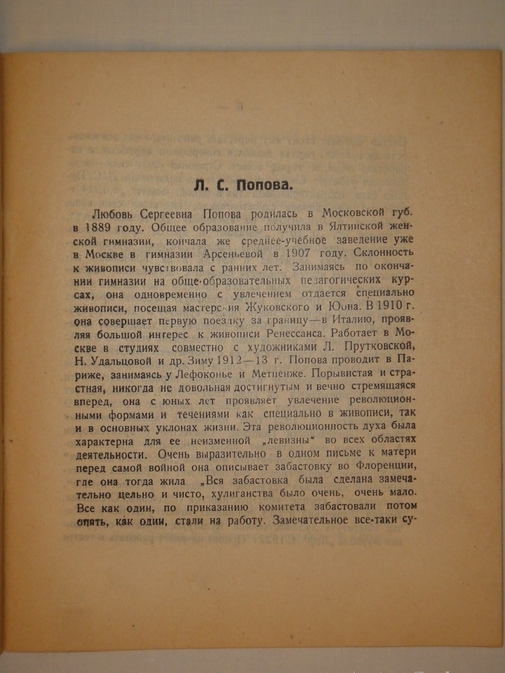 Сборник состоит из титульного листа; страничного портрета художницы на фоне её полотен; краткой биографической справки, подписанной " П ", и вступительной статьи Осипа Брика " Художник-конструктор книги Л.С.Попова: Художник. - Наследство. - У могилы ".
