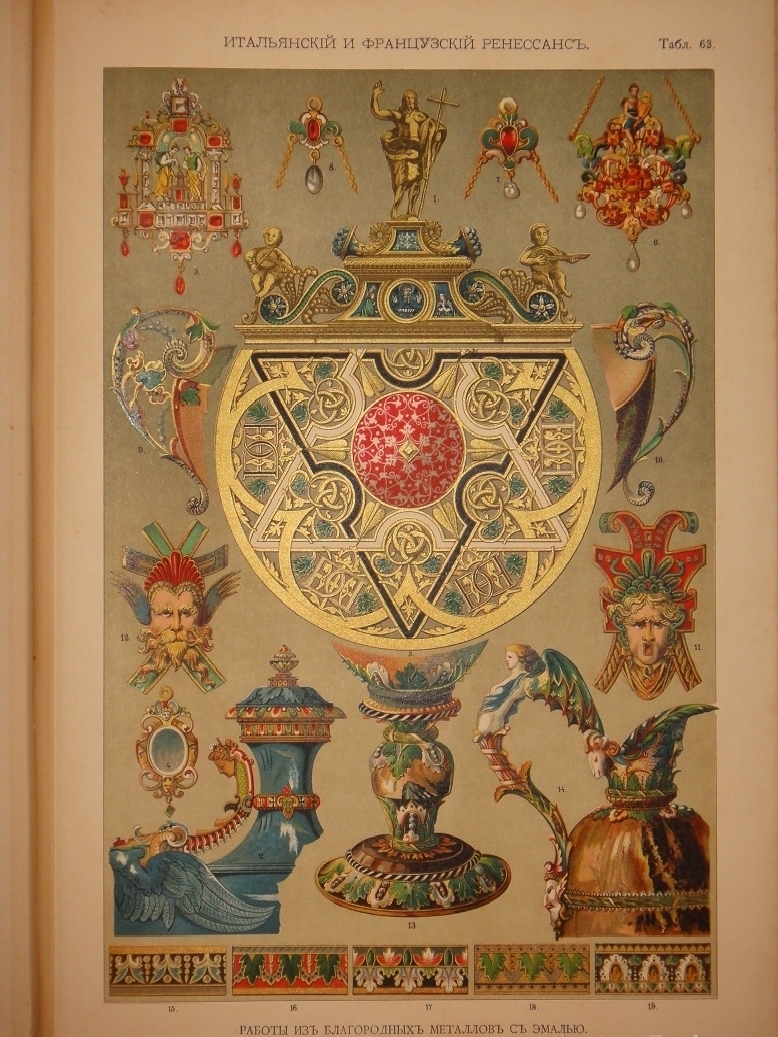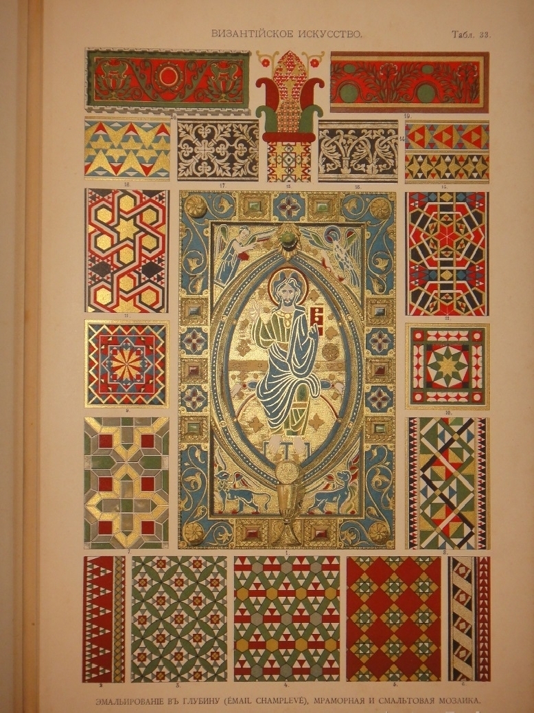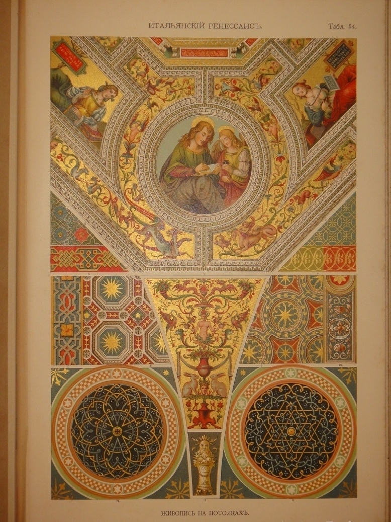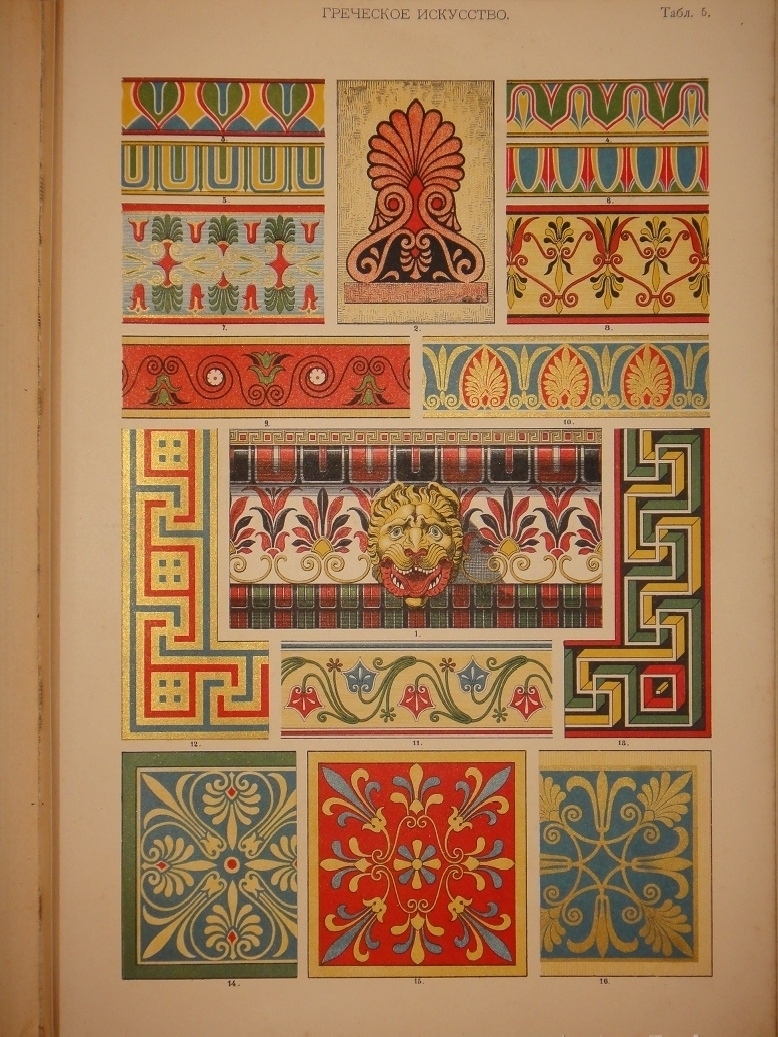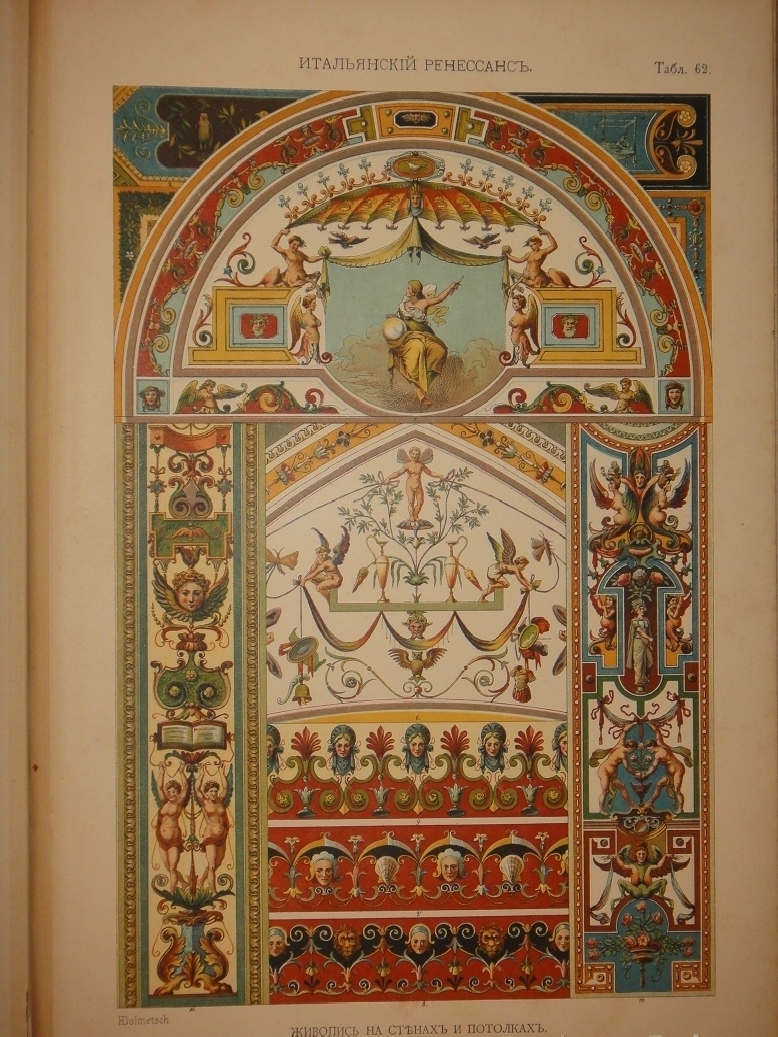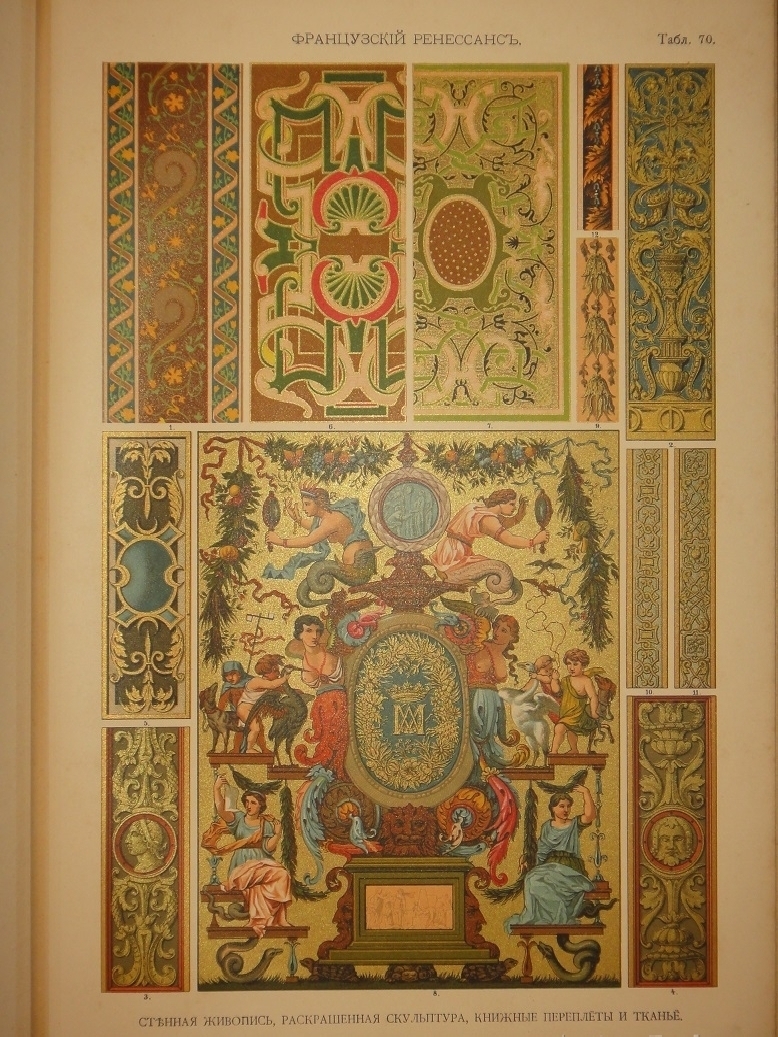 Египетское искусство ( Живопись, архитектура и пластика ). - Ассирийское искусство ( Живопись, раскрашенная скульптура и керамика ). - Греческое искусство ( Архитектура, скульптура, орнаментика. Полихромия в архитектуре. Керамика ). - Римское искусство ( Архитектура, скульптура, орнаментика. Мозаичные полы ). - Помпейское искусство ( Стенная живопись и расписанные штукатурные украшения. Металлические работы ). - Китайское искусство ( Живопись, тканьё, вышивание и перегородчатая эмаль ). - Японское искусство ( Лаковая живопись. Тканьё, живопись и перегородчатая эмаль ). - Индийское искусств ( Металлические работы. Вышивание, тканьё, плетение и лаковая живопись. Обработка столбов и мраморные вставки ). - Персидское искусство ( Архитектура, керамика, тканьё и живопись в манускриптах. Металлические работы ). - Персидско-арабское искусство ( Облицовка стен изразцами ). - Арабское искусство ( Тканьё, вышивание и живопись. Деревянные, металлические и каменные украшения. Живопись в манускриптах ). - Арабско-мавританское искусство ( Архитектурные украшения. Мозаичные и изразцовые работы ). - Мавританское искусство ( Архитектурные украшения ). - Турецкое искусство ( Архитектурные изразцовые украшения ). - Кельтическое искусство ( Живопись в манускриптах ). - Византийское искусство ( Смальтовая мозаика, эмалевая живопись и живопись в манускриптах. Эмальирование в глубину, мраморная и смальтовая мозаика. Тканьё и вышивание ). - Русское искусство ( Живопись в манускриптах. Архитектурные украшения и резьба из дерева. Эмаль, майолика, стенная и плафонная живопись и лакированные работы на дереве ). - Северное искусство ( Резьба из дерева ). - Византийское и романское искусство ( Архитектура и скульптура ). - Романское искусство ( Живопись в манускриптах и эмаль. Стенная живопись ). - Романско-готическое искусство ( Живопись на стекле. Обработка полов ). - Готическое искусство ( Мозаика из дерева. Живопись на стекле. Архитектура, скульптура и орнаментика. Тканьё, вышивание, раскрашенная скульптура и эмаль. Живопись на манускриптах. Стенная и плафонная живопись ). - Итальянский Ренессанс ( Живопись на стекле. Фаянсовые изразцы. Живопись на фасадах. Интарсиатура. Стенная и плафонная живопись. Техника кружев. Вышивание и тканьё ковров. Сграффито, мраморные вставки и плоские рельефы. Живопись в манускриптах, тканьё и мраморная мозаика. Живопись-майолика. Пластические ( рельефные ) орнаменты из мрамора и бронзы ). - Итальянский и французский Ренессанс ( Работы из драгоценных металлов с эмалью ). - Французский Ренессанс ( Украшения типографского искусства. Модульное печатание и вышивание. Ковровоподобная живопись. Пластические украшения из камня и дерева. Плафонная живопись. Тканьё, вышивание и книжные переплёты. Стенная живопись, разрисованная скульптура. Гобеленовое тканьё. Эмалевая живопись на металле, живопись на фаянсе и металлические инкрустации ). - Французский и немецкий Ренессанс ( Плоские орнаменты различных техник ). - Немецкий Ренессанс ( Стенная и плафонная живопись, интарсиатура и вышивание на полотне. Живопись на стекле. Металлические работы. Раскрашенная скульптура. Книжные переплеты. Вышивание и тканьё. Украшения типографского искусства. Разрисованная скульптура. Пластические украшения из камня и из дерева. Стенная и плафонная живопись. Картуши и работы из драг
