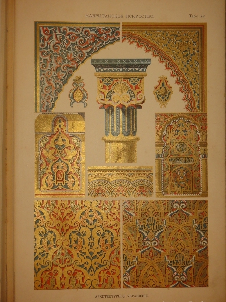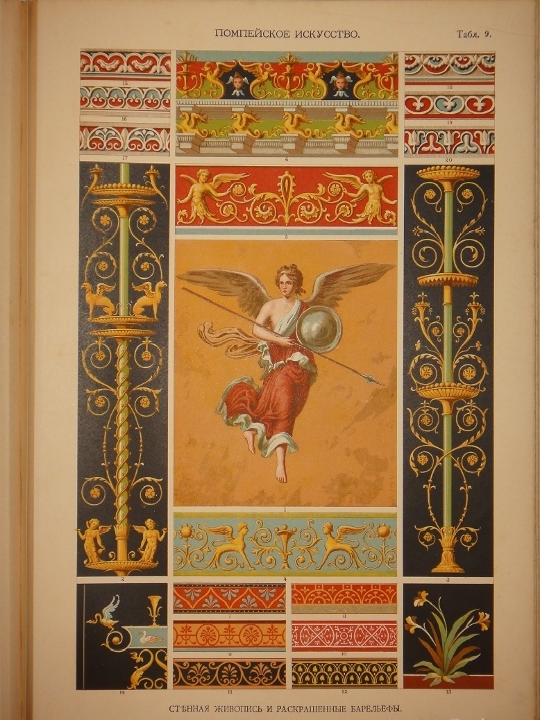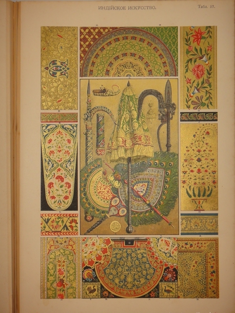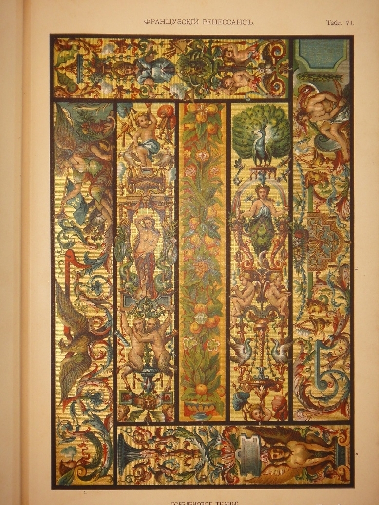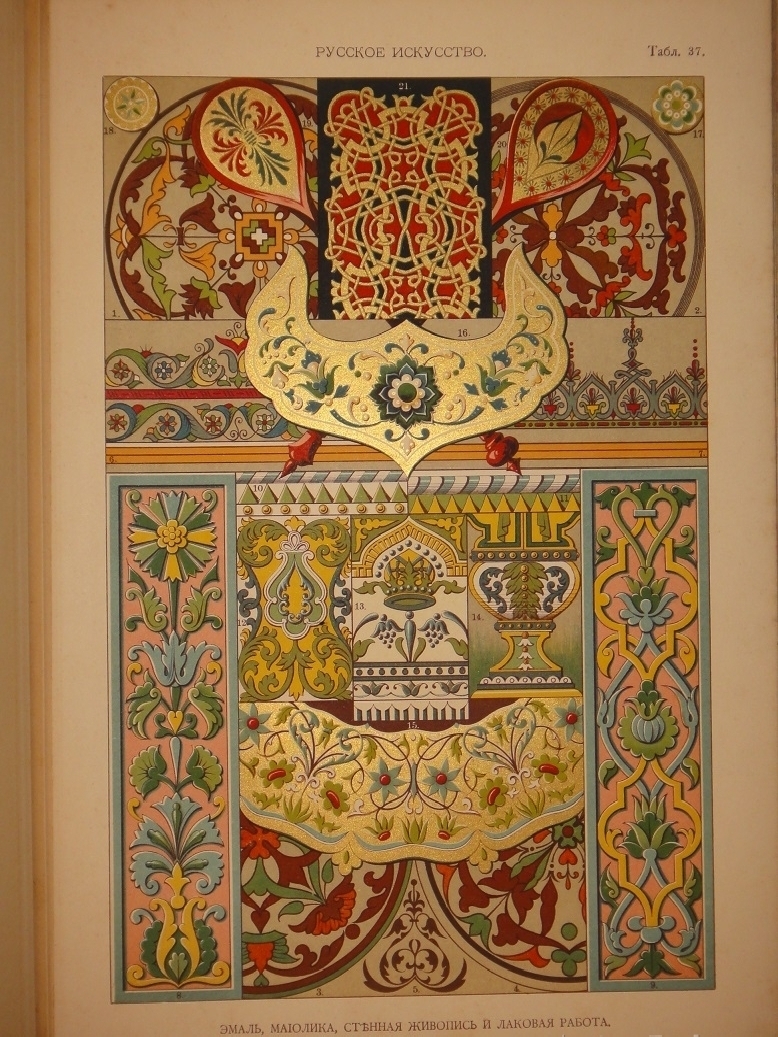 Египетское искусство ( Живопись, архитектура и пластика ). - Ассирийское искусство ( Живопись, раскрашенная скульптура и керамика ). - Греческое искусство ( Архитектура, скульптура, орнаментика. Полихромия в архитектуре. Керамика ). - Римское искусство ( Архитектура, скульптура, орнаментика. Мозаичные полы ). - Помпейское искусство ( Стенная живопись и расписанные штукатурные украшения. Металлические работы ). - Китайское искусство ( Живопись, тканьё, вышивание и перегородчатая эмаль ). - Японское искусство ( Лаковая живопись. Тканьё, живопись и перегородчатая эмаль ). - Индийское искусств ( Металлические работы. Вышивание, тканьё, плетение и лаковая живопись. Обработка столбов и мраморные вставки ). - Персидское искусство ( Архитектура, керамика, тканьё и живопись в манускриптах. Металлические работы ). - Персидско-арабское искусство ( Облицовка стен изразцами ). - Арабское искусство ( Тканьё, вышивание и живопись. Деревянные, металлические и каменные украшения. Живопись в манускриптах ). - Арабско-мавританское искусство ( Архитектурные украшения. Мозаичные и изразцовые работы ). - Мавританское искусство ( Архитектурные украшения ). - Турецкое искусство ( Архитектурные изразцовые украшения ). - Кельтическое искусство ( Живопись в манускриптах ). - Византийское искусство ( Смальтовая мозаика, эмалевая живопись и живопись в манускриптах. Эмальирование в глубину, мраморная и смальтовая мозаика. Тканьё и вышивание ). - Русское искусство ( Живопись в манускриптах. Архитектурные украшения и резьба из дерева. Эмаль, майолика, стенная и плафонная живопись и лакированные работы на дереве ). - Северное искусство ( Резьба из дерева ). - Византийское и романское искусство ( Архитектура и скульптура ). - Романское искусство ( Живопись в манускриптах и эмаль. Стенная живопись ). - Романско-готическое искусство ( Живопись на стекле. Обработка полов ). - Готическое искусство ( Мозаика из дерева. Живопись на стекле. Архитектура, скульптура и орнаментика. Тканьё, вышивание, раскрашенная скульптура и эмаль. Живопись на манускриптах. Стенная и плафонная живопись ). - Итальянский Ренессанс ( Живопись на стекле. Фаянсовые изразцы. Живопись на фасадах. Интарсиатура. Стенная и плафонная живопись. Техника кружев. Вышивание и тканьё ковров. Сграффито, мраморные вставки и плоские рельефы. Живопись в манускриптах, тканьё и мраморная мозаика. Живопись-майолика. Пластические ( рельефные ) орнаменты из мрамора и бронзы ). - Итальянский и французский Ренессанс ( Работы из драгоценных металлов с эмалью ). - Французский Ренессанс ( Украшения типографского искусства. Модульное печатание и вышивание. Ковровоподобная живопись. Пластические украшения из камня и дерева. Плафонная живопись. Тканьё, вышивание и книжные переплёты. Стенная живопись, разрисованная скульптура. Гобеленовое тканьё. Эмалевая живопись на металле, живопись на фаянсе и металлические инкрустации ). - Французский и немецкий Ренессанс ( Плоские орнаменты различных техник ). - Немецкий Ренессанс ( Стенная и плафонная живопись, интарсиатура и вышивание на полотне. Живопись на стекле. Металлические работы. Раскрашенная скульптура. Книжные переплеты. Вышивание и тканьё. Украшения типографского искусства. Разрисованная скульптура. Пластические украшения из камня и из дерева. Стенная и плафонная живопись. Картуши и работы из драг