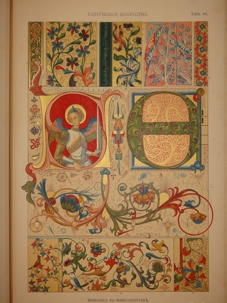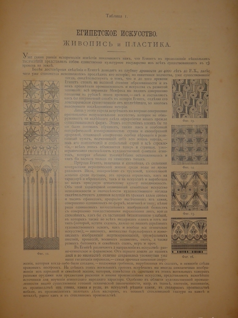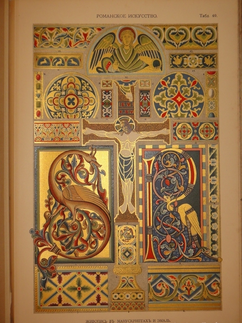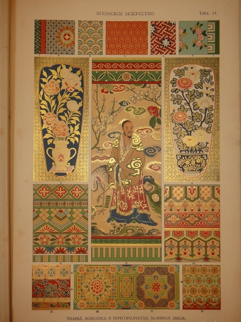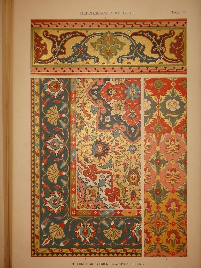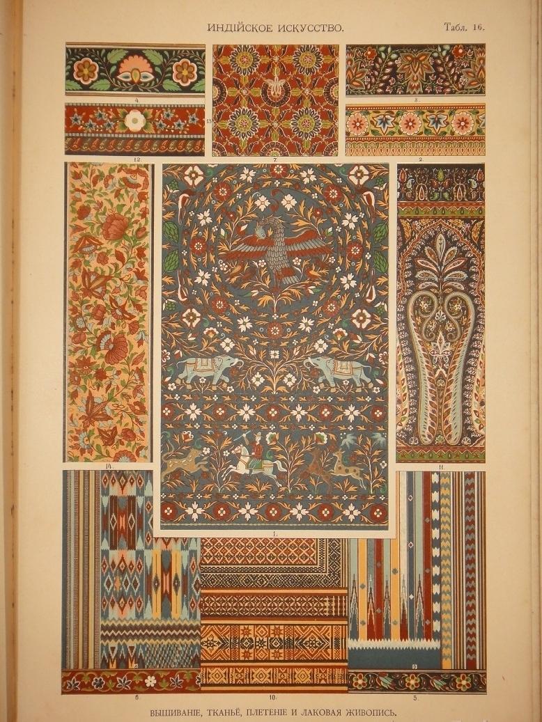 Египетское искусство ( Живопись, архитектура и пластика ). - Ассирийское искусство ( Живопись, раскрашенная скульптура и керамика ). - Греческое искусство ( Архитектура, скульптура, орнаментика. Полихромия в архитектуре. Керамика ). - Римское искусство ( Архитектура, скульптура, орнаментика. Мозаичные полы ). - Помпейское искусство ( Стенная живопись и расписанные штукатурные украшения. Металлические работы ). - Китайское искусство ( Живопись, тканьё, вышивание и перегородчатая эмаль ). - Японское искусство ( Лаковая живопись. Тканьё, живопись и перегородчатая эмаль ). - Индийское искусств ( Металлические работы. Вышивание, тканьё, плетение и лаковая живопись. Обработка столбов и мраморные вставки ). - Персидское искусство ( Архитектура, керамика, тканьё и живопись в манускриптах. Металлические работы ). - Персидско-арабское искусство ( Облицовка стен изразцами ). - Арабское искусство ( Тканьё, вышивание и живопись. Деревянные, металлические и каменные украшения. Живопись в манускриптах ). - Арабско-мавританское искусство ( Архитектурные украшения. Мозаичные и изразцовые работы ). - Мавританское искусство ( Архитектурные украшения ). - Турецкое искусство ( Архитектурные изразцовые украшения ). - Кельтическое искусство ( Живопись в манускриптах ). - Византийское искусство ( Смальтовая мозаика, эмалевая живопись и живопись в манускриптах. Эмальирование в глубину, мраморная и смальтовая мозаика. Тканьё и вышивание ). - Русское искусство ( Живопись в манускриптах. Архитектурные украшения и резьба из дерева. Эмаль, майолика, стенная и плафонная живопись и лакированные работы на дереве ). - Северное искусство ( Резьба из дерева ). - Византийское и романское искусство ( Архитектура и скульптура ). - Романское искусство ( Живопись в манускриптах и эмаль. Стенная живопись ). - Романско-готическое искусство ( Живопись на стекле. Обработка полов ). - Готическое искусство ( Мозаика из дерева. Живопись на стекле. Архитектура, скульптура и орнаментика. Тканьё, вышивание, раскрашенная скульптура и эмаль. Живопись на манускриптах. Стенная и плафонная живопись ). - Итальянский Ренессанс ( Живопись на стекле. Фаянсовые изразцы. Живопись на фасадах. Интарсиатура. Стенная и плафонная живопись. Техника кружев. Вышивание и тканьё ковров. Сграффито, мраморные вставки и плоские рельефы. Живопись в манускриптах, тканьё и мраморная мозаика. Живопись-майолика. Пластические ( рельефные ) орнаменты из мрамора и бронзы ). - Итальянский и французский Ренессанс ( Работы из драгоценных металлов с эмалью ). - Французский Ренессанс ( Украшения типографского искусства. Модульное печатание и вышивание. Ковровоподобная живопись. Пластические украшения из камня и дерева. Плафонная живопись. Тканьё, вышивание и книжные переплёты. Стенная живопись, разрисованная скульптура. Гобеленовое тканьё. Эмалевая живопись на металле, живопись на фаянсе и металлические инкрустации ). - Французский и немецкий Ренессанс ( Плоские орнаменты различных техник ). - Немецкий Ренессанс ( Стенная и плафонная живопись, интарсиатура и вышивание на полотне. Живопись на стекле. Металлические работы. Раскрашенная скульптура. Книжные переплеты. Вышивание и тканьё. Украшения типографского искусства. Разрисованная скульптура. Пластические украшения из камня и из дерева. Стенная и плафонная живопись. Картуши и работы из драг