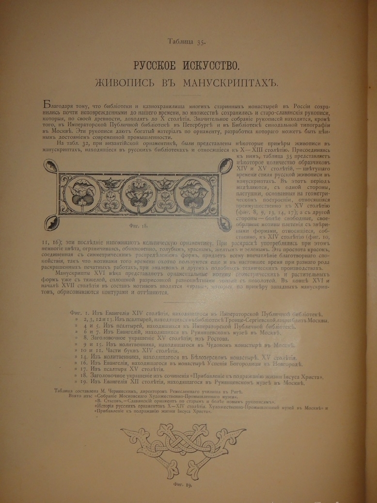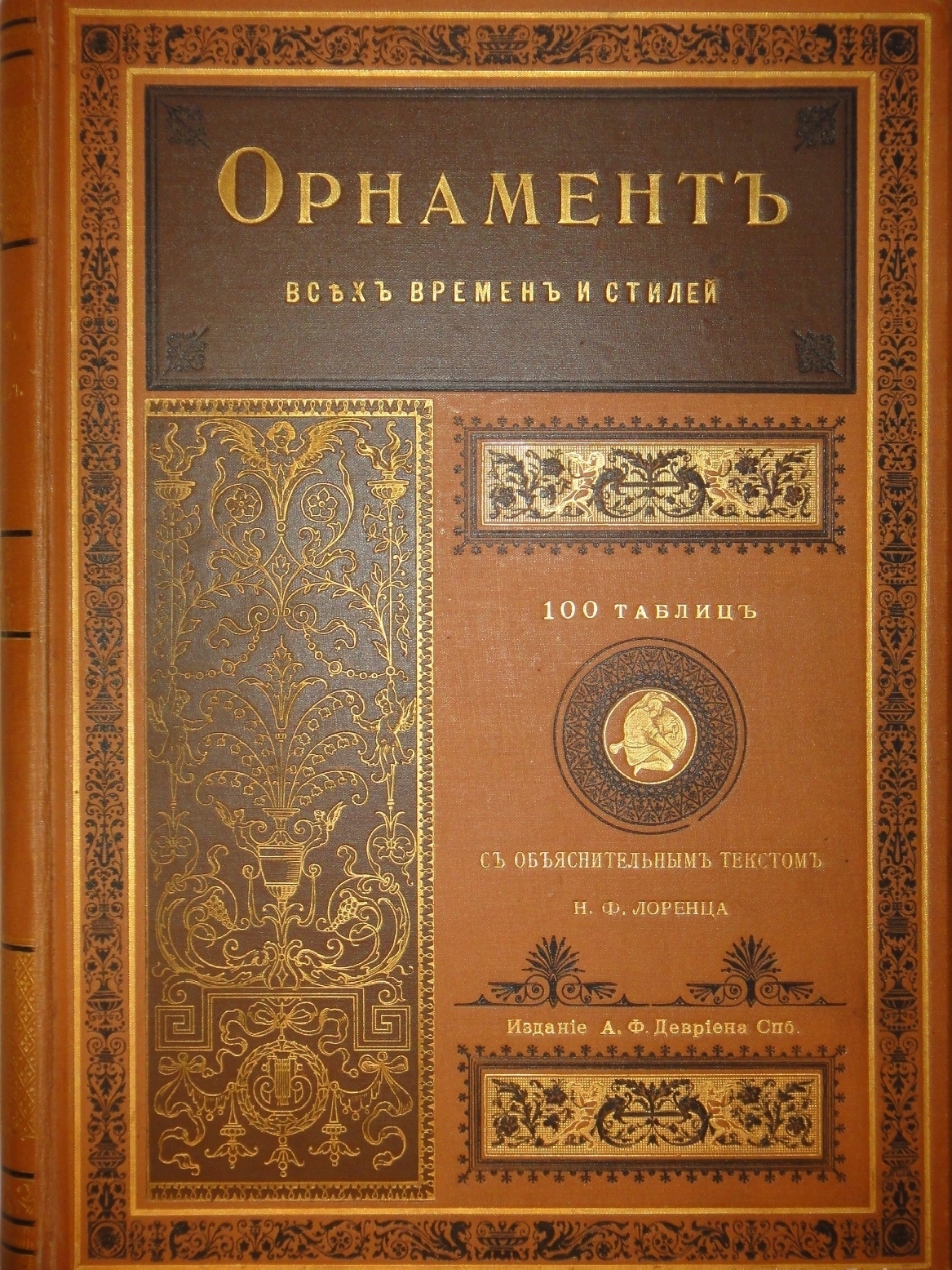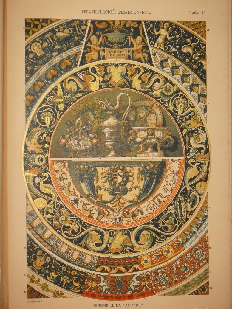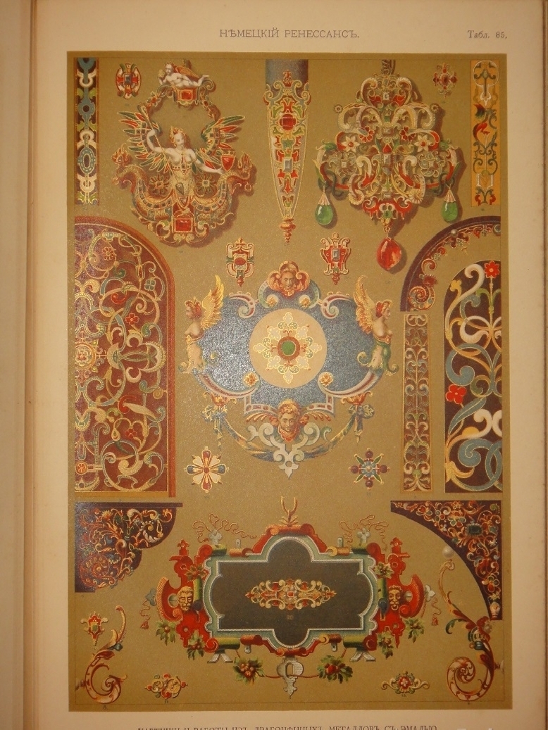 Сто хромолитографированных таблиц орнаментальных образцов всех художественных эпох дополнены подробными объяснениями выпускника Императорской Академии Художеств, выдающегося исследователя искусства и талантливого иллюстратора Николая Фёдоровича Лоренца ( 1863-1921 ). Хромолитографии высочайшего качества с сильными и сочными оттисками.