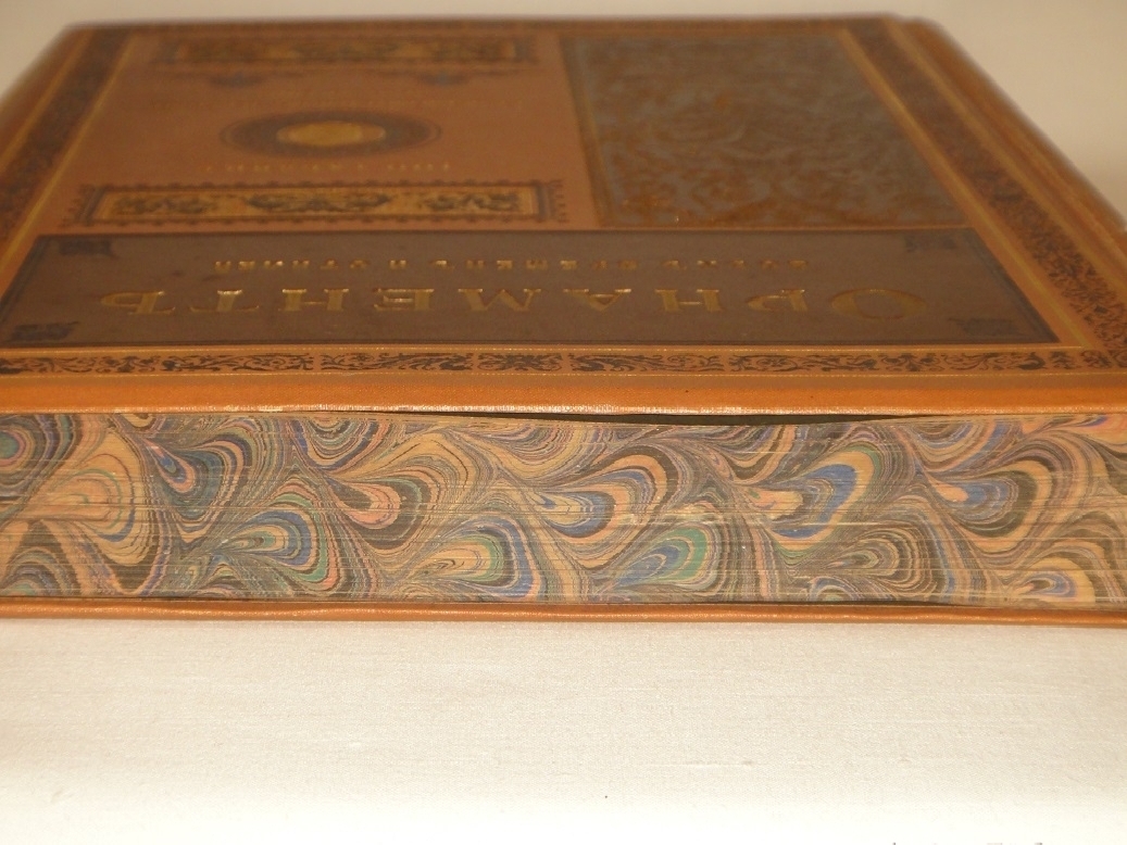Экземпляр в роскошном издательском цельноколенкоровом переплёте работы одного из лучших мастеров переплётного искусства царской России, Поставщика Двора Его Императорского Величества Отто Кирхнера. Круглёный корешок и передняя крышка украшены богатым золотым и цветным высокохудожественным орнаментальным тиснением. Задняя - обрамлена блинтовыми линейными рамками с изящной узорной композицией в среднике и клеймом знаменитого переплётчика.