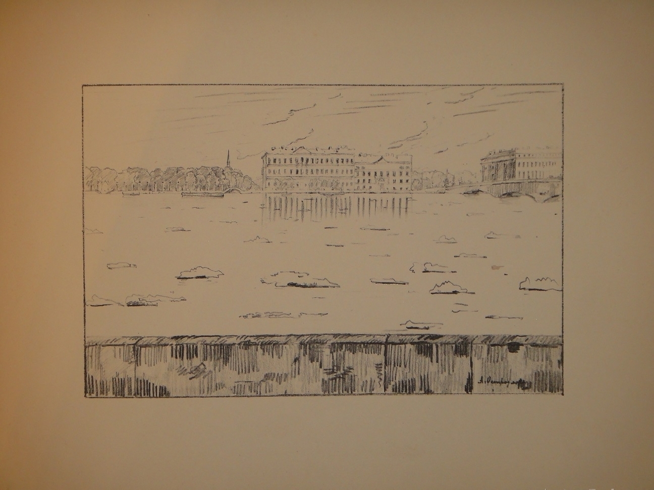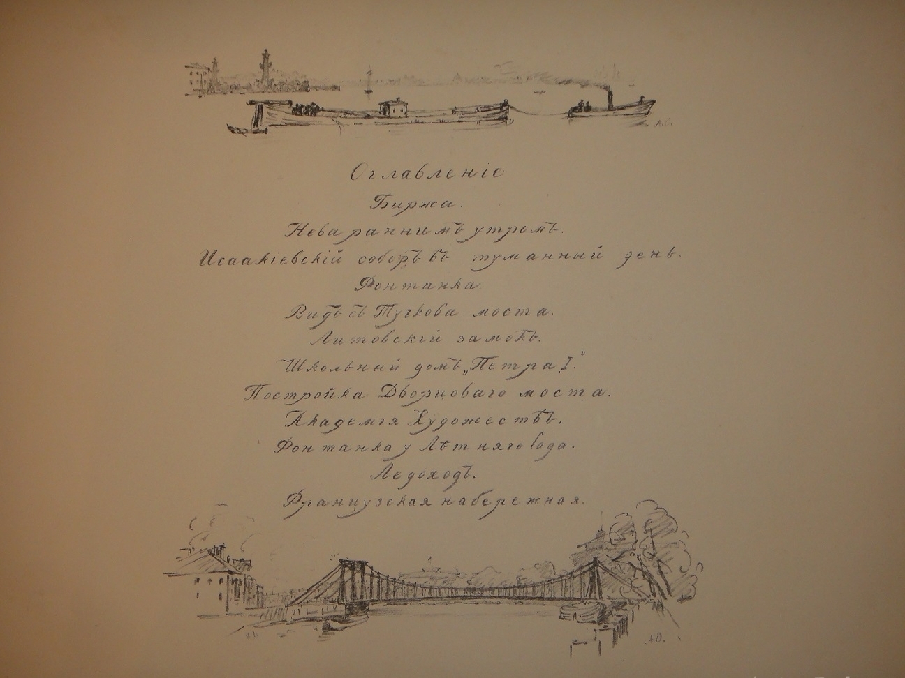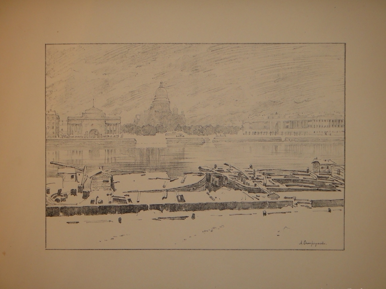 Литографированный титульный лист и лист оглавления. 12 автолитографий Петербурга: Биржа, - Нева ранним утром, - Исаакиевский собор в туманный день, - Фонтанка, - Вид с Тучкова моста, - Литовский замок, - Школьный дом Петра I, - Постройка Дворцового моста, - Академия Художеств, - Фонтанка у Летнего сада, - Ледоход, - Французская набережная.
