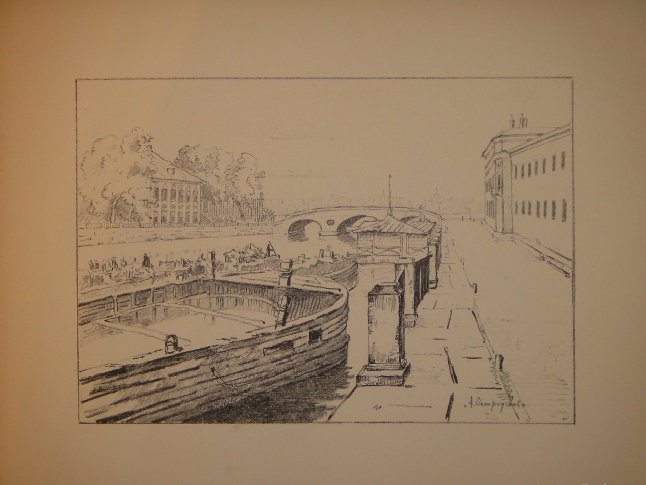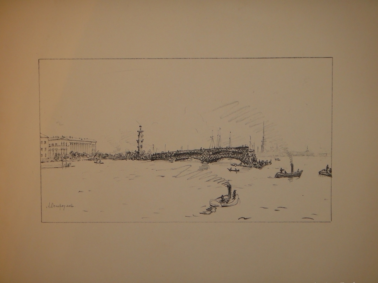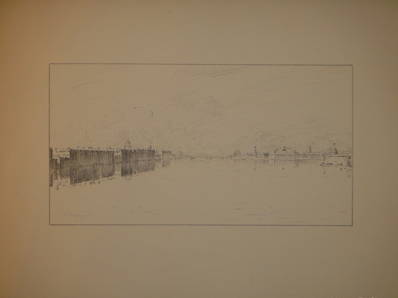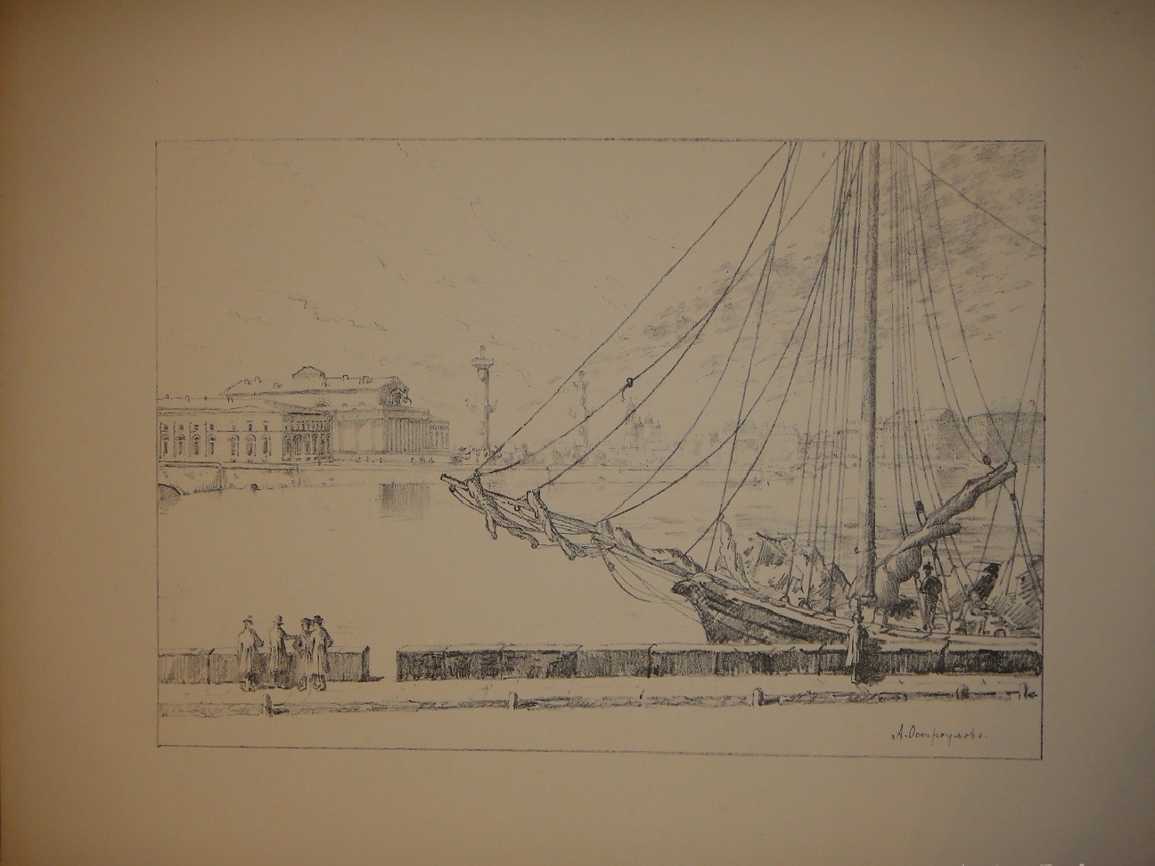 Литографированный титульный лист и лист оглавления. 12 автолитографий Петербурга: Биржа, - Нева ранним утром, - Исаакиевский собор в туманный день, - Фонтанка, - Вид с Тучкова моста, - Литовский замок, - Школьный дом Петра I, - Постройка Дворцового моста, - Академия Художеств, - Фонтанка у Летнего сада, - Ледоход, - Французская набережная.