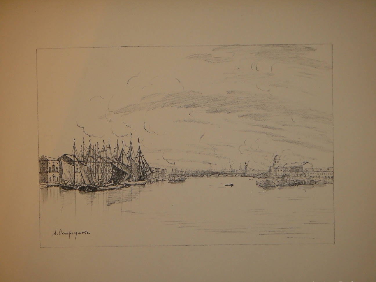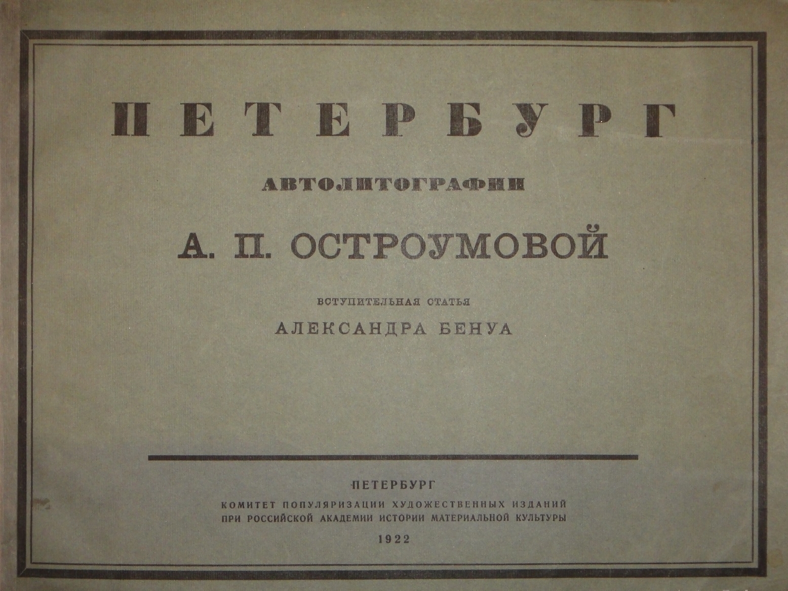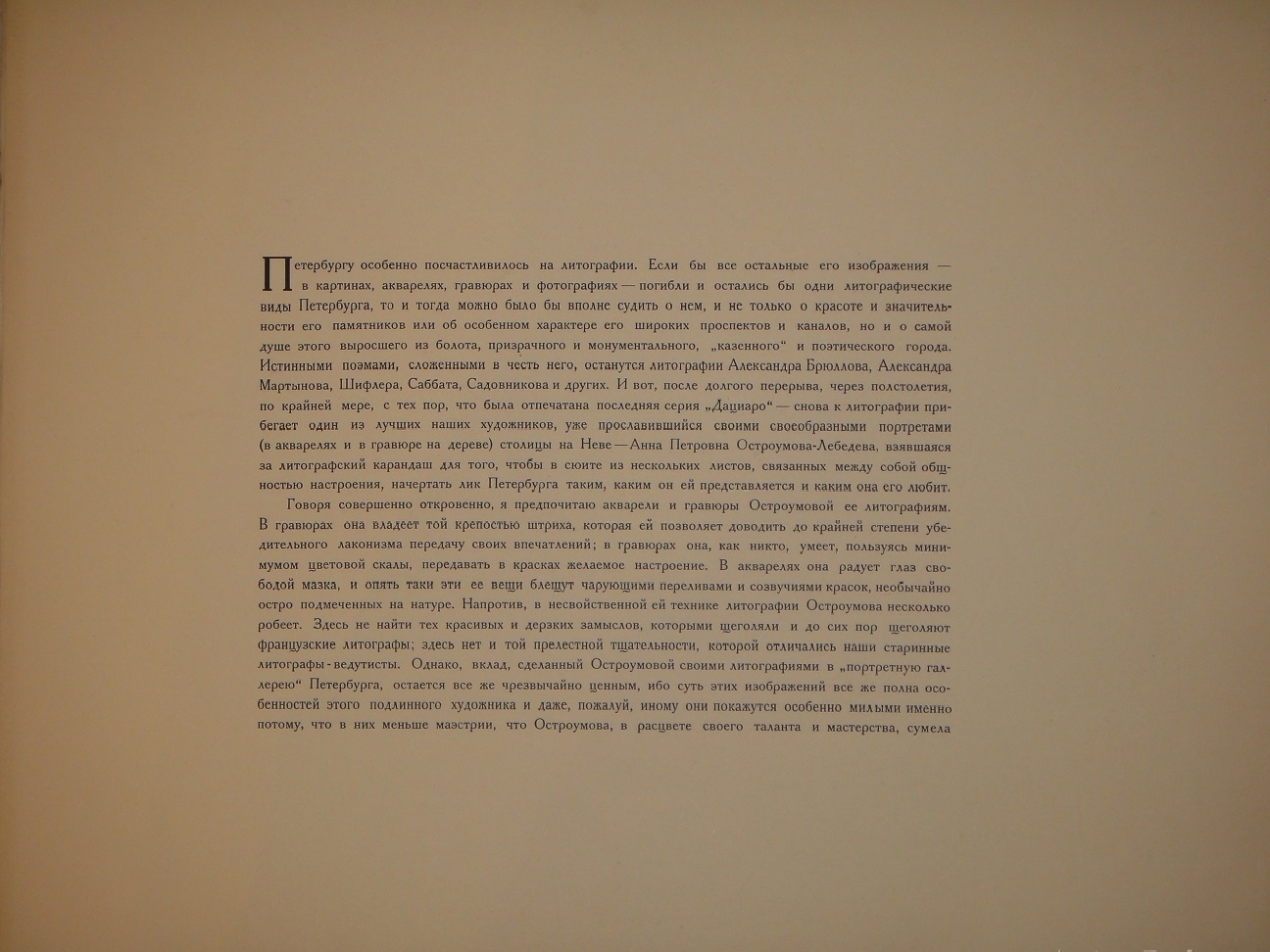 Александр Бенуа: " Петербургу особенно посчастливилось на литографии. Если бы все остальные его изображения - в картинах, акварелях, гравюрах и фотографиях - погибли и остались бы одни литографические виды Петербурга, то и тогда можно было бы вполне судить о нем, и не только о красоте и значительности его памятников или об особенном характере его широких проспектов и каналов, но и о самой душе этого выросшего из болота, призрачного и монументального, " казенного " и поэтического города. Истинными поэмами, сложенными в честь него, останутся литографии Александра Брюллова, Александра Мартынова, Шифлера, Саббата, Садовникова и других. И вот, после долгого перерыва, через полстолетия, по крайней мере, с тех пор, что была отпечатана последняя серия " Дациаро " - снова к литографии прибегает один из лучших наших художников, уже прославившийся своими своеобразными портретами ( в акварелях и в гравюре на дереве ) столицы на Неве - Анна Петровна Остроумова-Лебедева, взявшаяся за литографский карандаш для того, чтобы в сюите из нескольких листов, связанных между собой общностью настроения, начертать лик Петербурга таким, каким он ей представляется и каким она его любит.