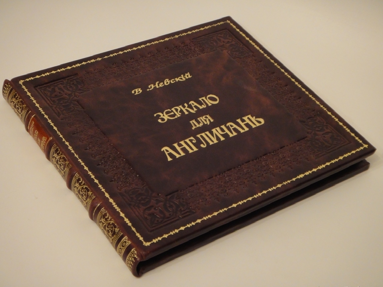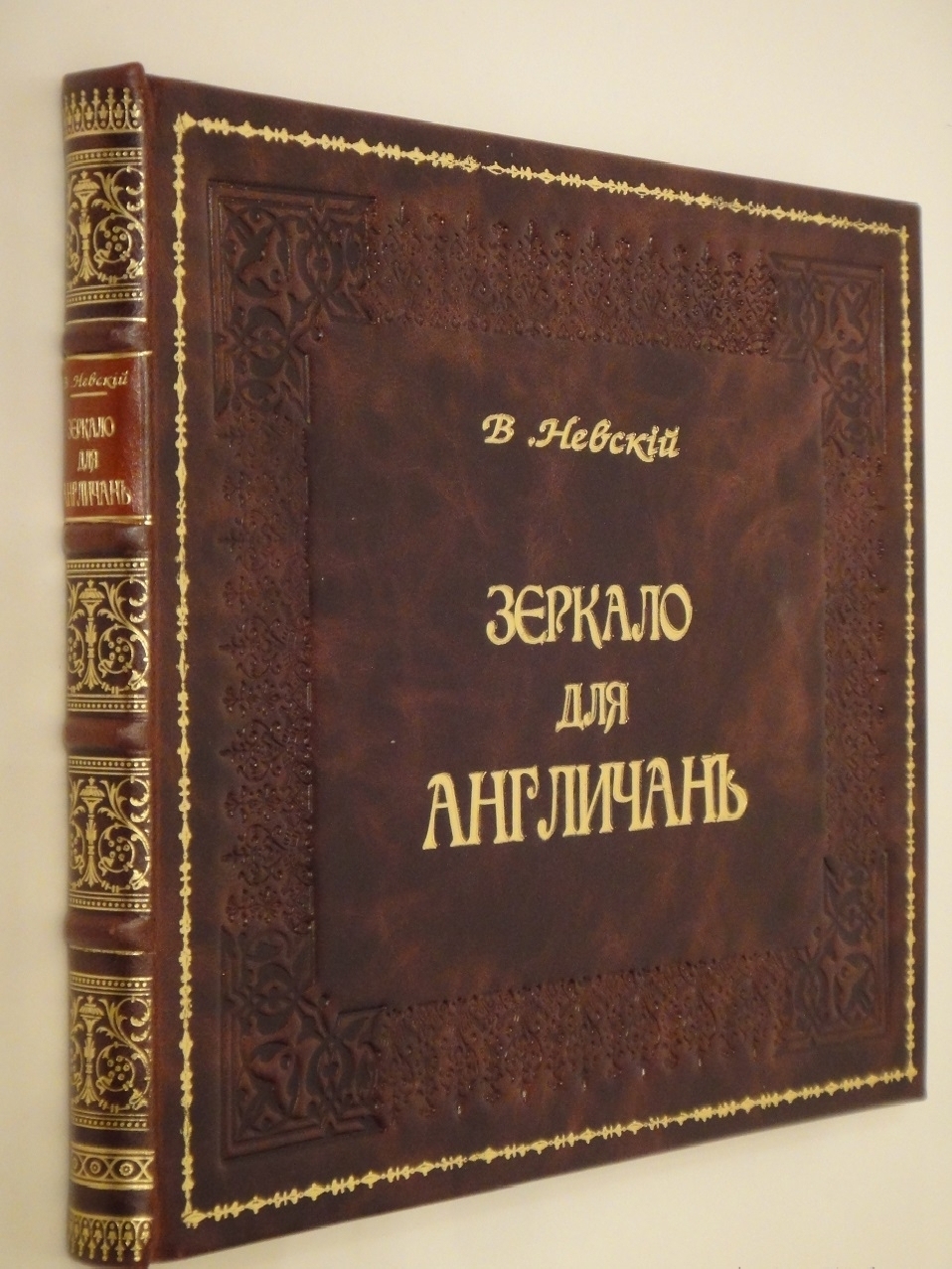 Экземпляр в красивом современном цельнокожаном переплёте с золотым художественным тиснением на бинтовом корешке и контрастной декоративной вставке. Крышки обрамлены симметричными орнаментальными конгревными рамками. В центральной части передней крышки - золототиснёная надпись: В.Невскiй. Зеркало для англичанъ. Задняя - украшена оригинальной узорной композицией.