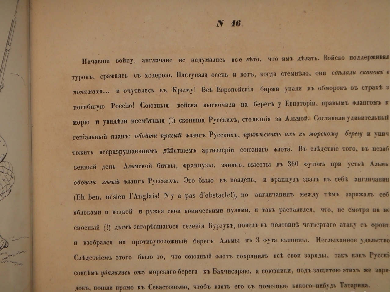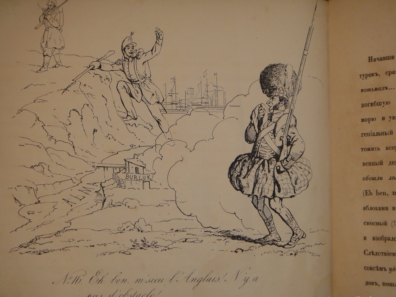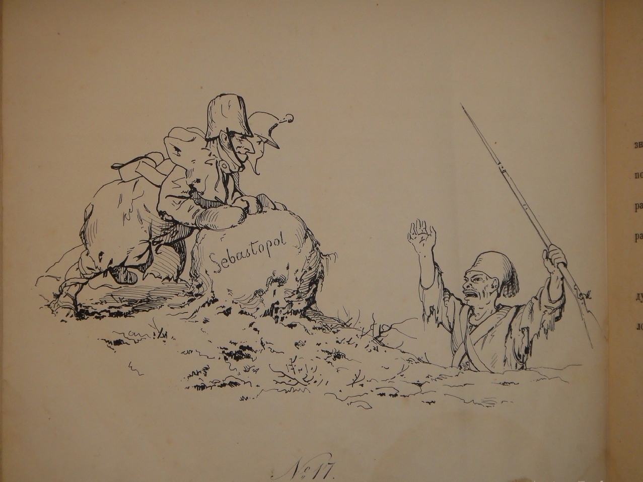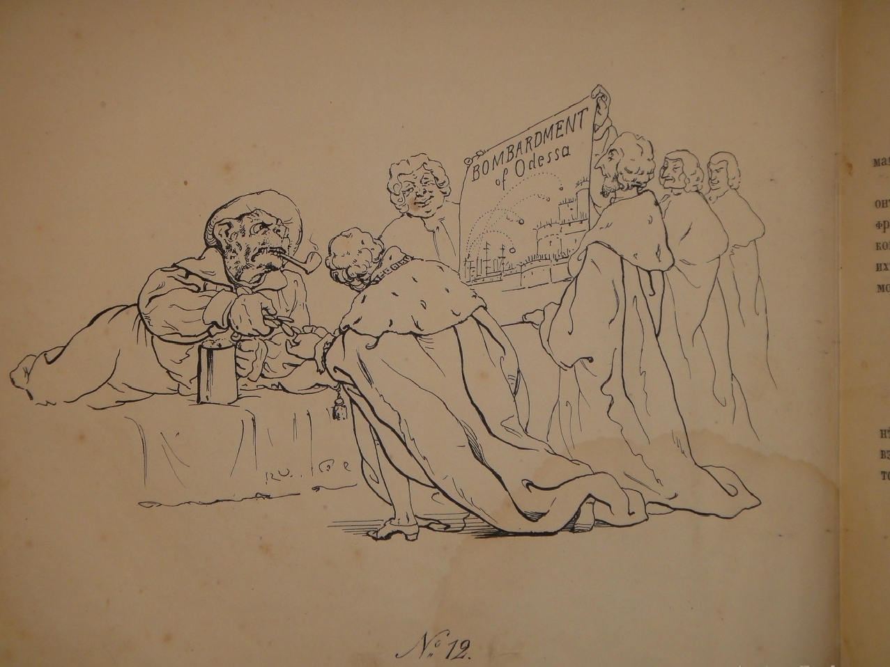 В России Крымская война также оказала огромное влияние на общественные настроения, литературу, искусство. Появились патриотические произведения писателей и поэтов. Художники откликнулись на события созданием гравюр и литографий. Авторы избрали действенное оружие - иронию, где высмеивали наших врагов, прославляли подвиги русских солдат, поднимали боевой дух и настраивали на победу. В 1855 году году вышел первый альбом карикатур на Крымскую войну одного из лучших российских книжных графиков второй половины XIX века Петра Михайловича Боклевского. Альбом носил название " На нынешнюю войну " и состоял из семи литографий. Этот альбом имел огромный успех, особенно рисунок, изображавший премьер-министра Великобритании Пальмерстона под сапогом русского солдата. Карикатуры эти очень понравились только что вступившему на престол Императору Александру II, который наградил Боклевского бриллиантовым перстнем.