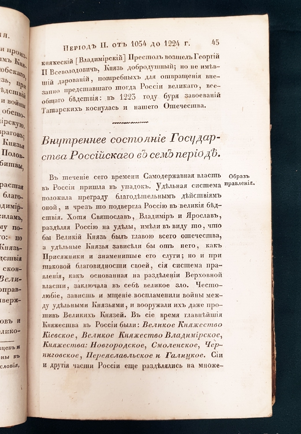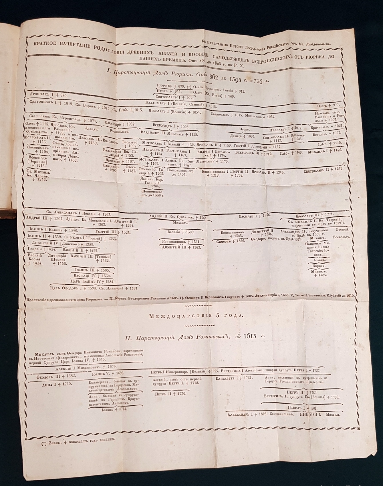 В полукожаном переплете эпохи. [6], X, 444, [4] стр. Формат 20,8х13,5х2,5 см. Раскладная таблица «Краткое начертание древних князей и вообще самодержцев всероссийских от Рюрика до наших времен».