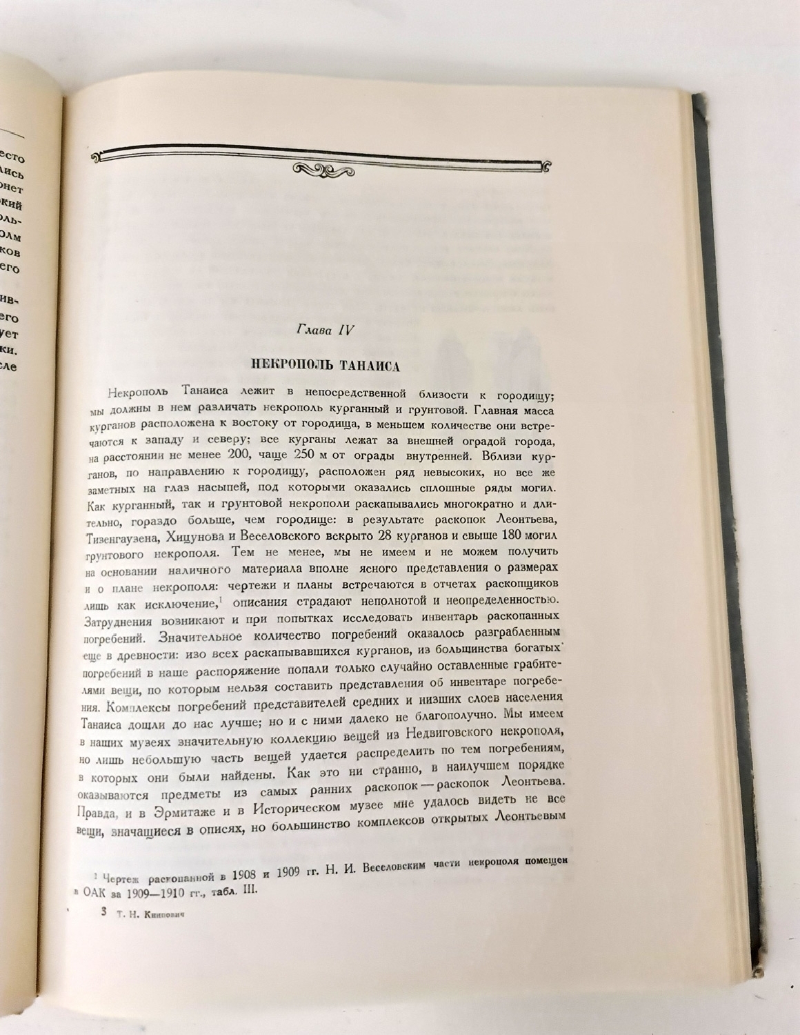 Выдающиеся успехи советской археологической науки в исследовании античных городищ нашего юга и культуры народов, населявших Северное Причерноморье в античную эпоху, вызвали потребность в обобщающих работах по истории отдельных городских центров и целых государств, существовавших на северном берегу Понта в то время. Неслучайно поэтому появление в последнее время таких работ, как «Херсонес Таврический» Г. Д. Белова и «Боспорское царство» В. Ф. Гайдукевича. Рассматриваемая монография Т. Н. Книпович «Танаис», посвященная одному из крупных торговых центров Северного Причерноморья античного времени, должна, по мысли автора, принадлежать «к числу работ сходного типа».
