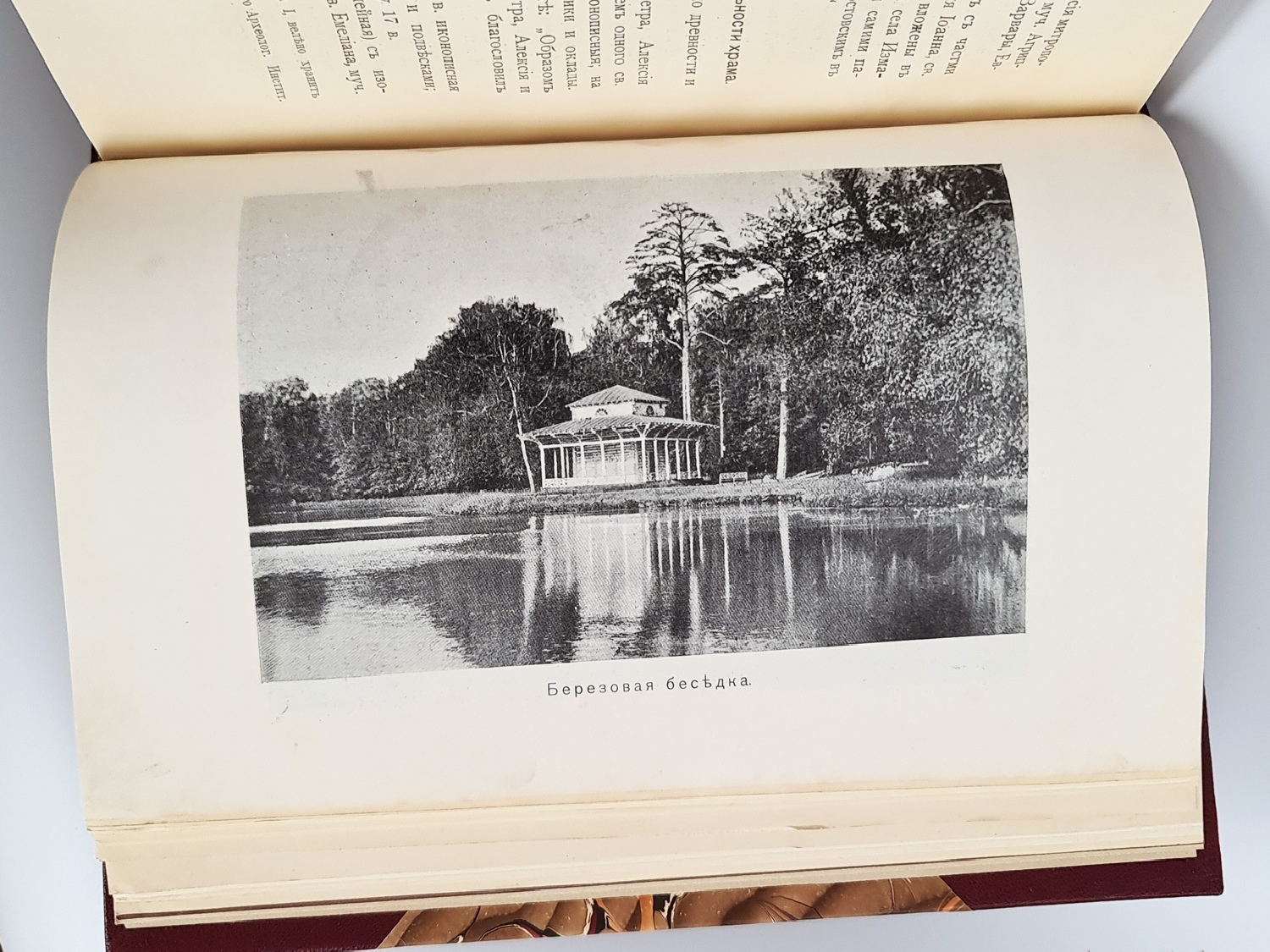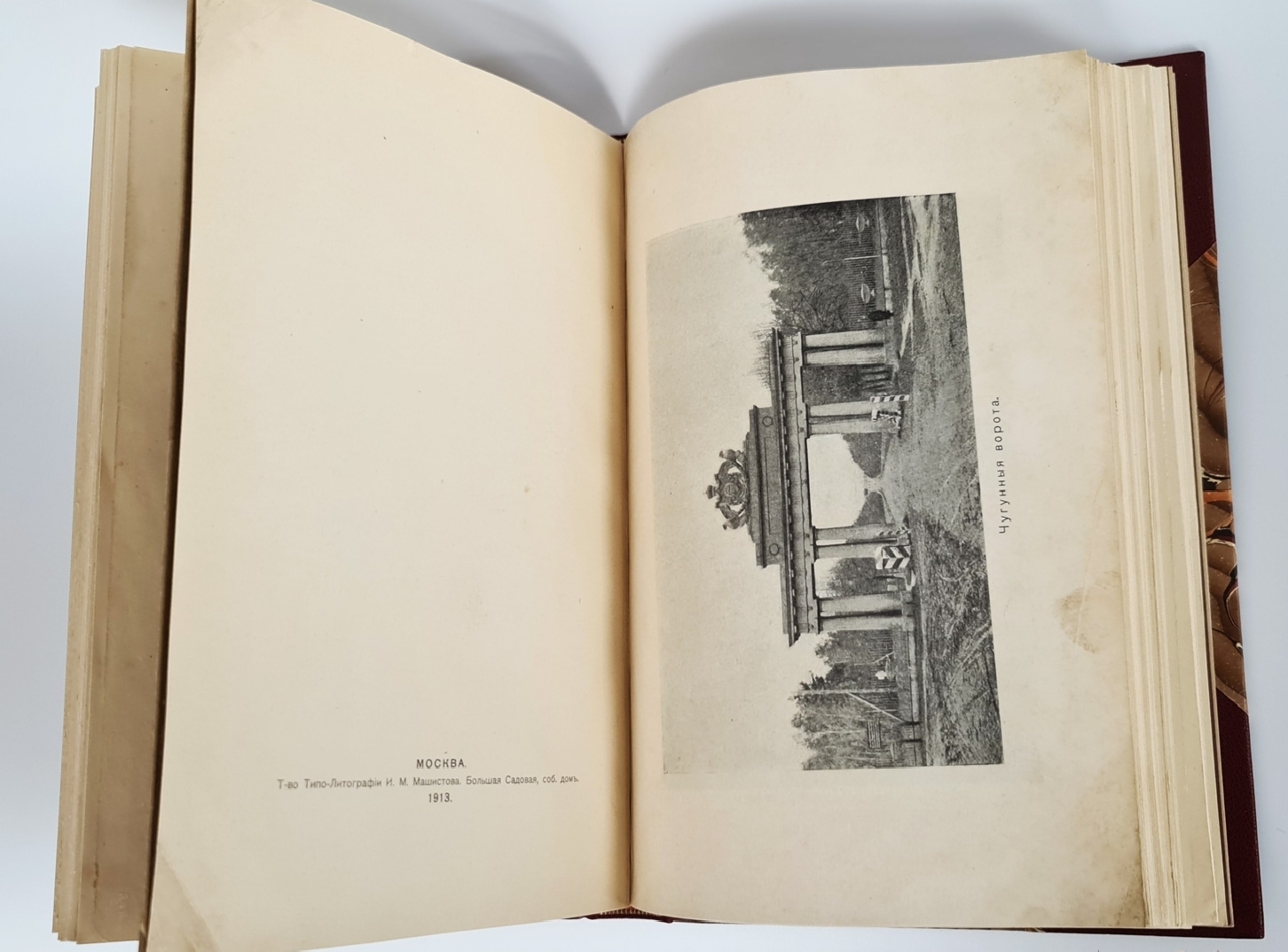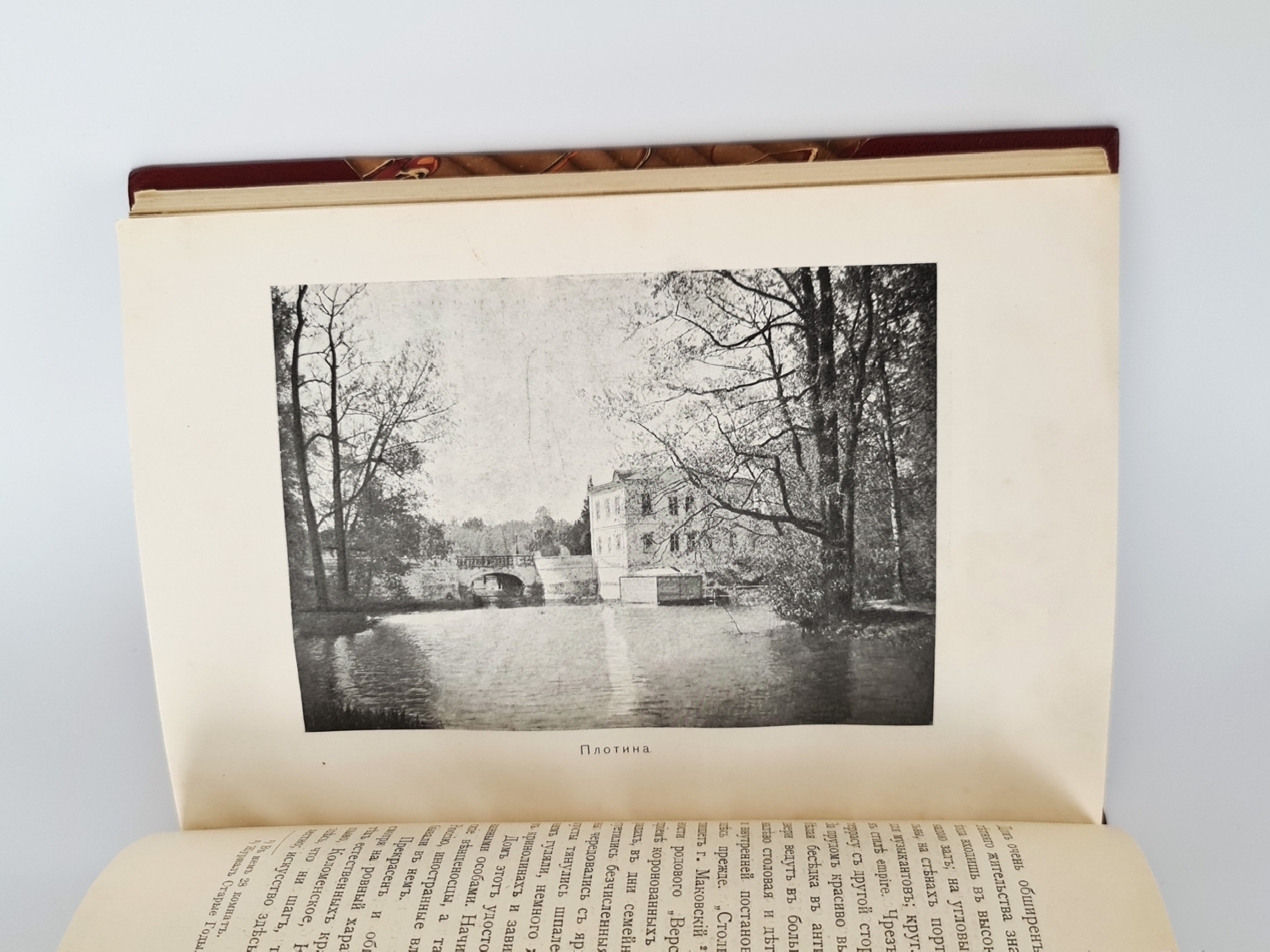 Описания знаменитых усадеб 18 - 19 веков. В конволюте. В полукожаном бордовом "французском" переплете, с "бинтами" и тиснением по корешку. Формат: 25,5x17,5 см. Состояние отличное.