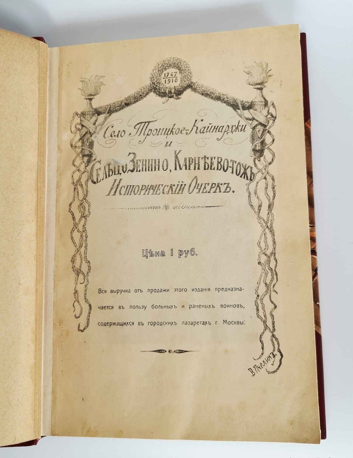 Село Троицкое-Карнаджи некогда принадлежало Петру Александровичу Румянцеву. Книга написана последним владельцем части села Троицкое-Карнаджи, имения Зенино. Все средства от продажи книг предназначались в пользу больных и раненых воинов. Среди опубликованных фотографий - фотопортрет Н.И. Гучкова. Издание времён Первой мировой войны.