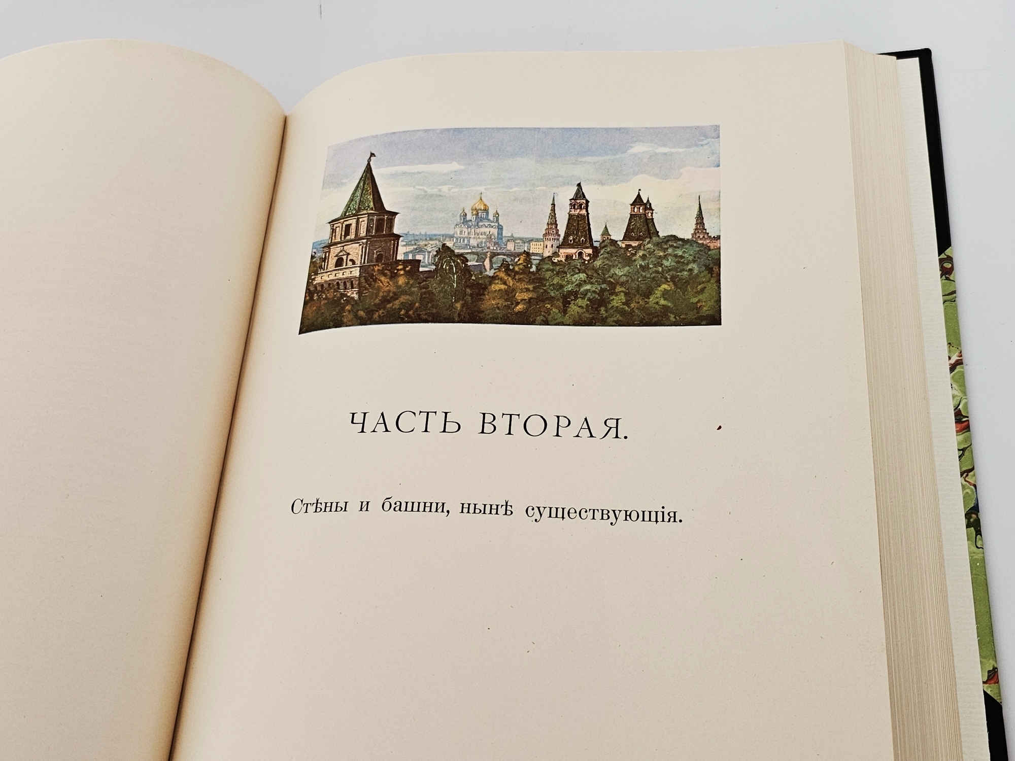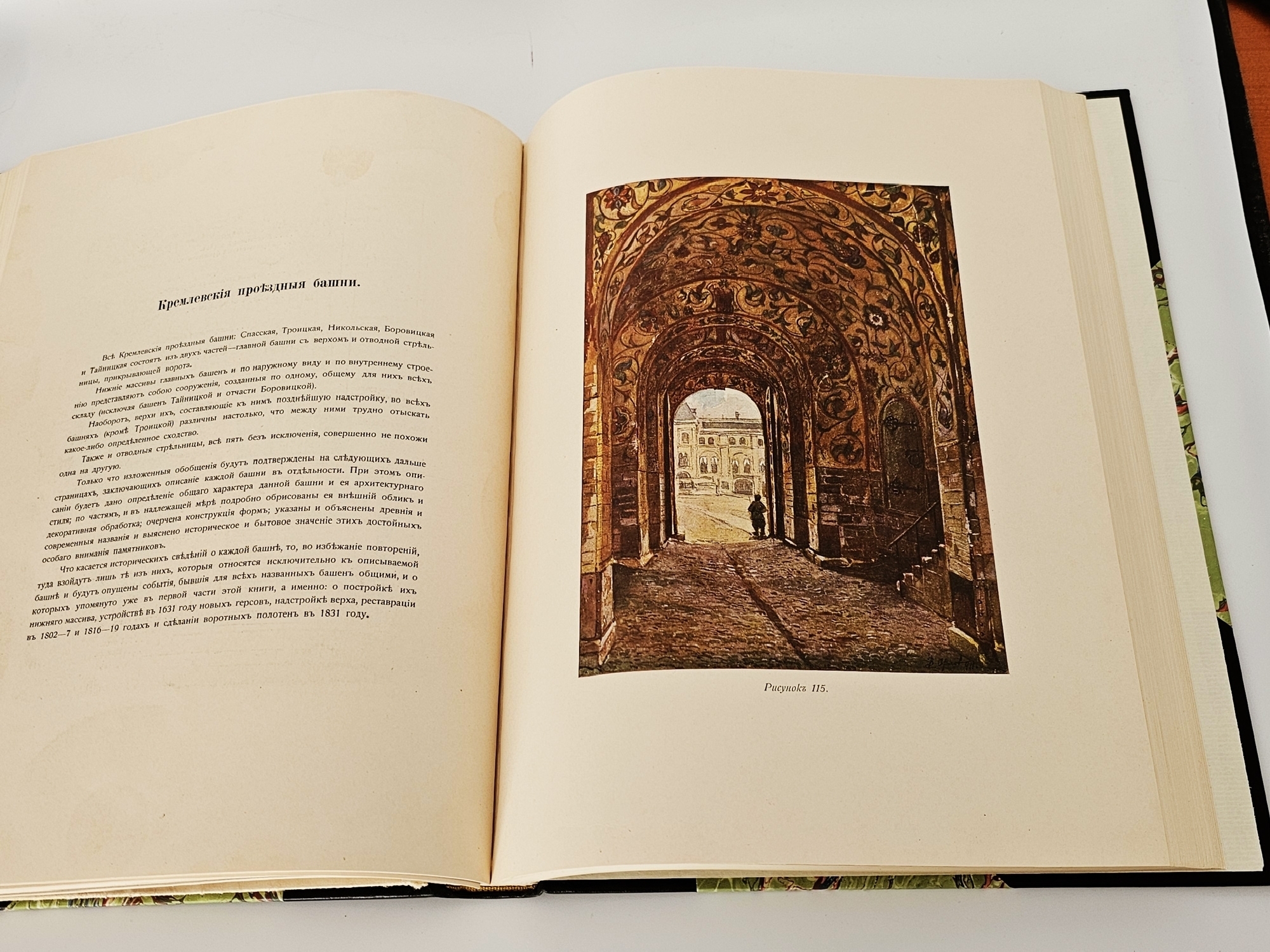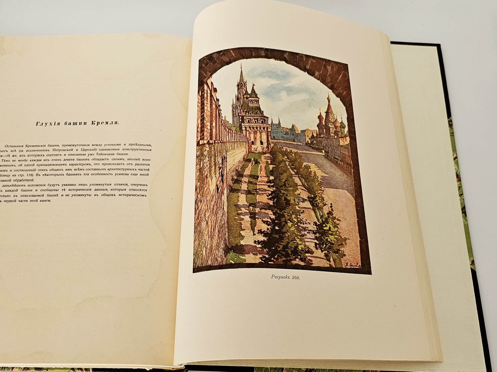 Одно из самых редких, раритетных и полных изданий, описывающих историю Московского Кремля. По обилию информации, по оформлению - по сей день является непревзойденным изданием. Издание роскошно иллюстрировано и дополнено стилизованными заставками, художественными концовками и виньетками. Отпечатано на особой мелованной бумаге высокого качества.