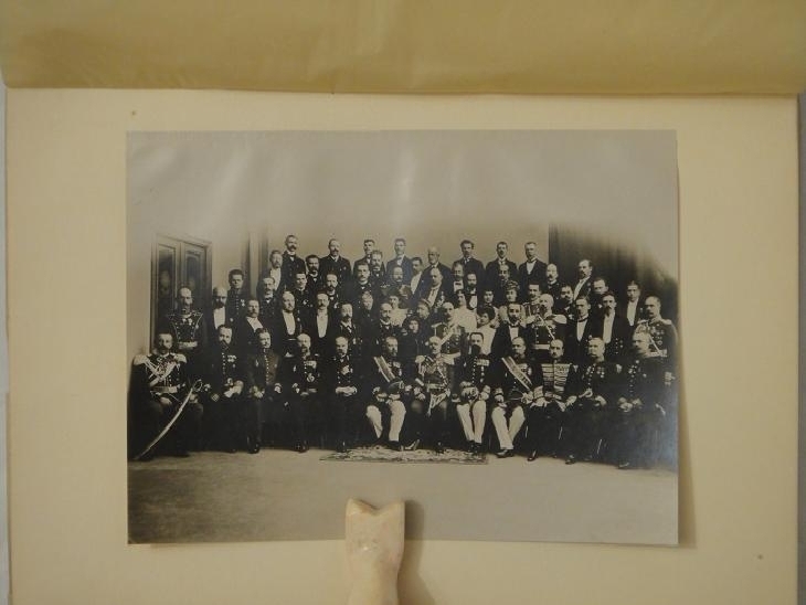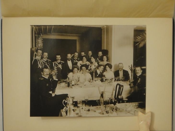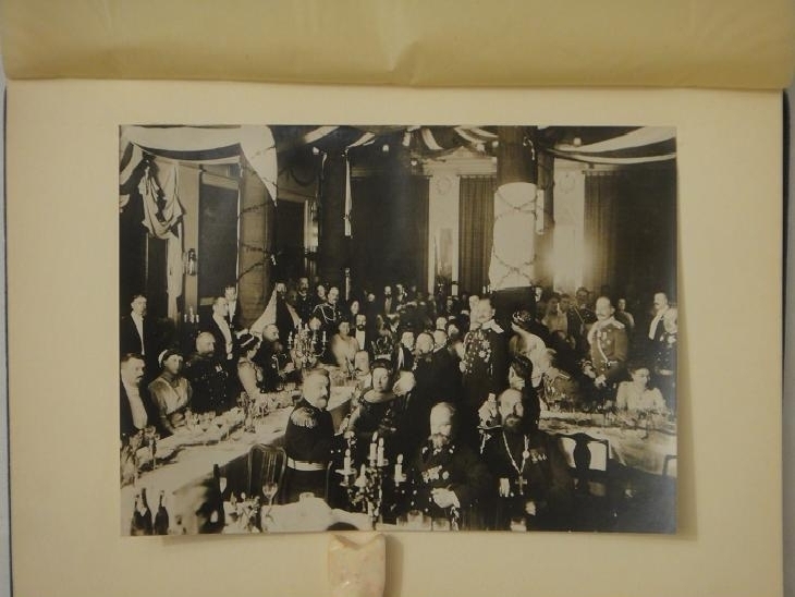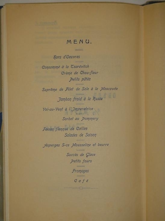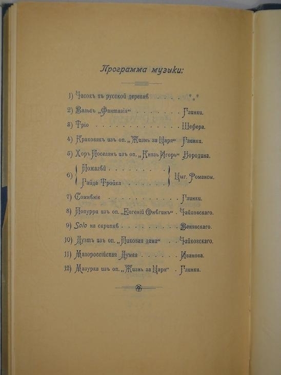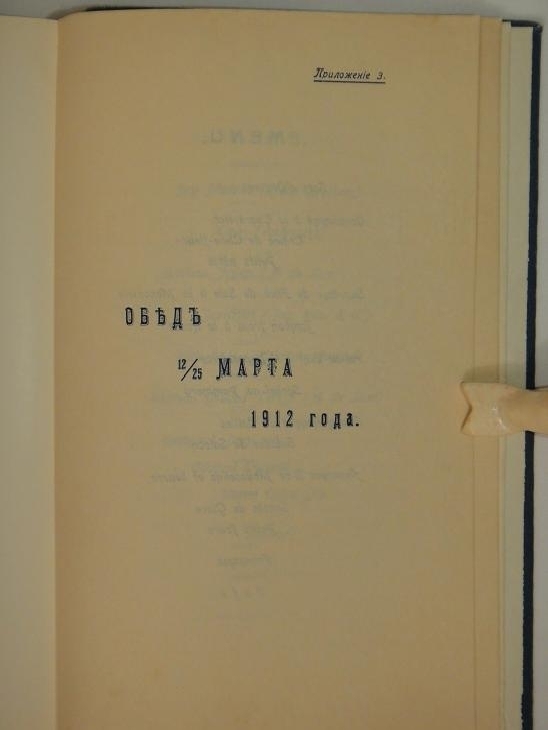 В конце, после основного текста, на жёлтой вержированной бумаге помещено меню праздничного обеда 12/ 25 марта 1912 года и музыкальная программа.