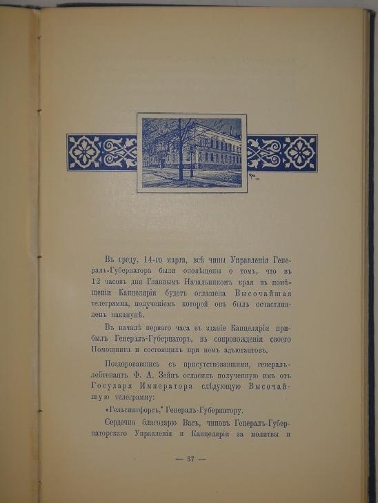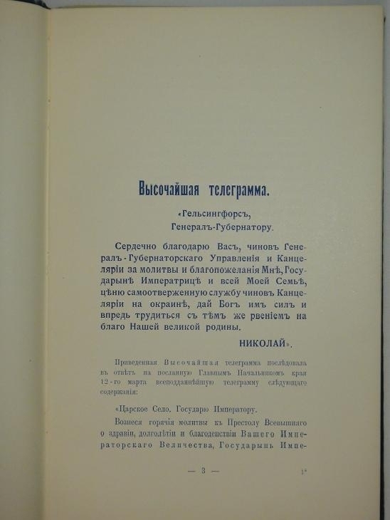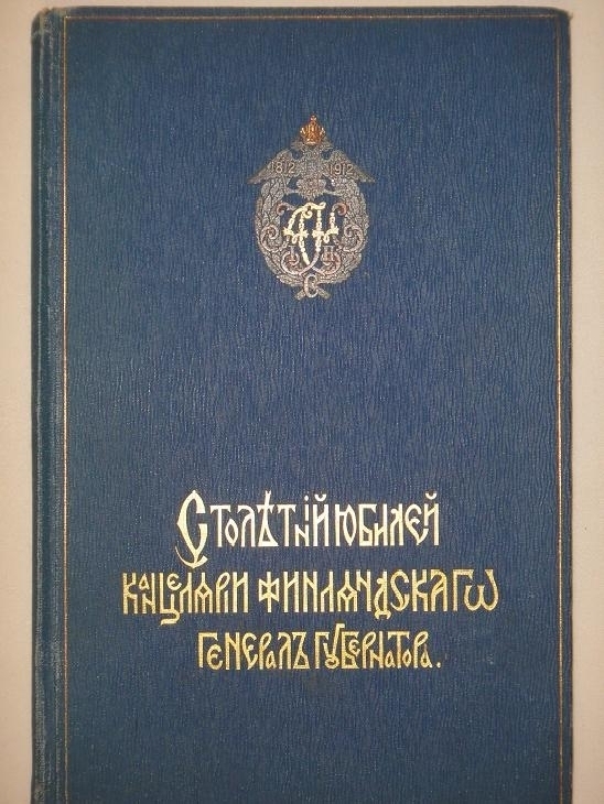 Особый подносной экземпляр с дарственным листом: " Его Превосходительству И.И.Вуоринену. Директор Канцелярии Финляндского генерал-губернатора, свидетельствуя совершенное почтение Его Превосходительству Ильмари Ивановичу Вуоринену имеет честь препроводить при сем очерк празднования 12 ( 25-го ) марта 1912 года столетнего юбилея Канцелярии Финляндского генерал-губернатора. 27 мая 1913 года ".