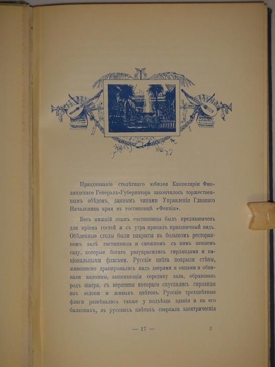 Книга напечатана на превосходной мелованной бумаге синим шрифтом и украшена изящными аллегорическими заставками, предваряющими каждую главу. Пять листов фотографий на отдельных вклейках, с изображением участников торжеств, наклеены на плотные листы картона и проложены защитными кальками. Шестой лист, с изображением юбилейного знака в память существования Канцелярии Финляндского генерал-губернатора, выполнен в технике хромолитографии. Художественно оформленный титульный лист.