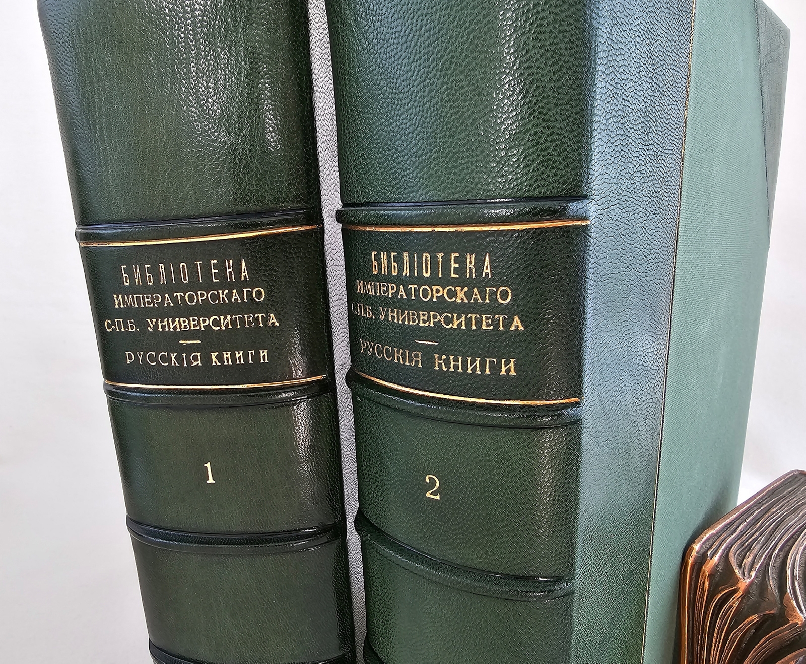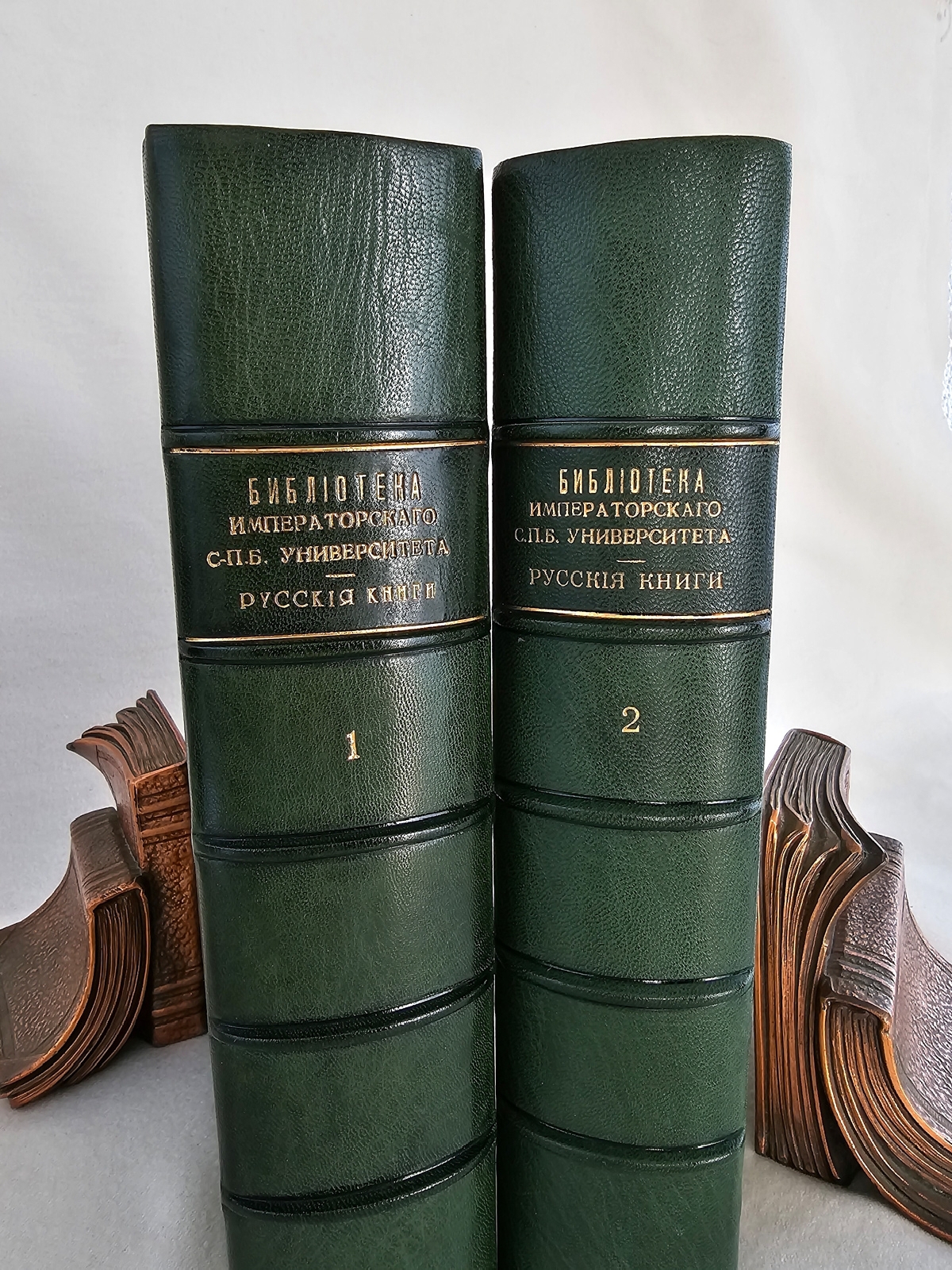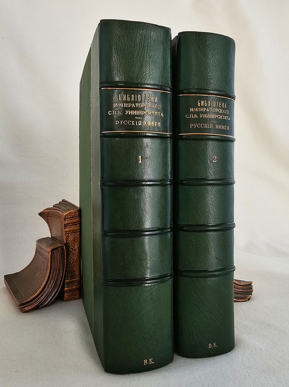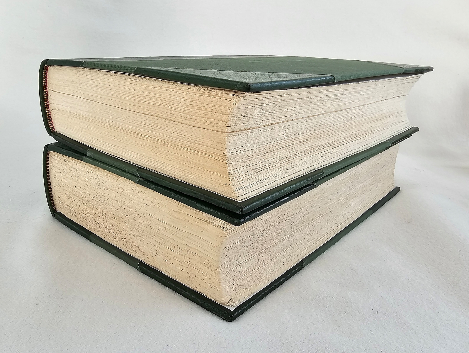 В 2-х зеленых полукожаных "французских" переплетах с "бинтами", с зелеными коленкоровыми крышками. Увеличенного формата: 26 см. Состояние хорошее.