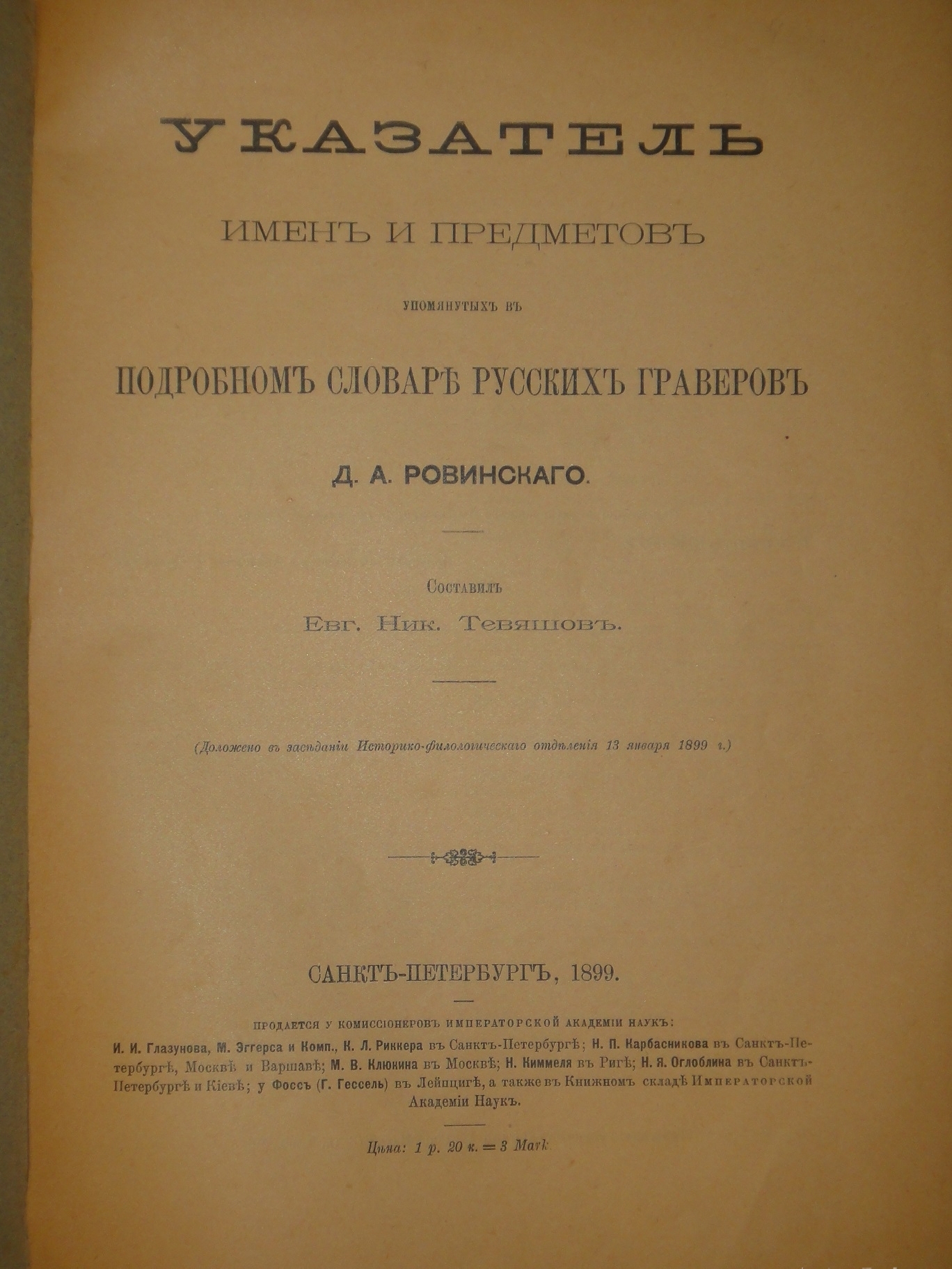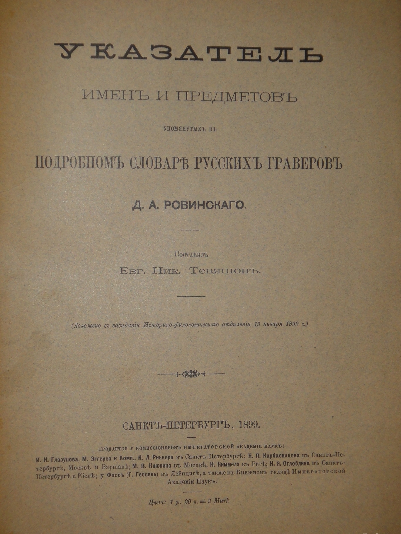 См. Ульянинский " Библиотека Д.В.Ульянинского. Библиографическое описание " ( Т.I, № 1197 ). " Список книг, вышедших в России в 1899 году " ( Стр. 202. Тираж: 460 экземпляров ).