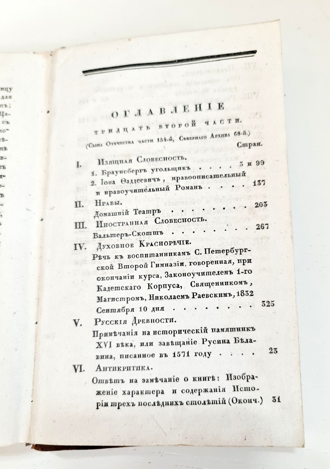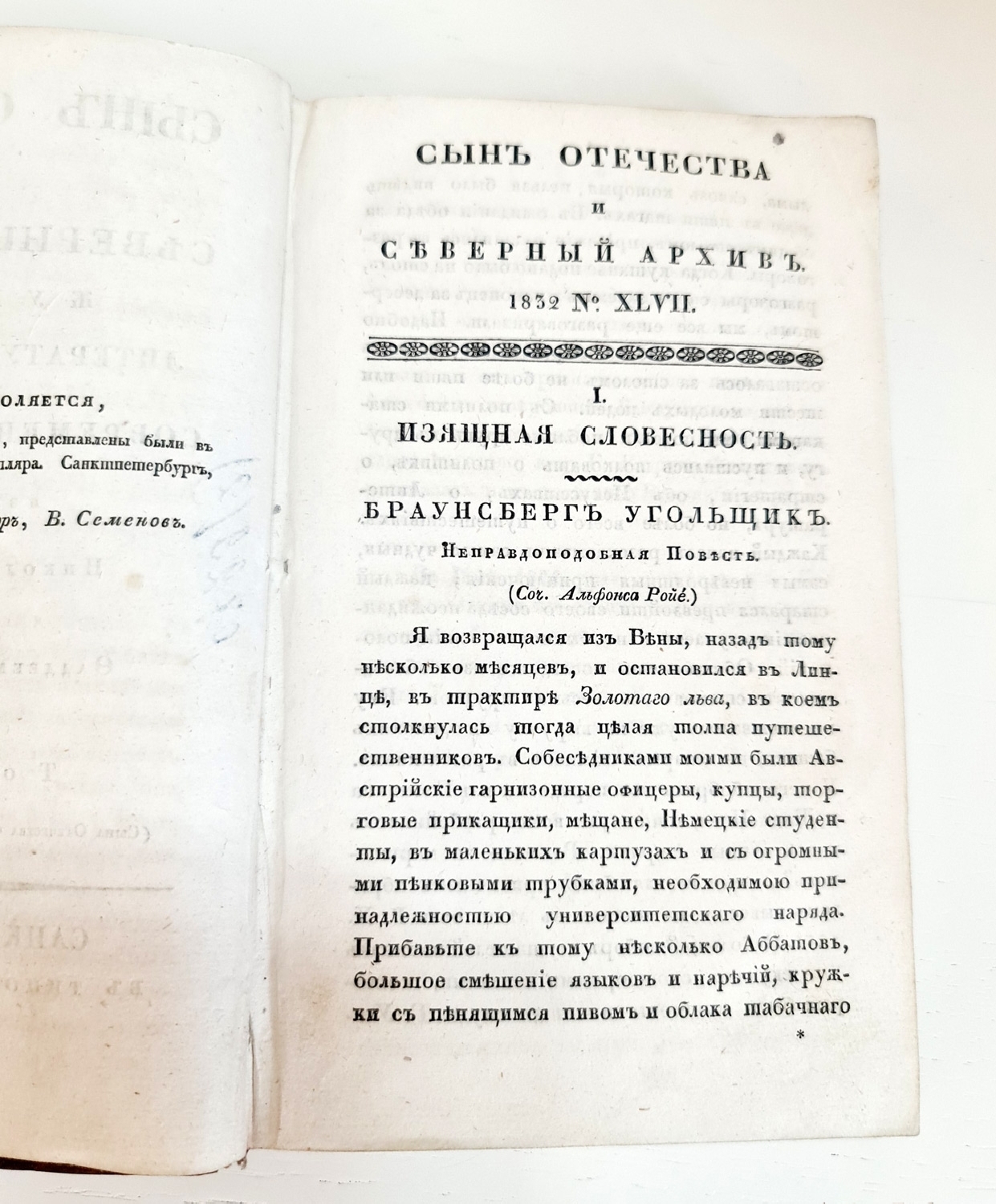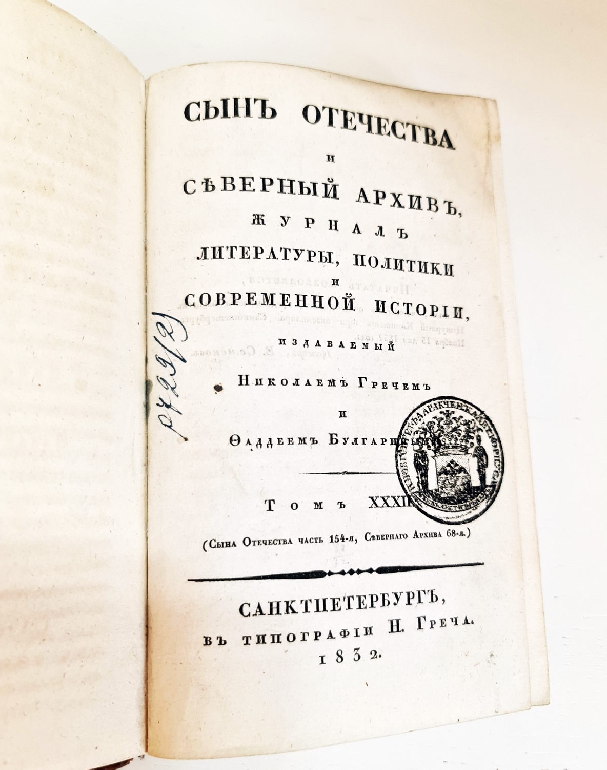 Журнал литературы, политики и современной истории, издаваемый Николаем Гречем и Фаддеем Булгариным. Том XXXII. (Сына Отечества часть 154-я, Северного Архива 68-я). Типография Н. Греча.