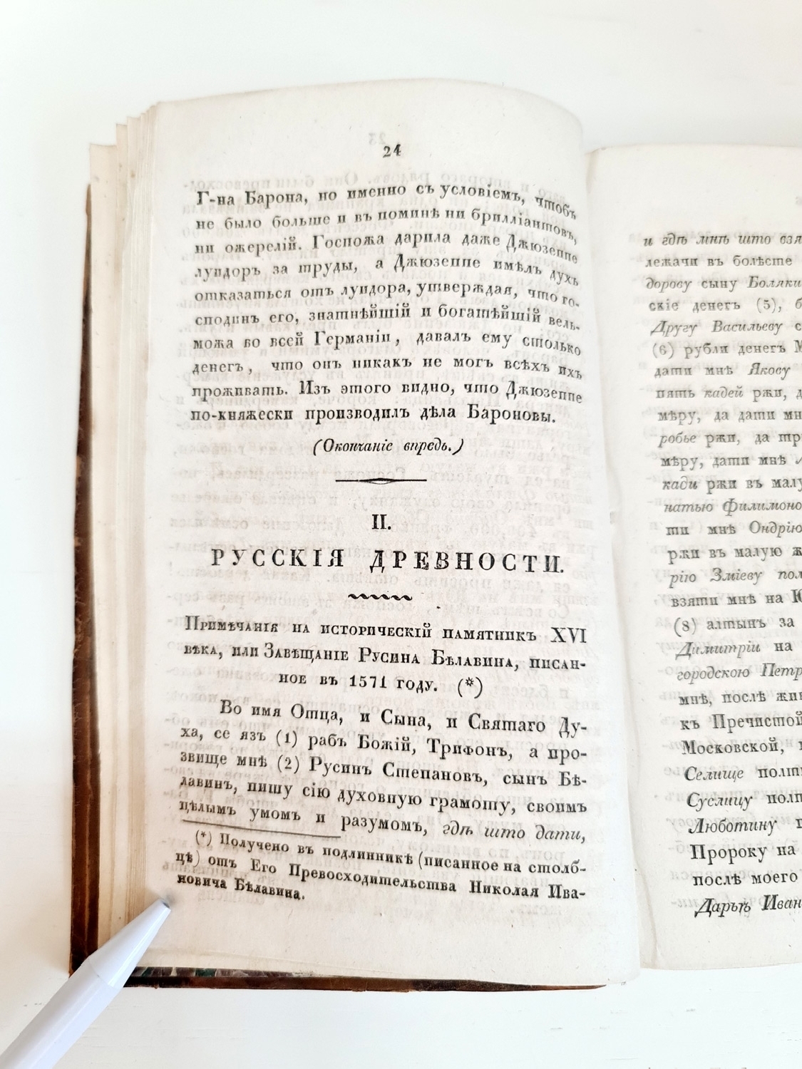 V. Русские древности. Примечание на исторический памятник XVI века, или завещание Русина Белавина, писанное в 1571 году.