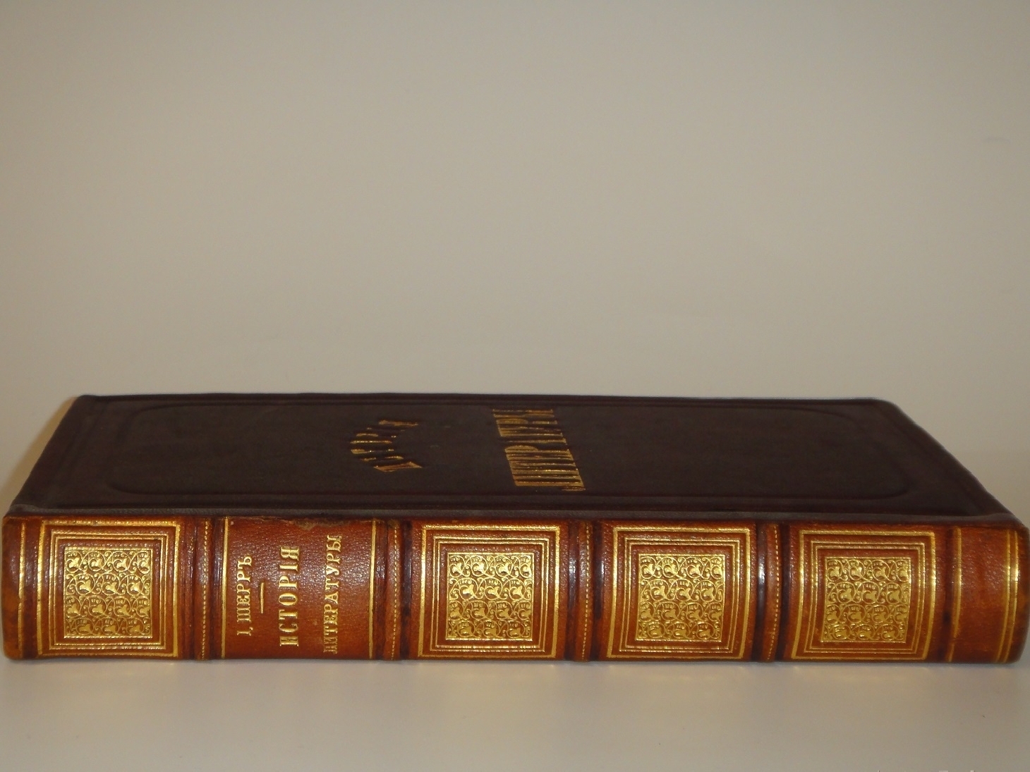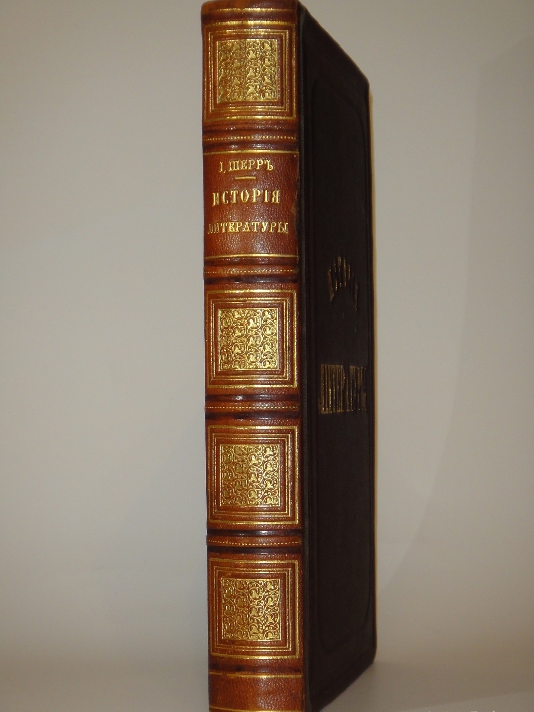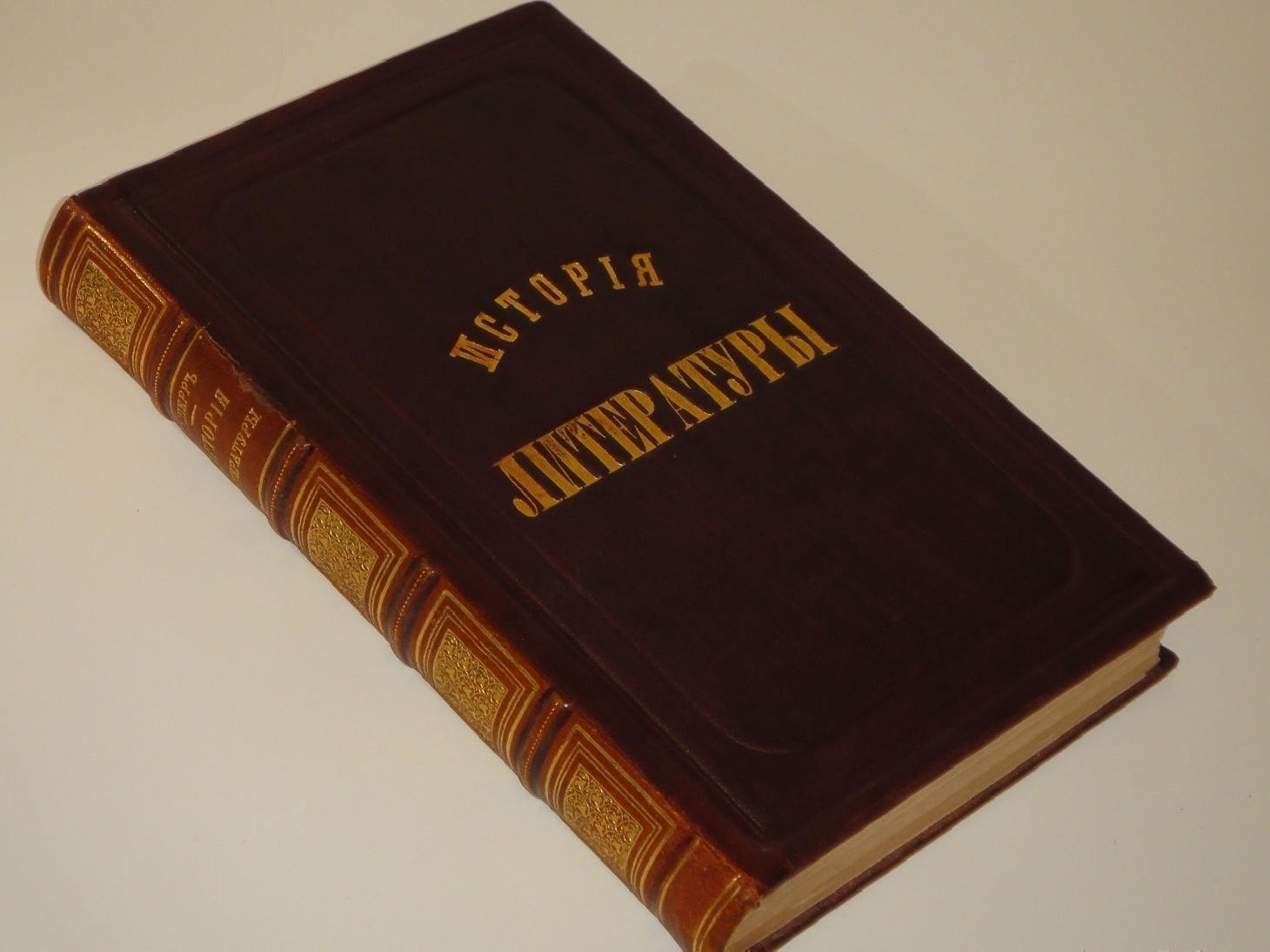 Экземпляр в роскошном полукожаном переплёте эпохи с золотым высокохудожественным орнаментальным тиснением на бинтовом корешке. Крышки оклеены коричневым коленкором и обрамлены симметричными декоративными блинтовыми рамками. В центральной части передней крышки золототиснёная надпись названия издания: Исторiя литературы.