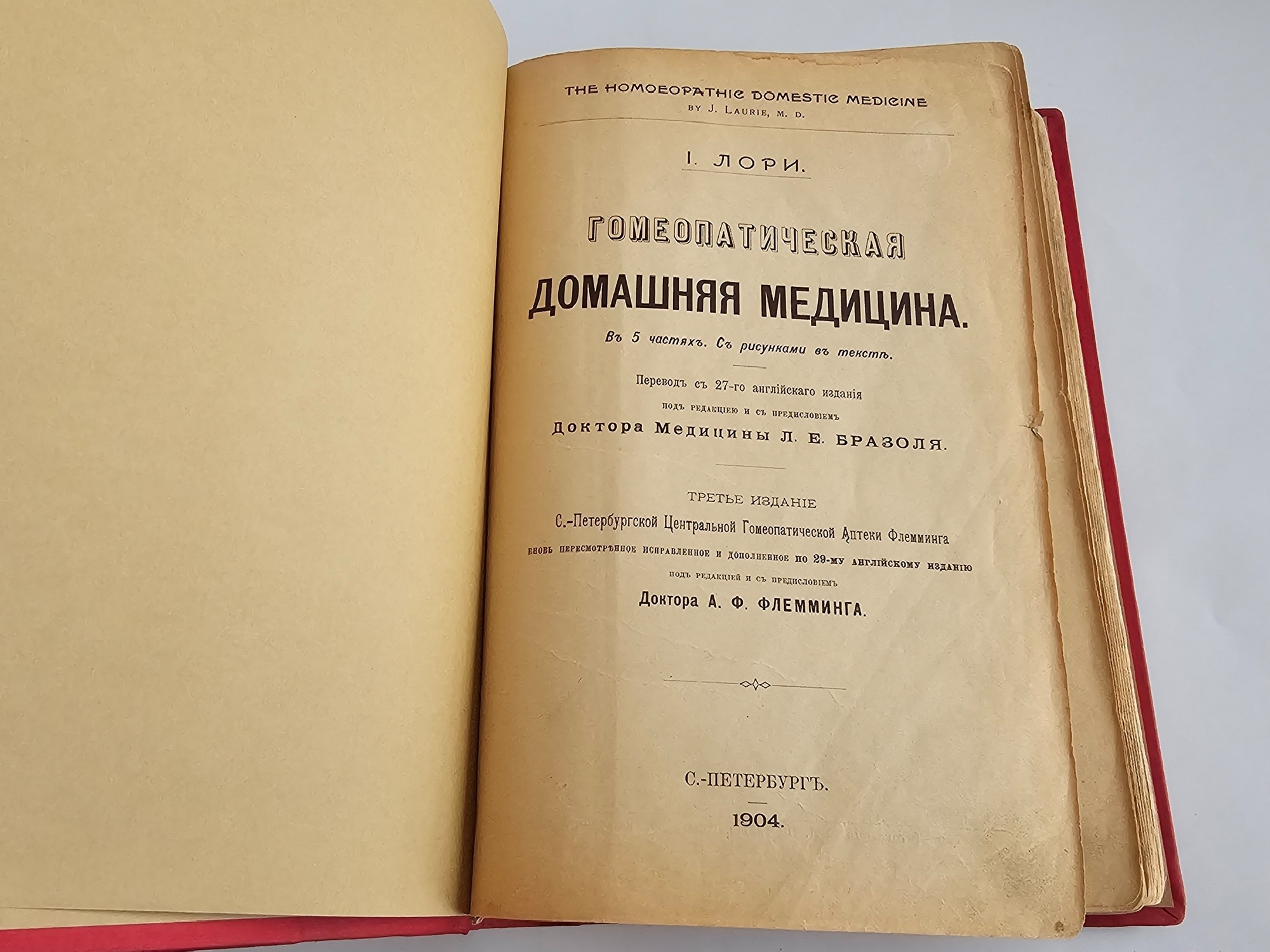 «Гомеопатическая домашняя медицина» Джозефа Лори в переводе Л. Е. Бразоля (Санкт‑Петербург, 1904) — третье русское издание, переработанное и дополненное по 29‑му английскому выпуску - в тексте разъяснены специальные термины, добавлен алфавитный указатель для удобства поиска.