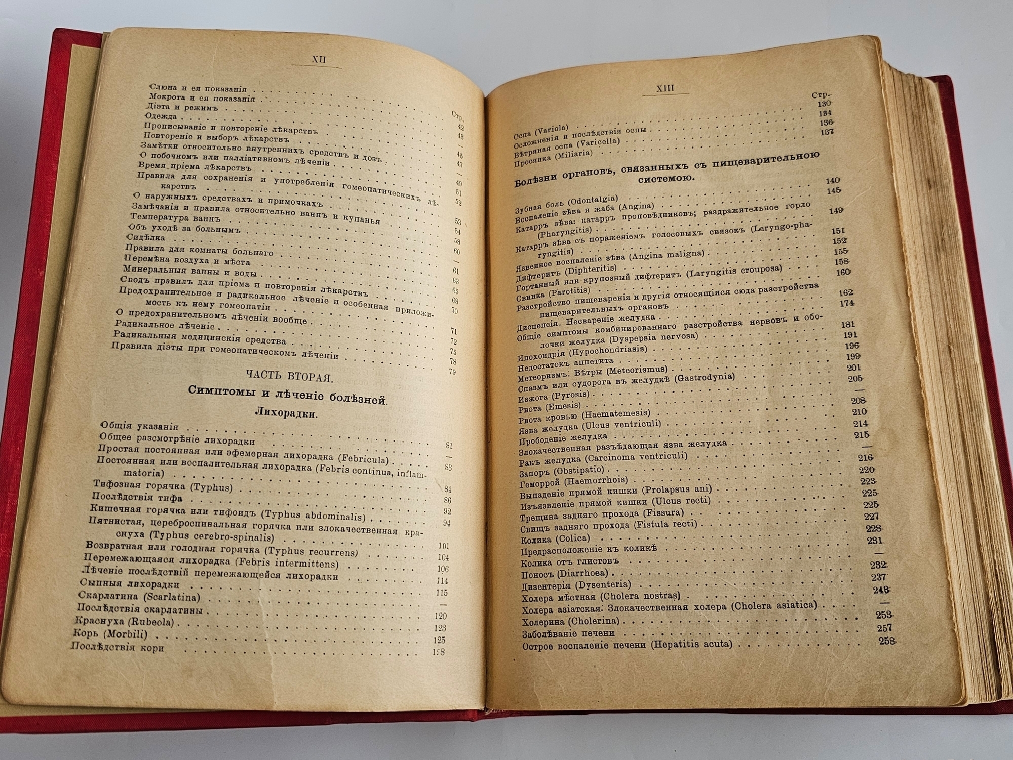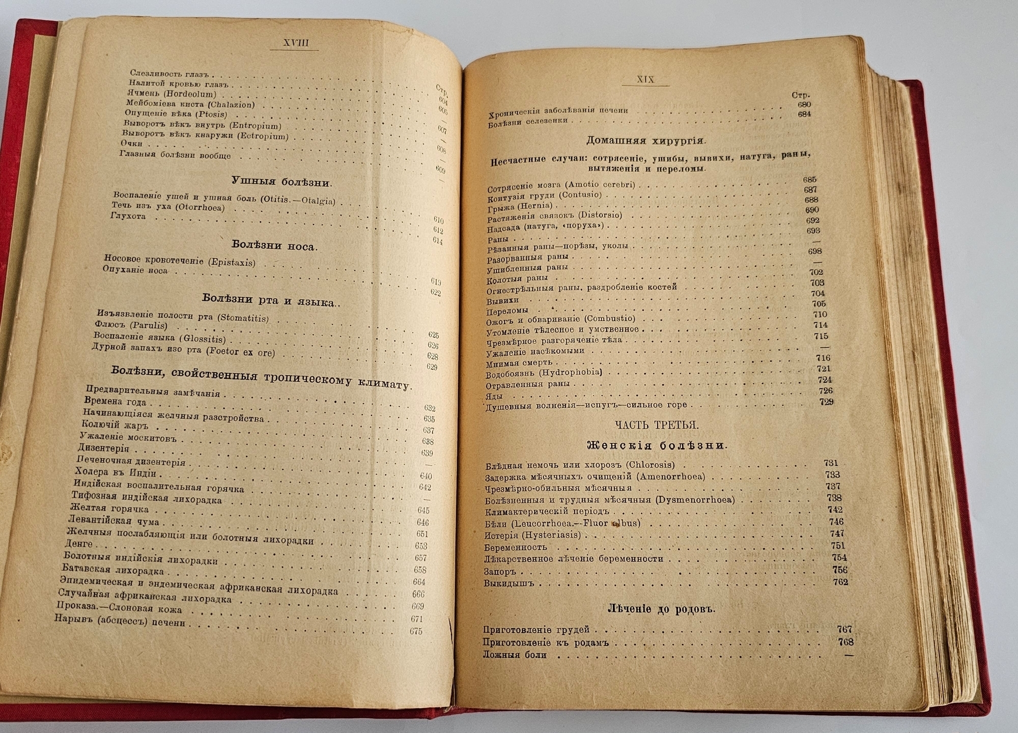 симптомы большинства известных на тот время болезней (кроме венерических), включая тропические заболевания, а также приёмы домашней хирургии (лечение ожогов, вывихов, переломов, ран и ушибов);
