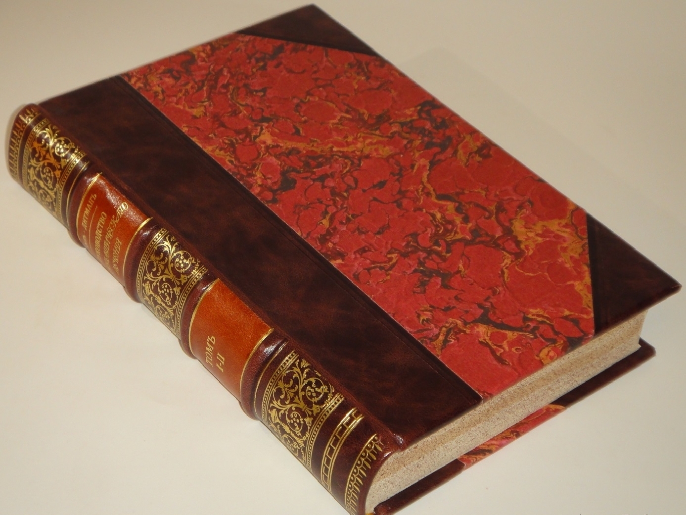 Экземпляр в современном стильном полукожаном переплёте с золотым художественным орнаментальным тиснением на бинтовом корешке и двух контрастных декоративных вставках. Крышки с углами оклеены бумагой под мрамор.