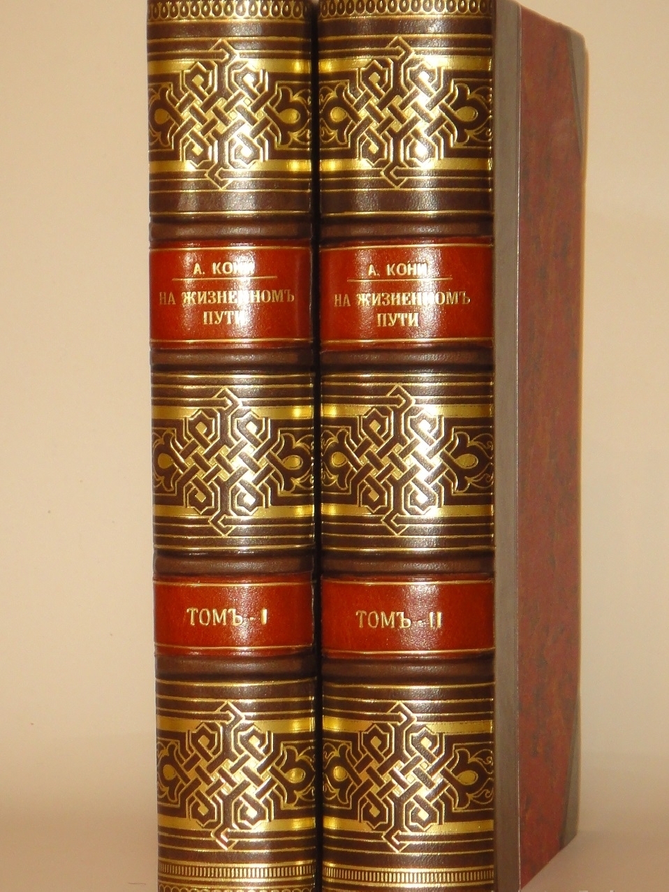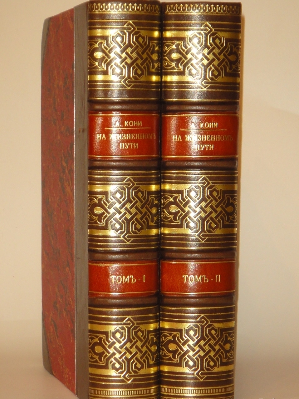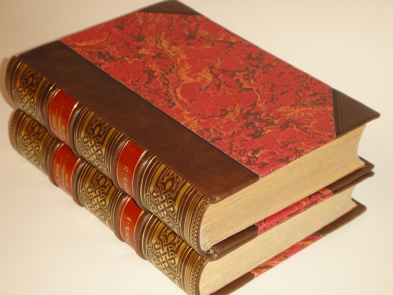 Экземпляр двух превосходных современных полукожаных переплётах с углами и золотым высокохудожественным узорным тиснением на бинтовых корешках. Крышки - оклеены бумагой под мрамор, форзацы - плотной цветной бумагой. Тонированная головка, обрез с паутинкой. Шёлковое ляссе.