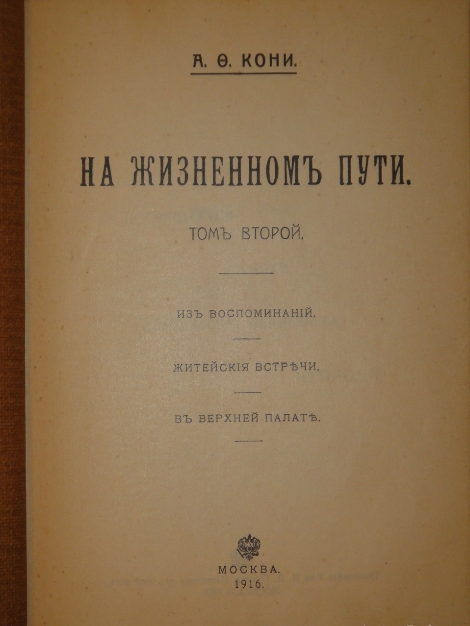 Том 2. Из воспоминаний: Лев Николаевич Толстой; По поводу драматических произведений Толстого; Тургенев - Достоевский - Некрасов - Апухтин - Писемский - Языков; Александр Иванович Чупров; Василий Осипович Ключевский; " Вестник Европы "; Граф Дмитрий Алексеевич Милютин; Пятьдесят лет назад. Житейские встречи: Синьор Беляев; Остенде-Париж ( 1869-1873 ); В дороге. - Гимназические воспоминания; Домочадцы. В Верхней Палате: О Старообрядческих общинах; О переходе из одного исповедания веры в другое; Об отмене ограничений, связанных с оставлением духовного сана; Попечительства о народной трезвости и питейная торговля; Об упразднении тотализатора; Народный университет Шанявского; К законопроекту об авторском праве; Об условном досрочном освобождении; Об отмене существующего обряда предания суду; Об отмене прокурорских заключений по гражданским делам; Уравнение наследственных прав женщин; О допущении женщин в адвокатуру; Личные права замужних женщин; Общеимперское законодательство для Финляндии; Запрос председателю Совета Министров о применении 87 ст. Зак. Основных; Порядок преследования по преступлениям должности; О допущении воспитанников средних учебных заведений в университет. 1916. 736, II стр.