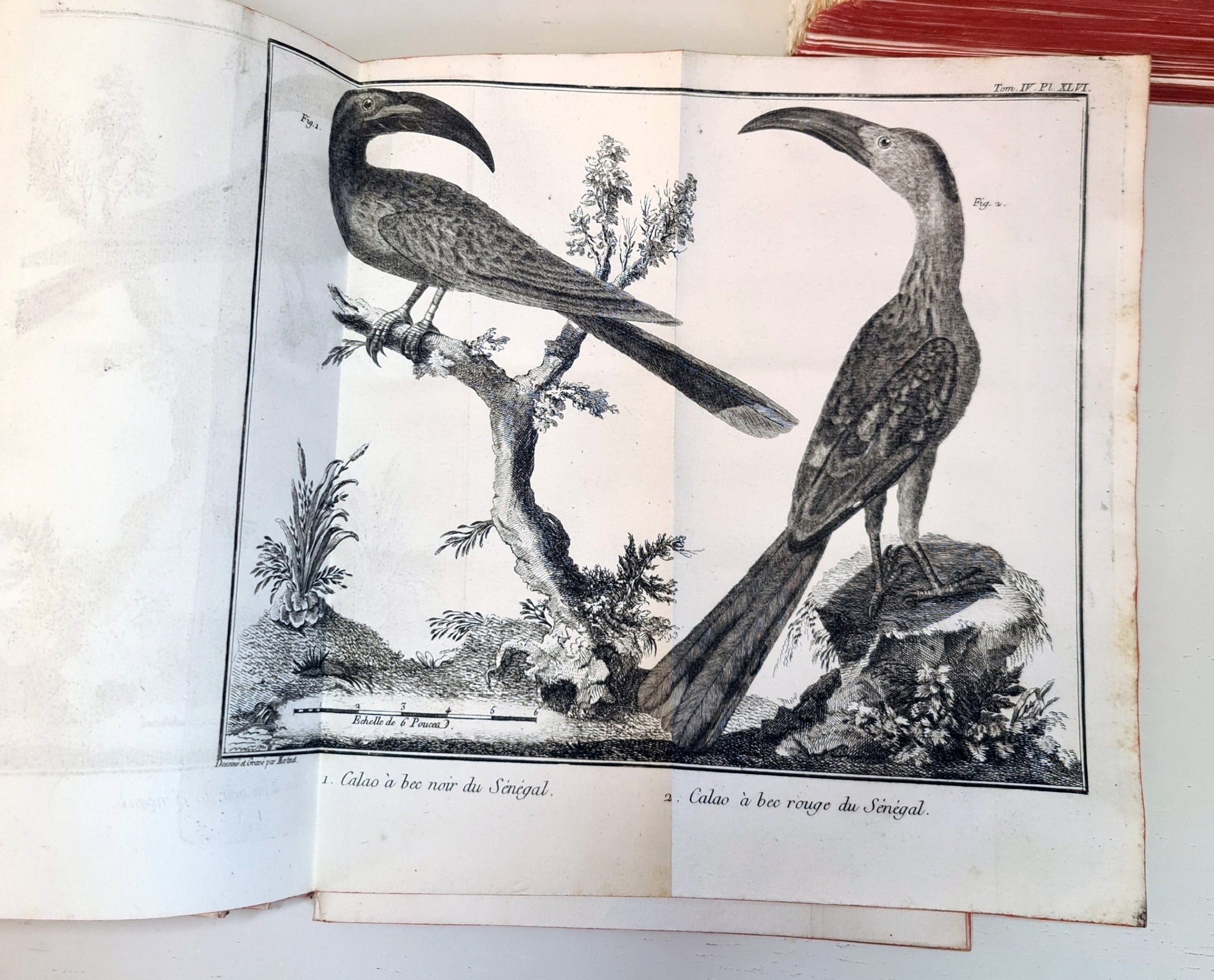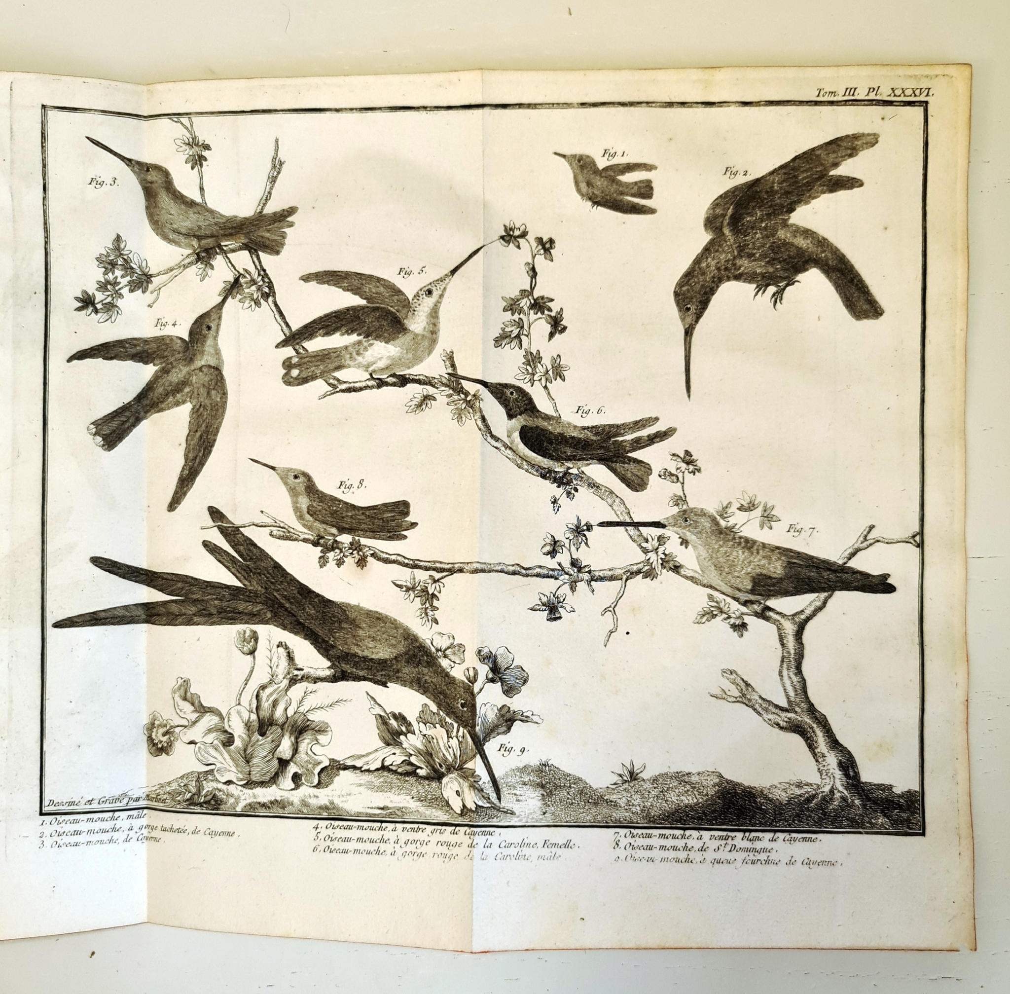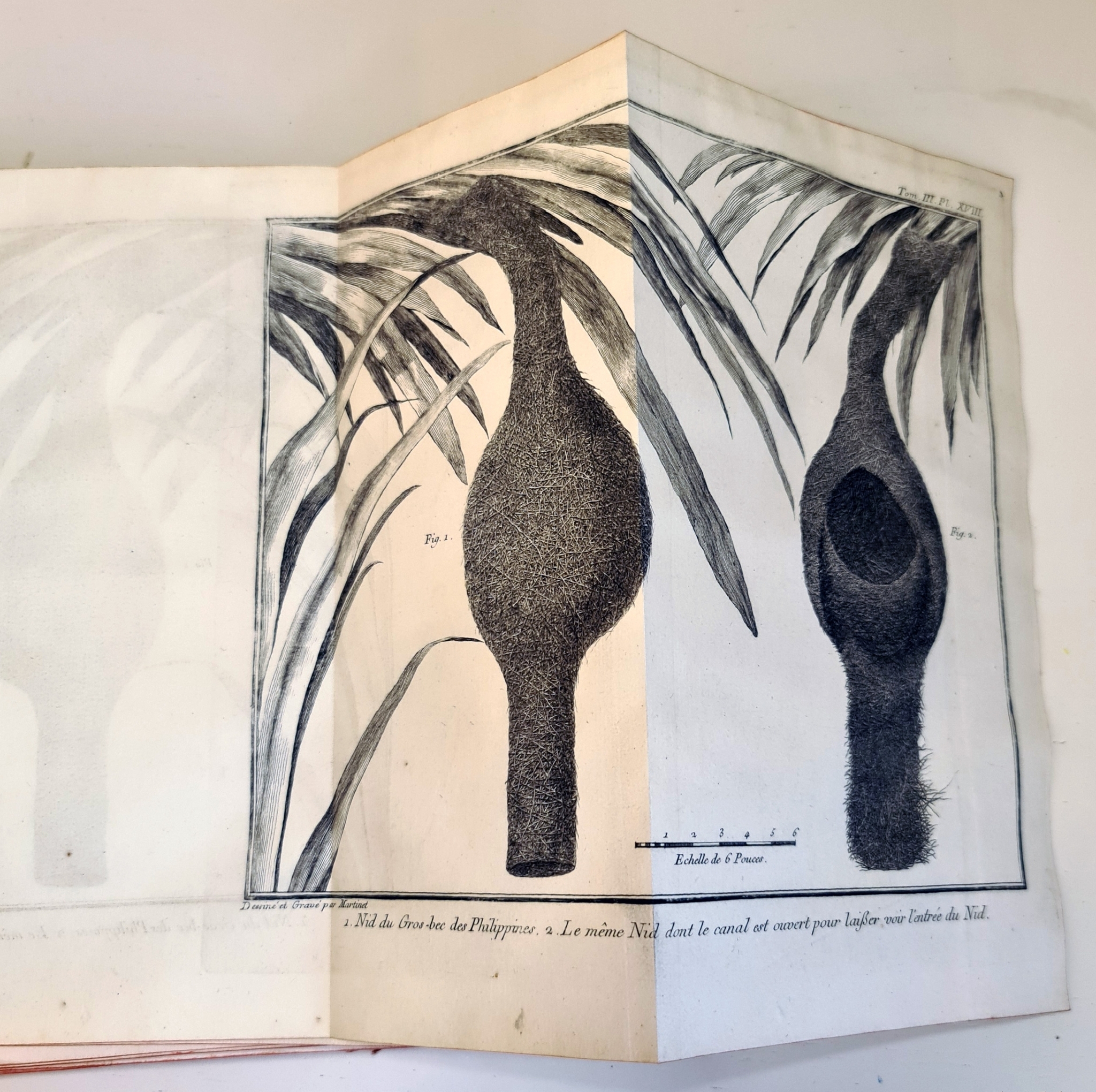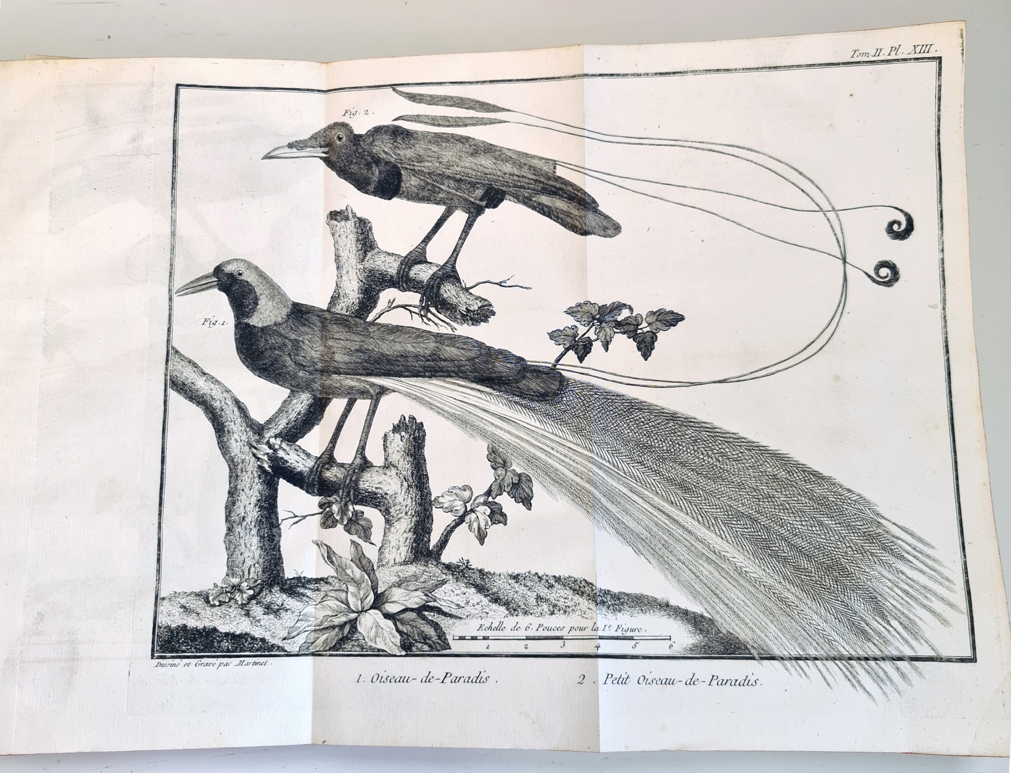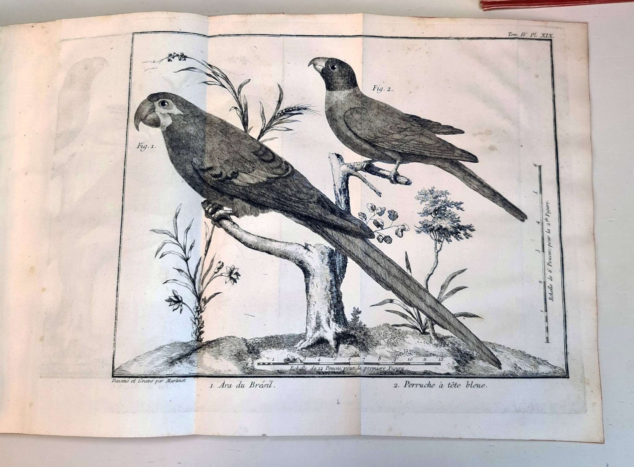 Книги увеличенного размера - 25,5х20х35 см. Книги без переплетов, распадаются на тетрадки. Титульные листы на французском и латинском языке, с гравюрой на дереве. Гравюры работы Матюрен-Жака Бриссон. Очень насыщенные красивые гравюры. С золотым обрезом.