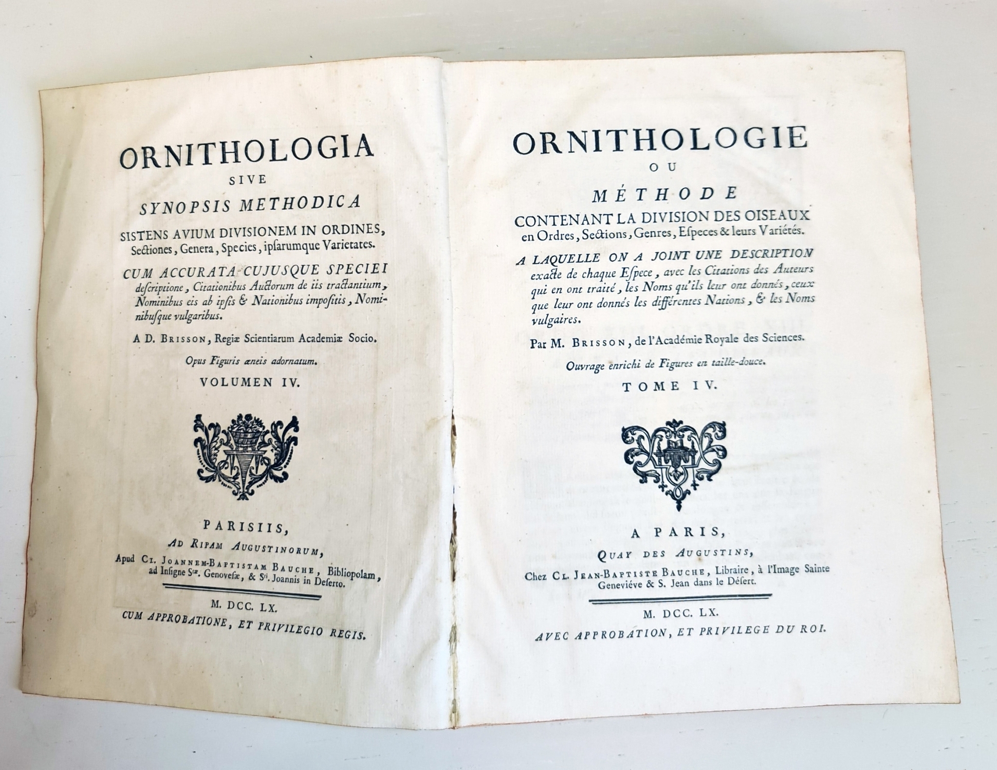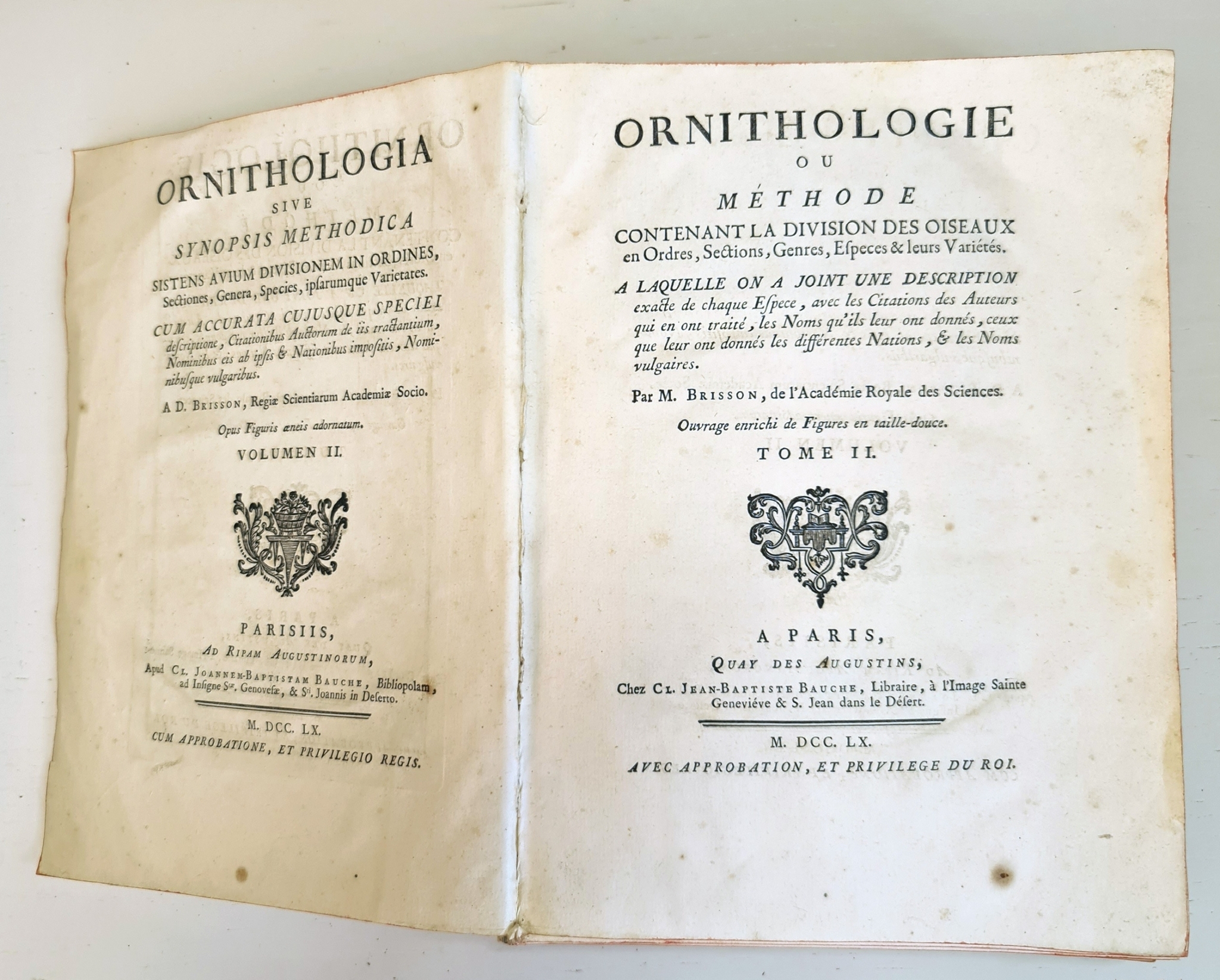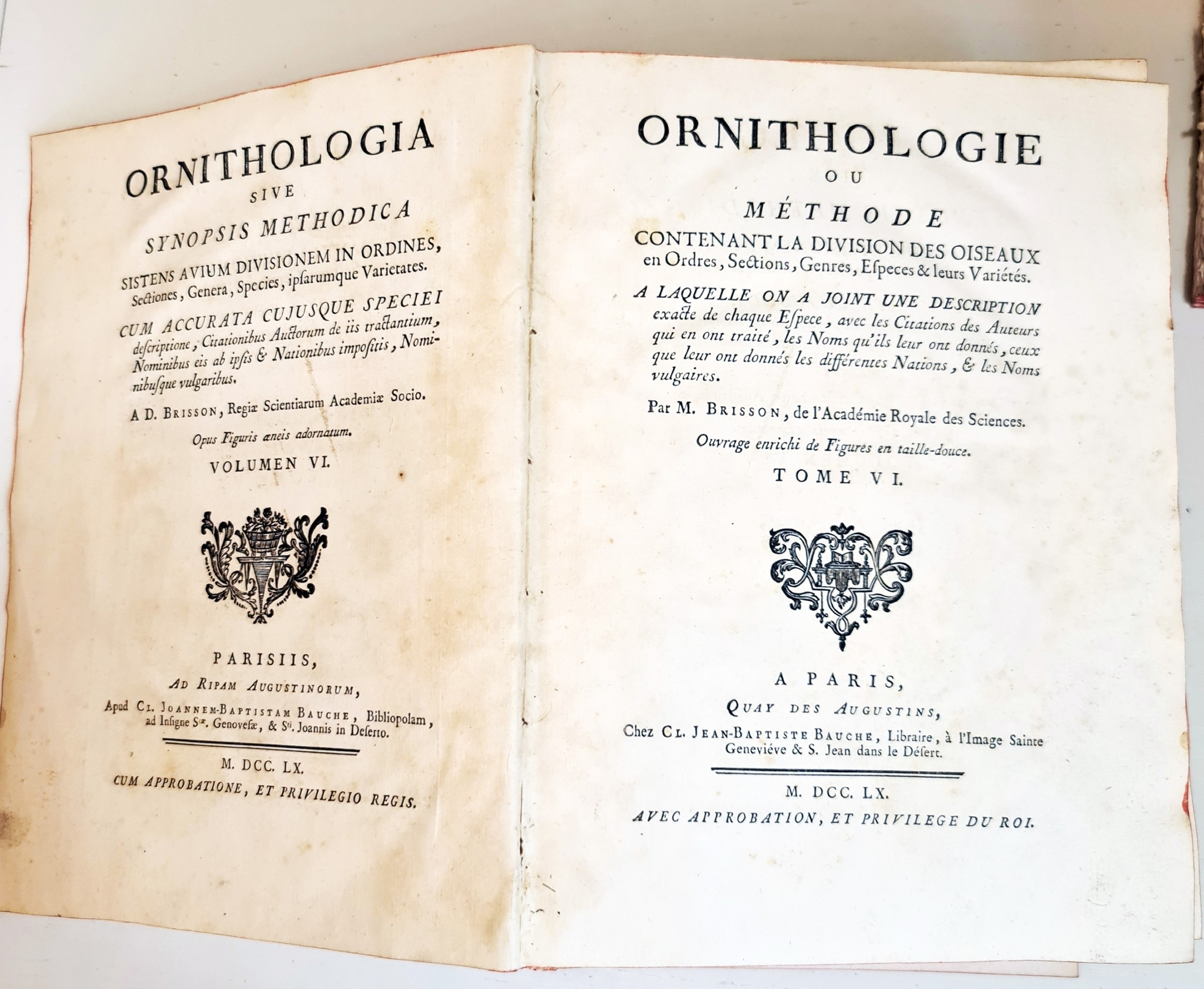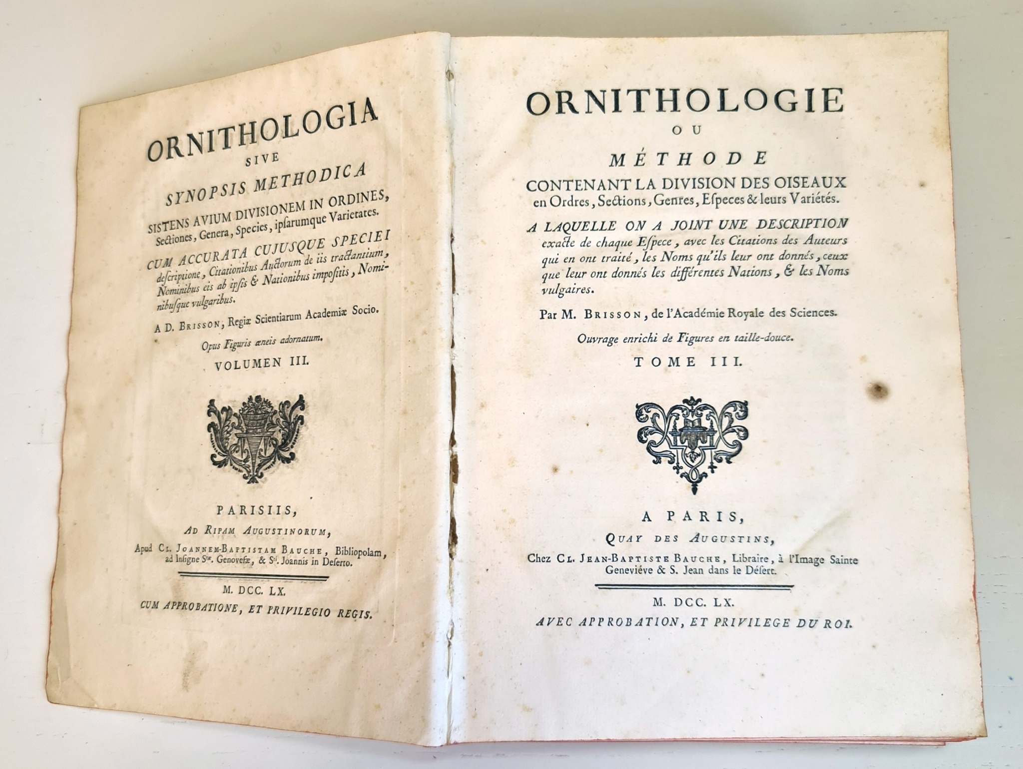 «Написанное одним из величайших знатоков птиц того времени, это исследование посвящено 1336 видам. Бриссон знал в лицо более 800 видов, которые он описал. Сложенные листы были нарисованы и выгравированы Мартине.