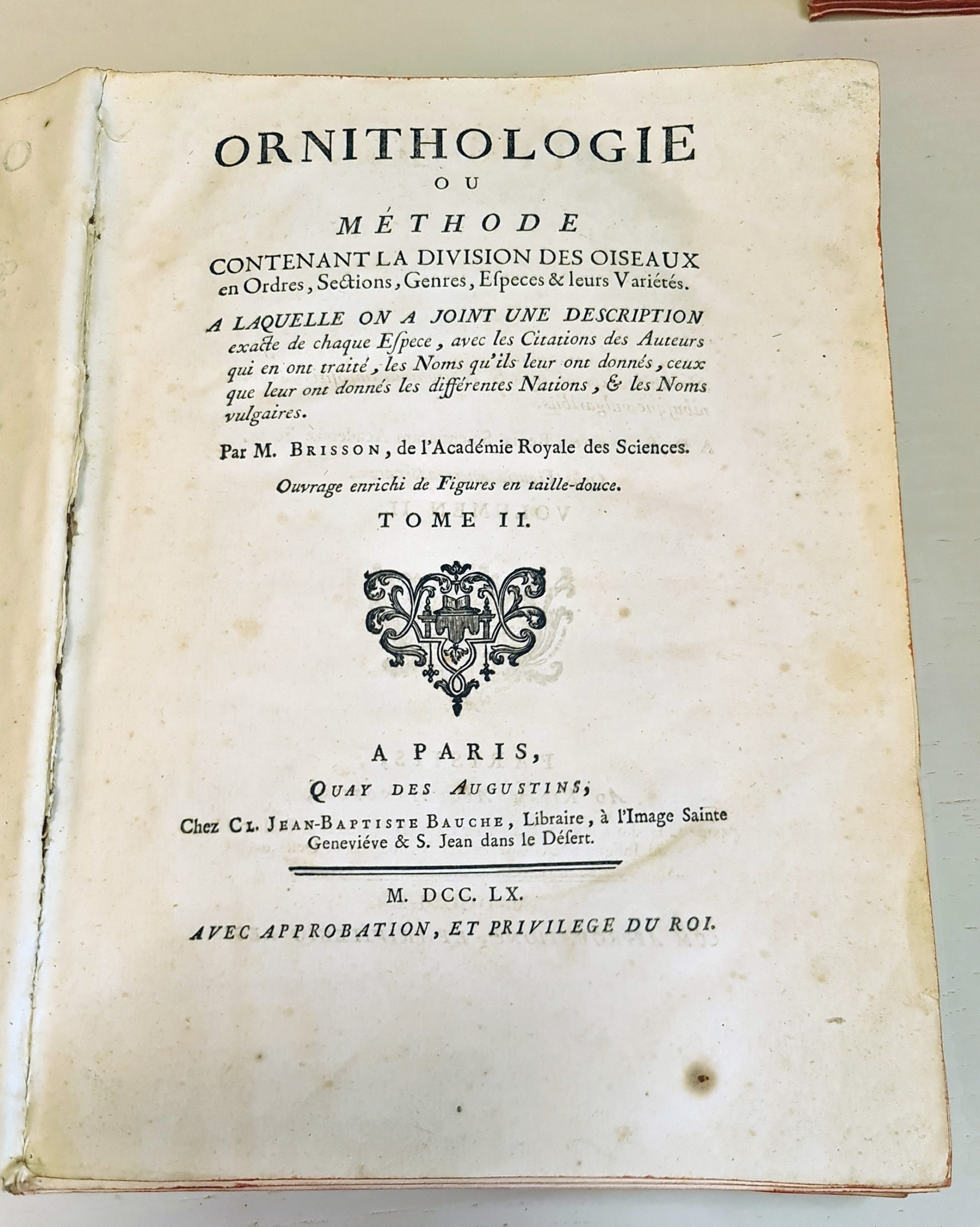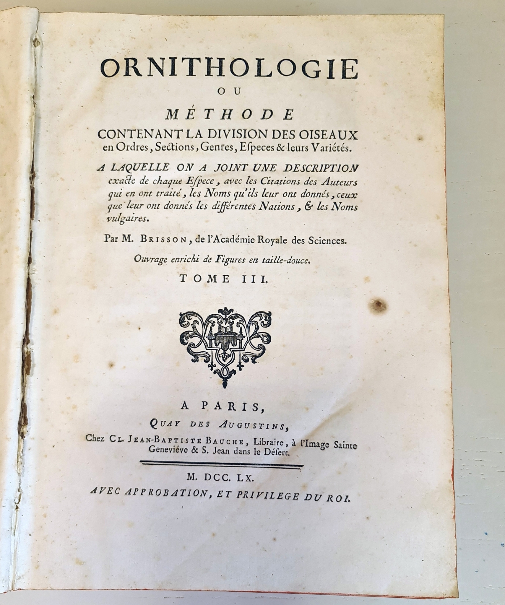Полное название книги - "Ornithologie ou mthode contenant la division des oiseaux en ordres, sections, genres, espces Leurs varits: A laquelle on a joint une description exacte de chaques espce, avec les citations des auteurs qui en ont trait, les noms quils leur ont donns, ceux que leur ont donns les diffrentes nations les noms vulgaires."