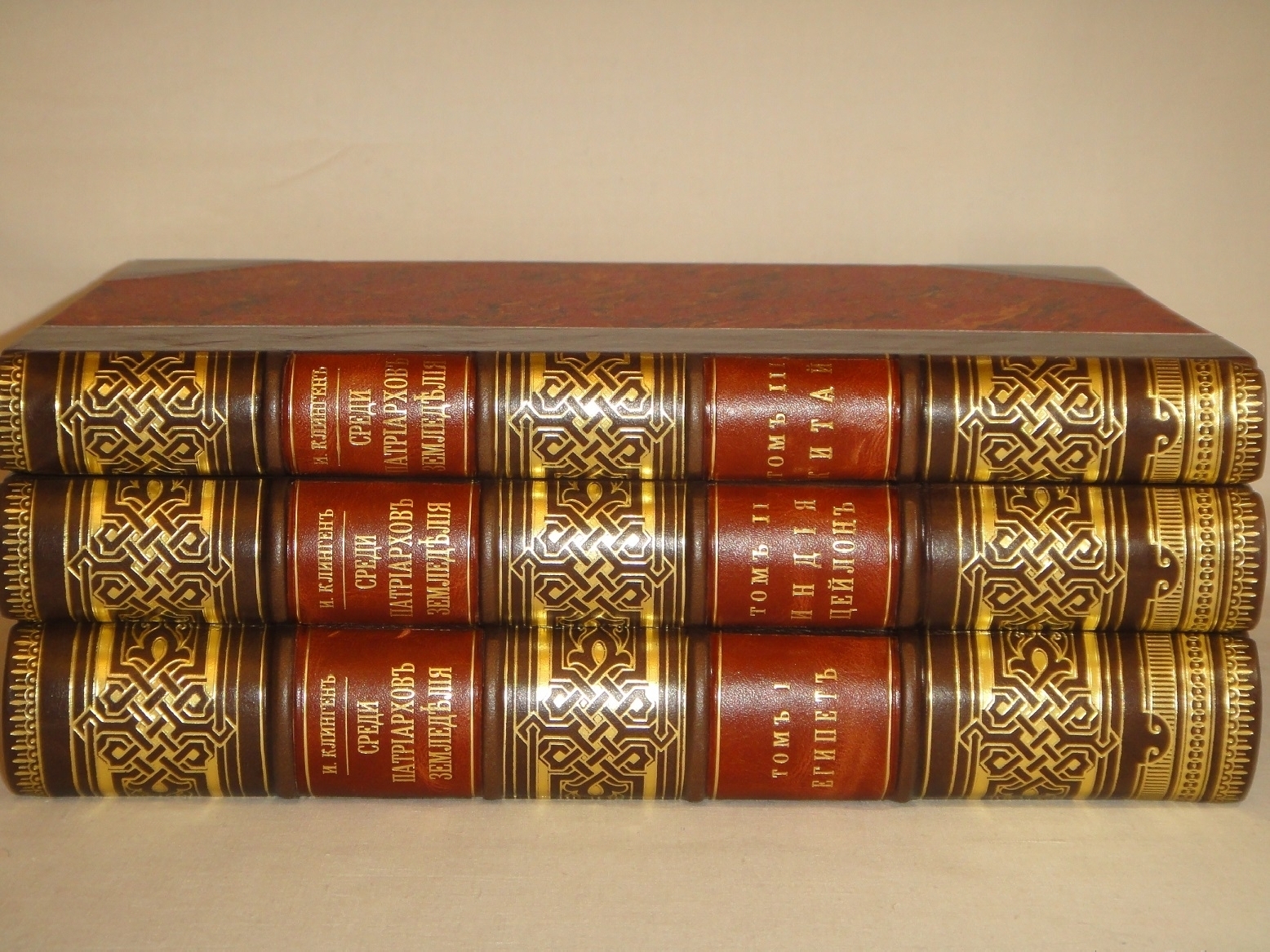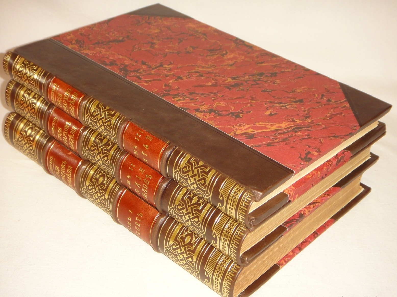 Экземпляр в трёх очень красивых современных полукожаных переплётах с золотым орнаментальным тиснением на бинтовых корешках и двух контрастных декоративных вставках. Крышки с углами оклеены бумагой под мрамор. Форзацы светлого тона. Шёлковое ляссе.