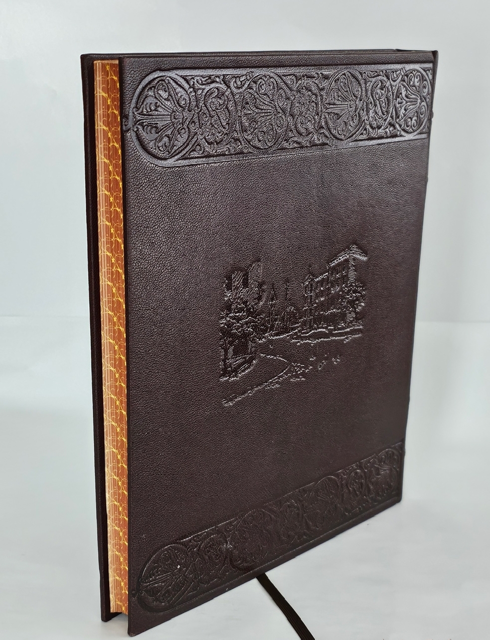 Книга оформлена в современный цельнокожаный переплете, стилизованный под издательский.С блинтовым и золотым тиснением. Обрез украшен рисунком. Оригинальные форзацы. Очень красивый экземпляр. Отличный подарок!