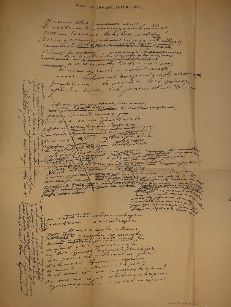 Два снимка с рукописи поэта на одном большом складном листе: начало - " Сказки для детей " ( 1841 ); конец стихотворения - " Журналист, читатель и писатель " ( 1840 ).