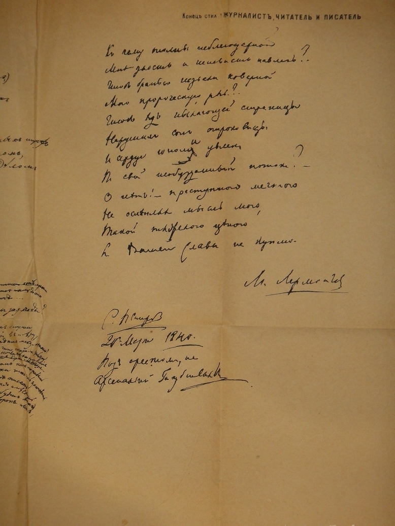 Анонимный доносчик прислал стихотворение Николаю I с надписью: " Воззвание к революции ". Лермонтов был арестован, разжалован в прапорщики и выслан на Кавказ. Благодаря хлопотам влиятельной бабушки, Елизаветы Алексеевны Арсеньевой, его через восемь месяцев вернули в гвардию, а ещё через полгода в Петербург.