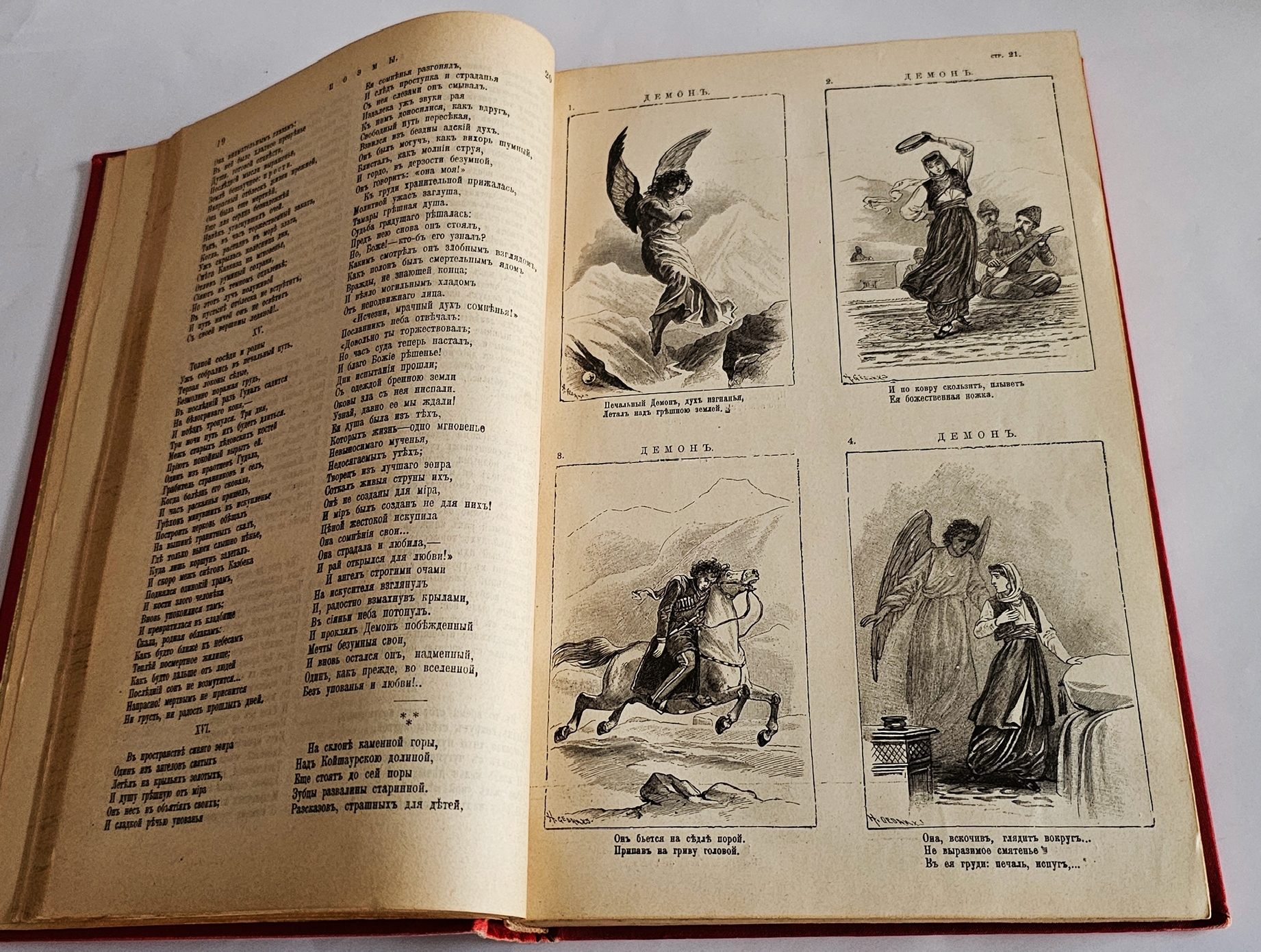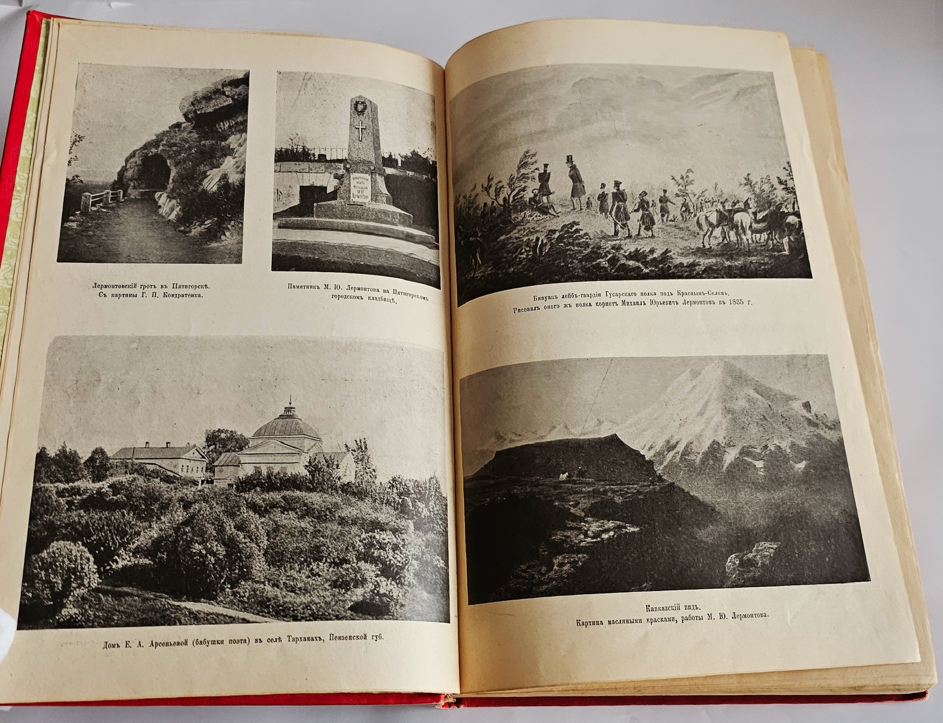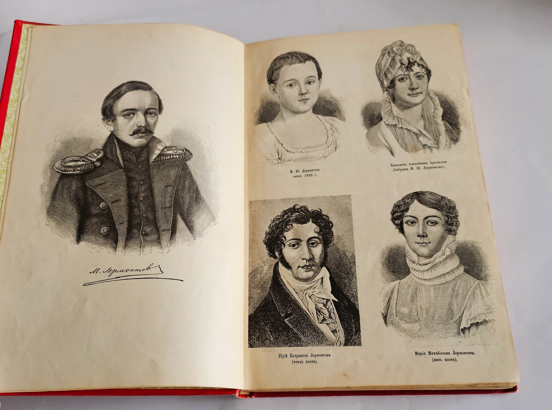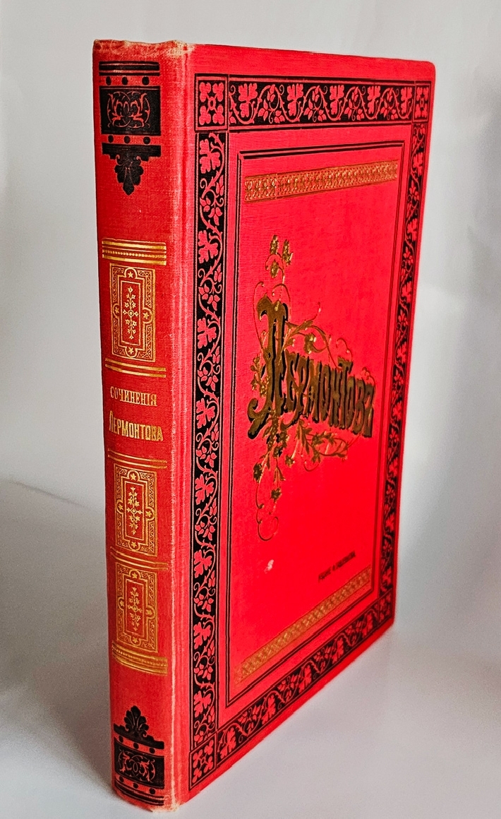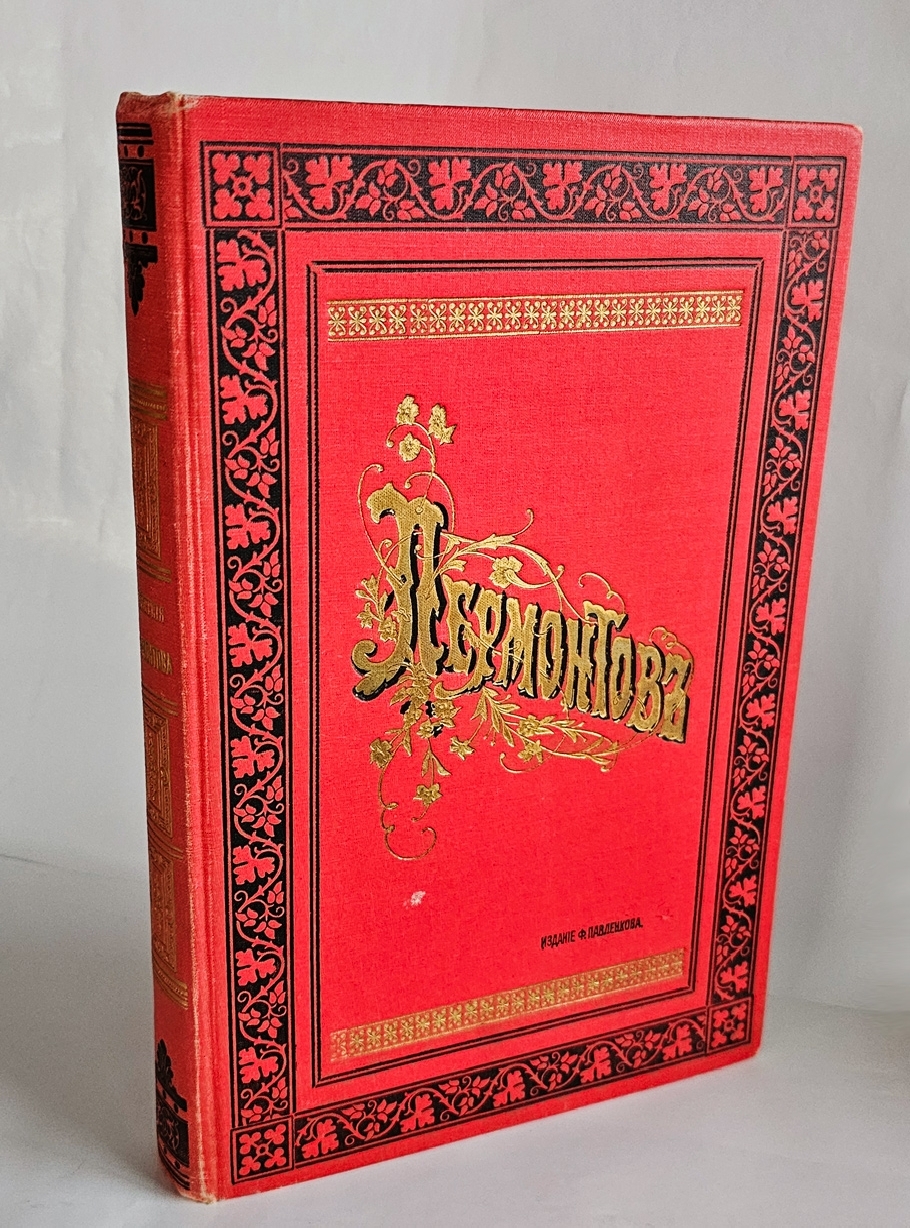 Полное собрание в одном томе. Издано под редакцией А. Скабичевского. С портретом Лермонтова и его близких, его биографией, факсимиле, с снимками с грота, памятника, дома Арсеньевой, с 4 рисунками Лермонтова и 132 рисунками художника М. Малышева. [2] стр., XXVIII, LXIV, 960 стлб., 3 л. фронт. (илл., портр.), 17 вкл. л. илл., факс. Владельческая подпись на свободном листе форзаца и фронтисписе.