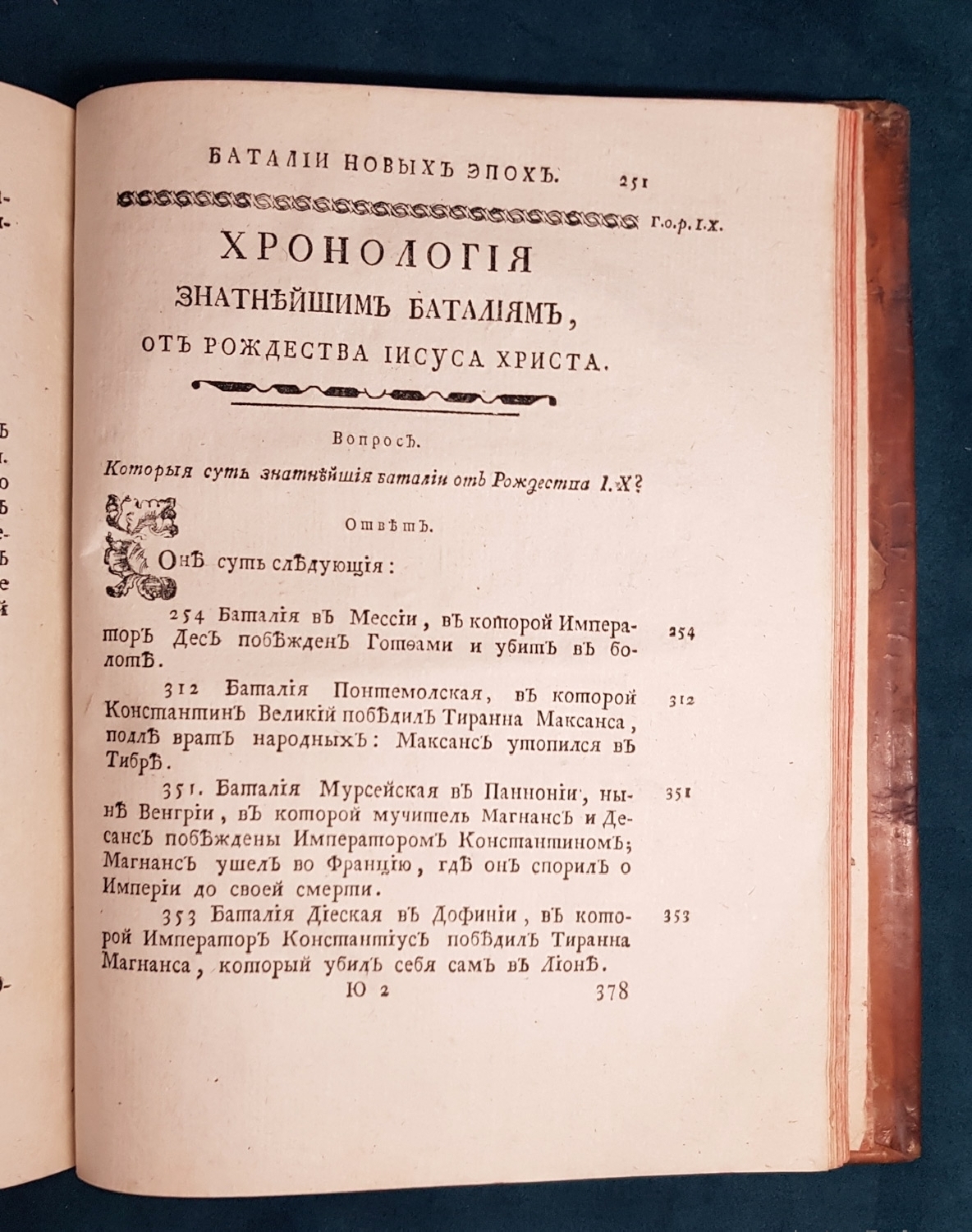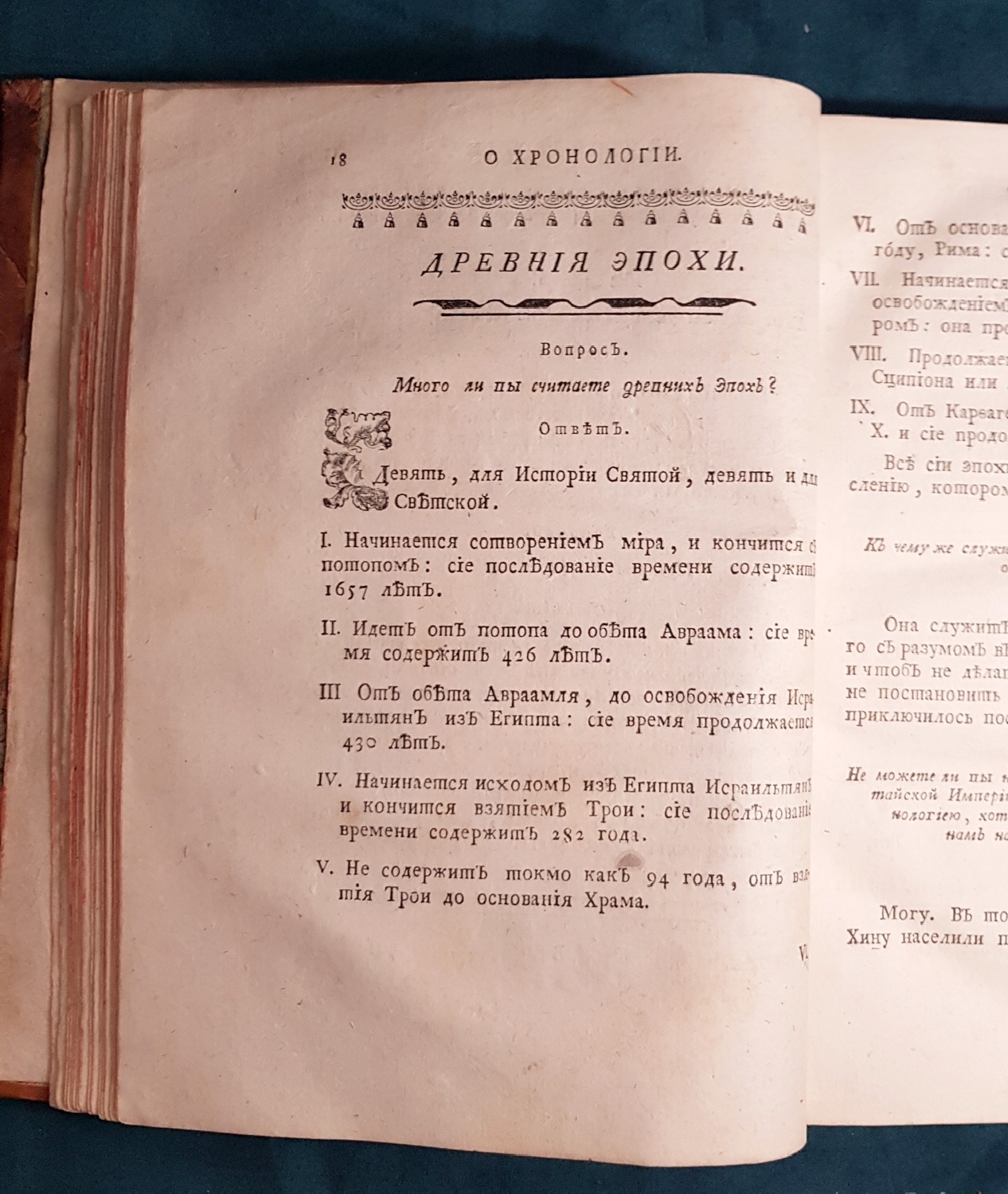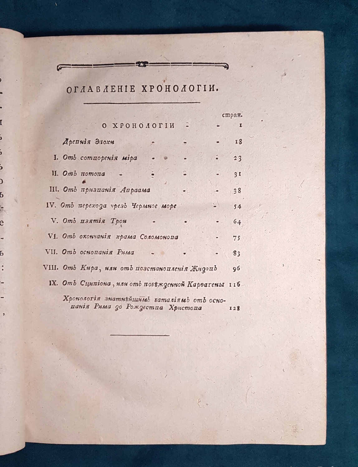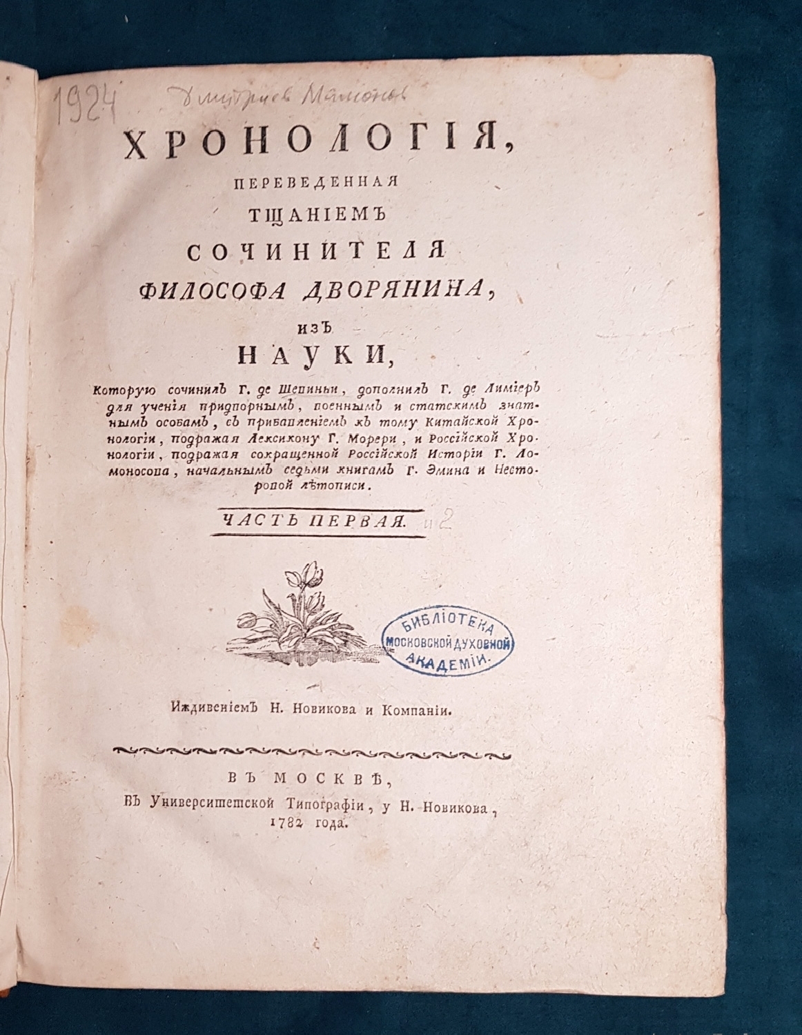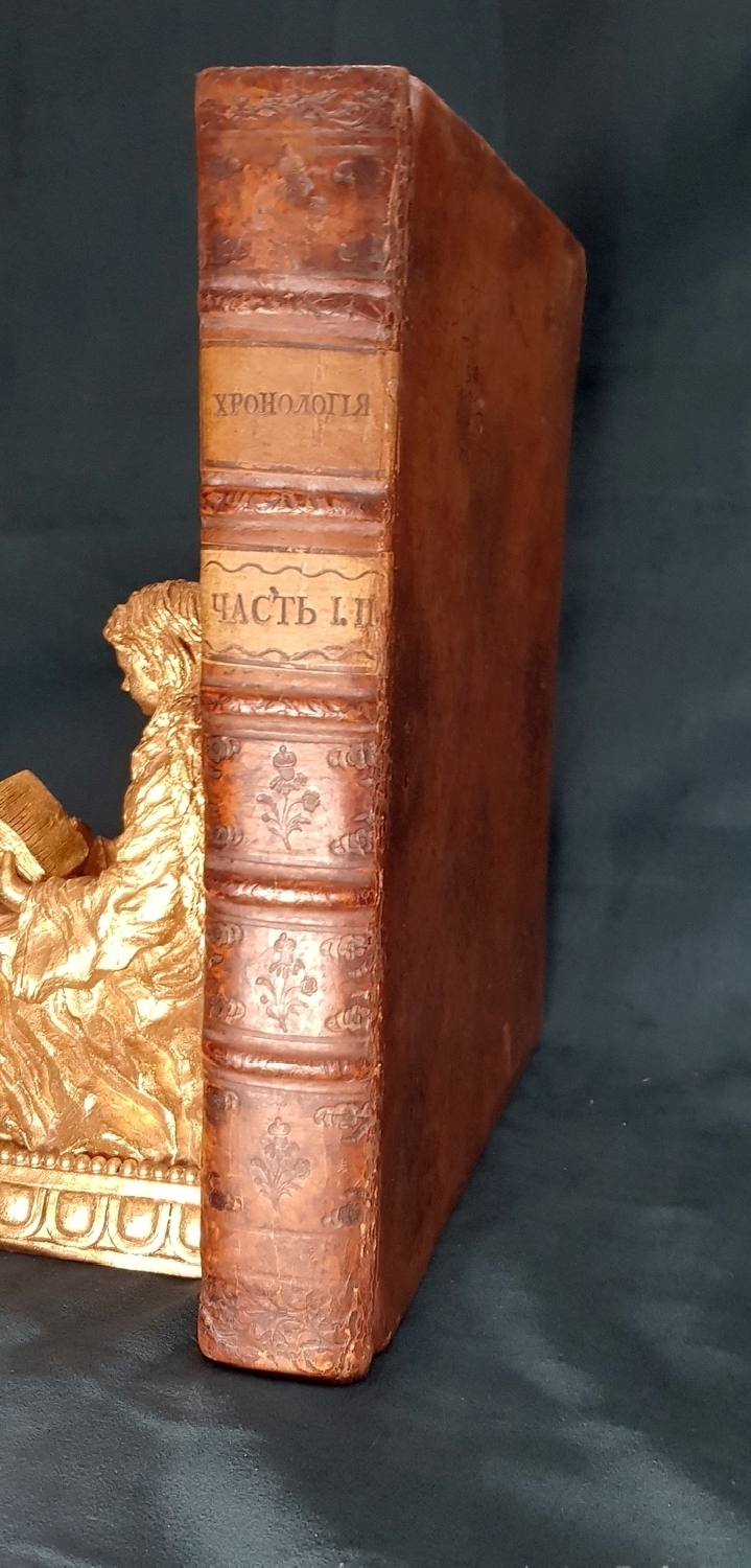 Название - Хронология, переведенная тщанием сочинителя философа Дворянина из науки, которую сочинил де Шевиньи, дополнил де Лимиер, для учения придворным, военным и статским знатным особам, с прибавлением к тому Китайской Хронологии, подражая Лексикону Морери и Российской Хронологии, подражая Ломоносова и Эмина истории и летописи Несторовой. 2 части. Москва, в университетской типографии 1782 г. (4) 15 руб. Из каталога Александра Смирдина