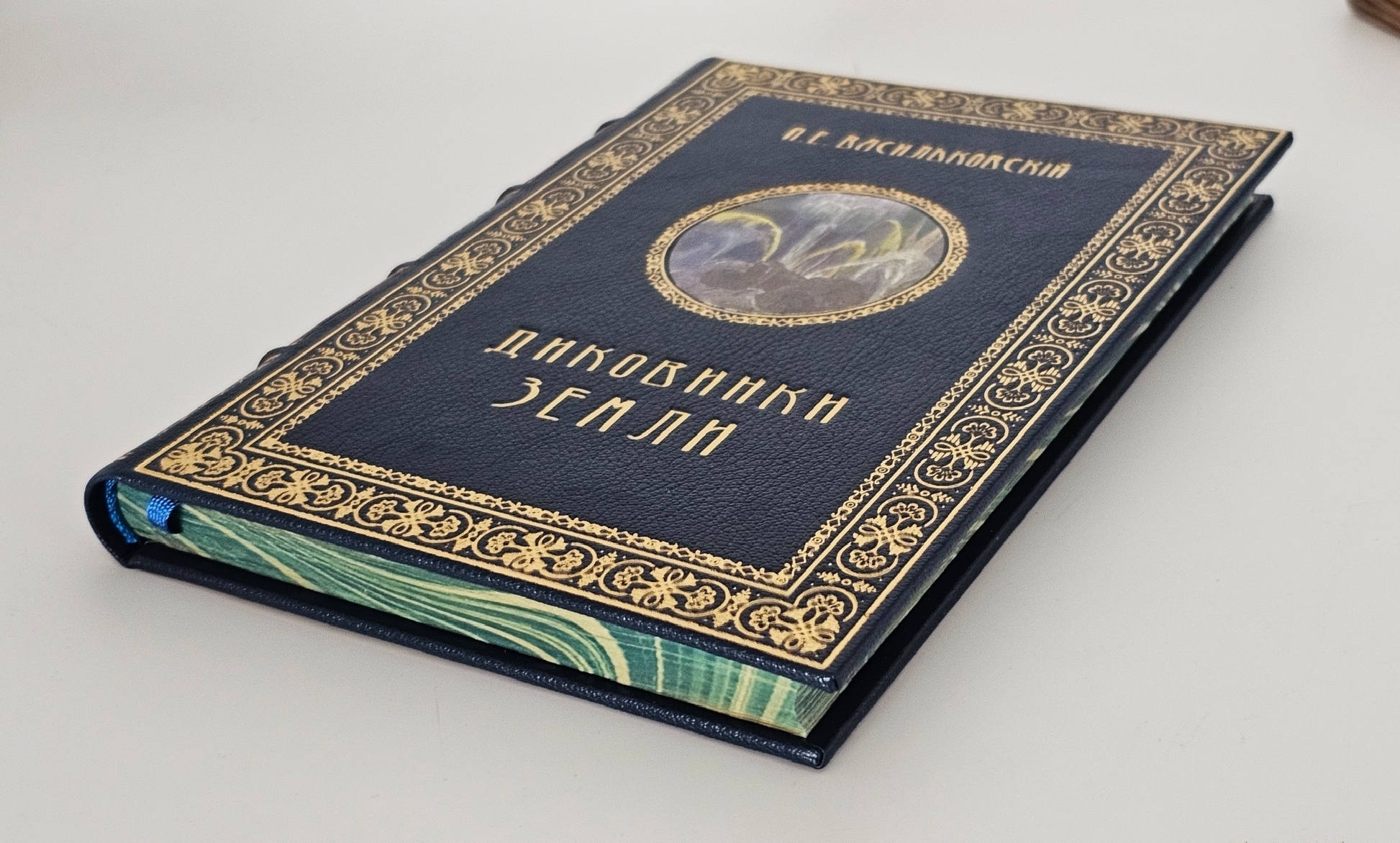 Книга в роскошном переплете из натуральной кожи. С инкрустацией и золотым тиснением на корешке и крышках. Обрезы с рисунком "морская волна". Форзацы под мрамор. Сохранена издательская художественно-оформленная мягкая обложка. Издание редкое. 266 стр., формат: 23x17,5 см. Состояние отличное.
