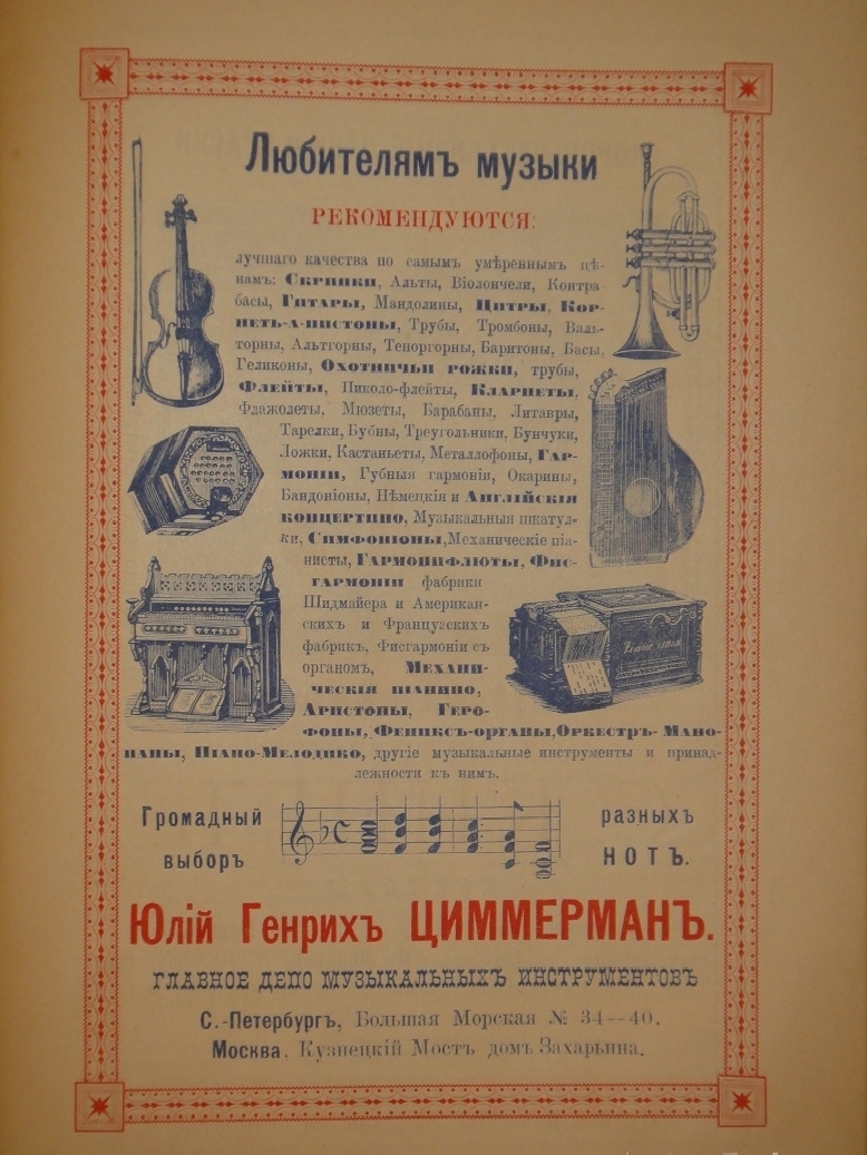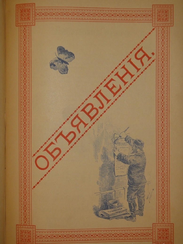 В конце, после основного текста, есть " Справочный отдел " ( с адресами и краткими сведениями о С.-Петербургских магазинах, библиотеках, мастерских, фабриках и других заведениях ) и занимательный раздел " Объявлений " на 74-х страницах, предлагающий читателю самые разнообразные товары и услуги: дамские шляпки и парфюмерию, мебель и ткани, вина и кондитерские изделия, громадный выбор разных нот, книг, художественной бронзы, музыкальных инструментов, а также приданного ( готового и на заказ ) и мн. др.