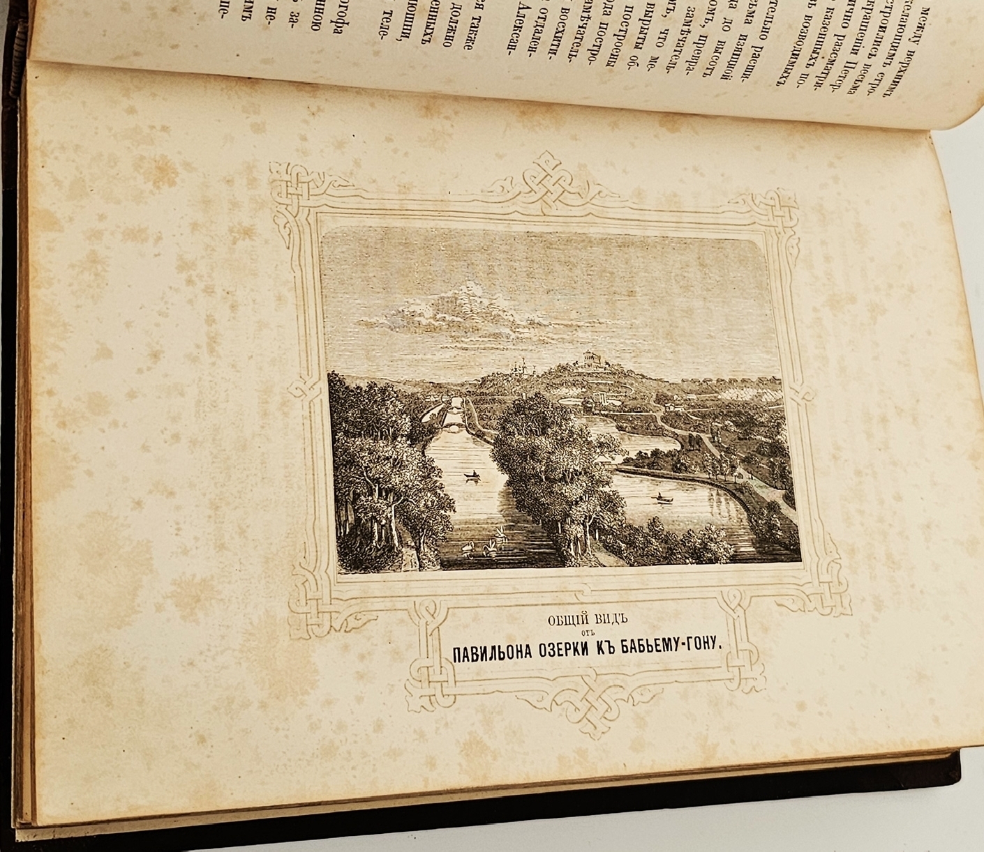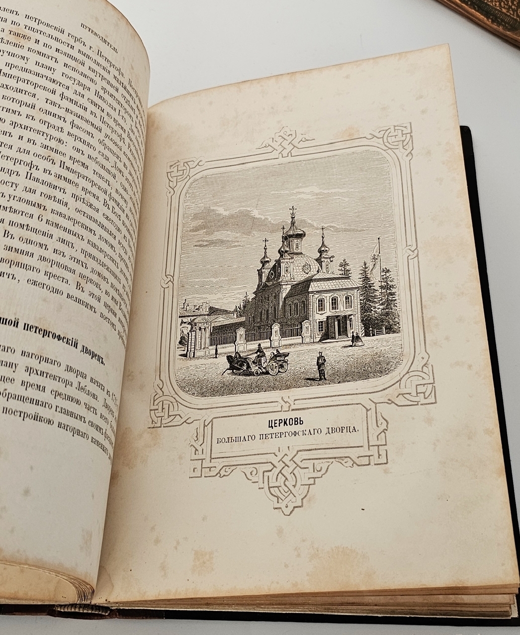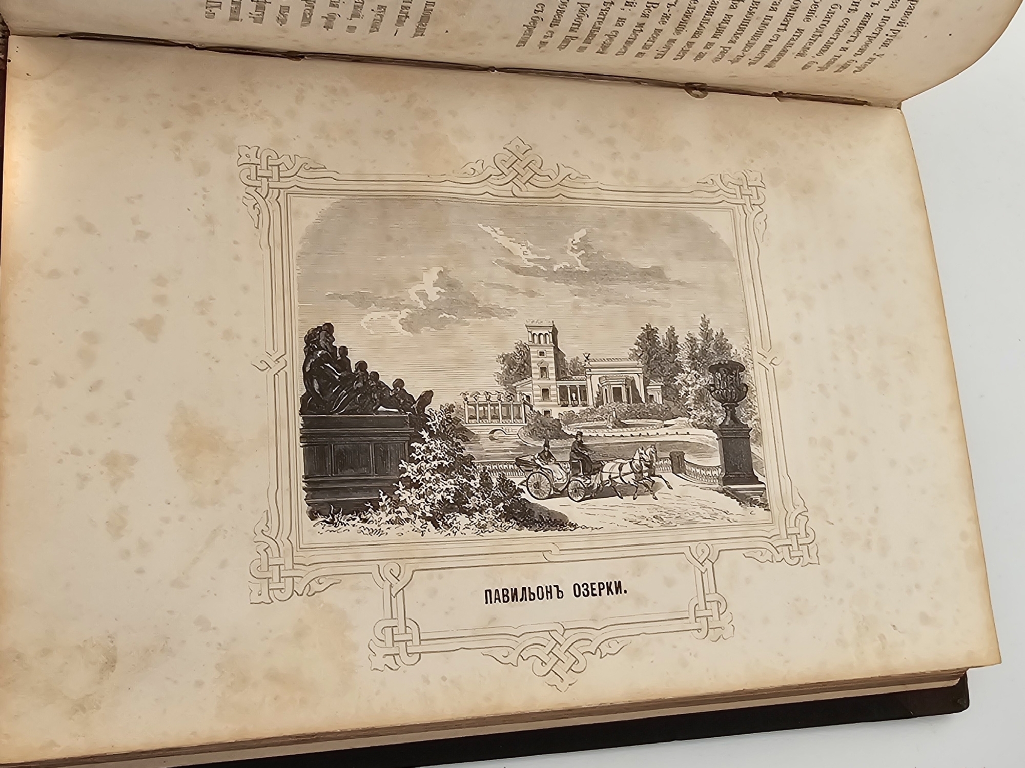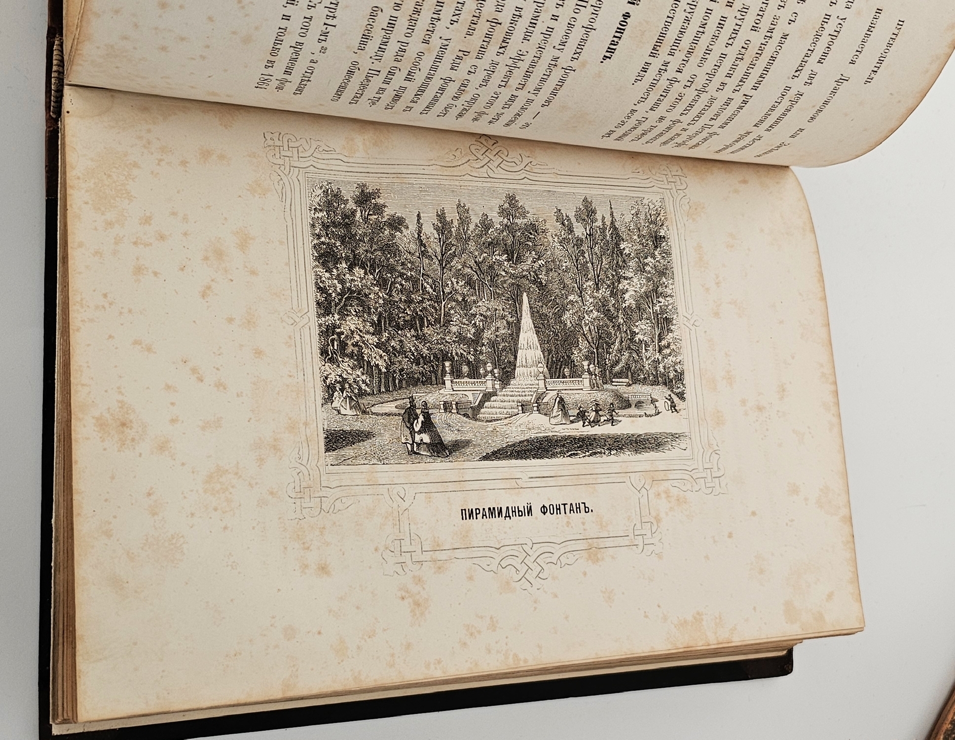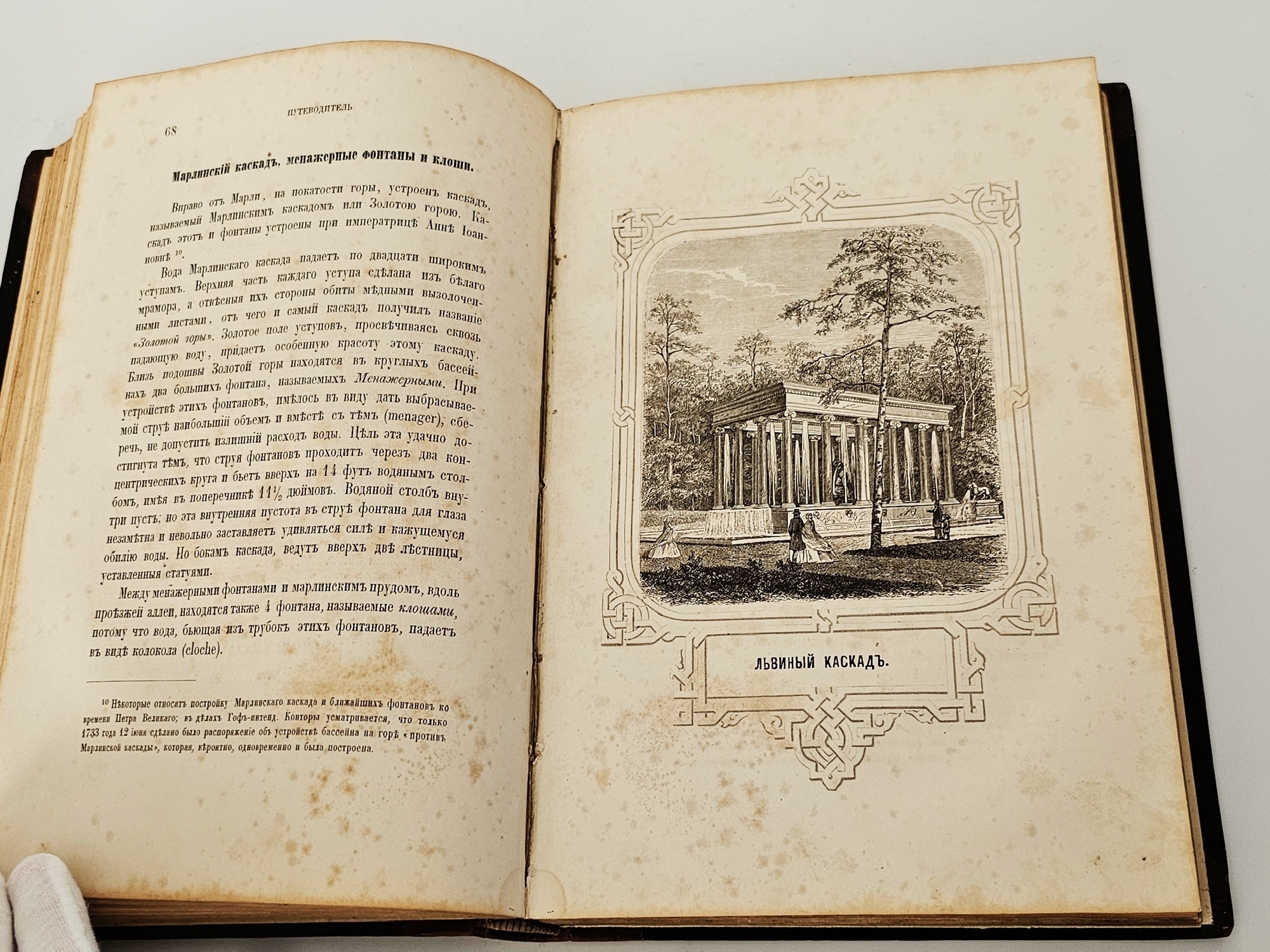 Книга в старинном полукожаном переплете с золотым тиснением. Качественная плотная бумага. [8], IV, [2], 131, VI стр. С литографированным портретом Петра Великого, тридцатью тремя видами и двумя большими планами Петергофа. Полный комплект иллюстраций. Отличная сохранность.