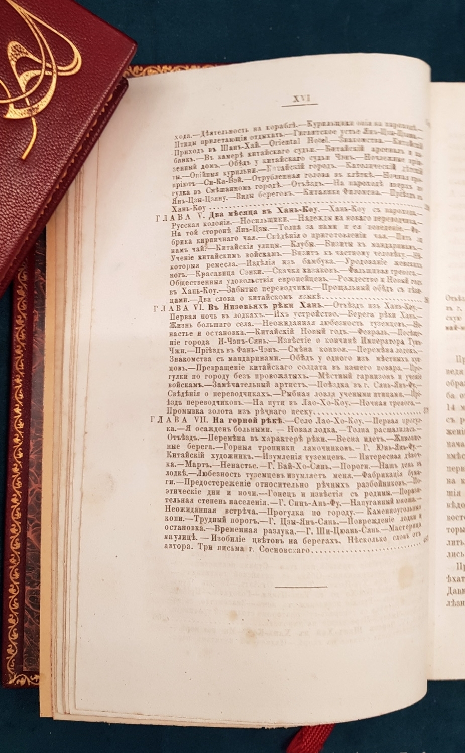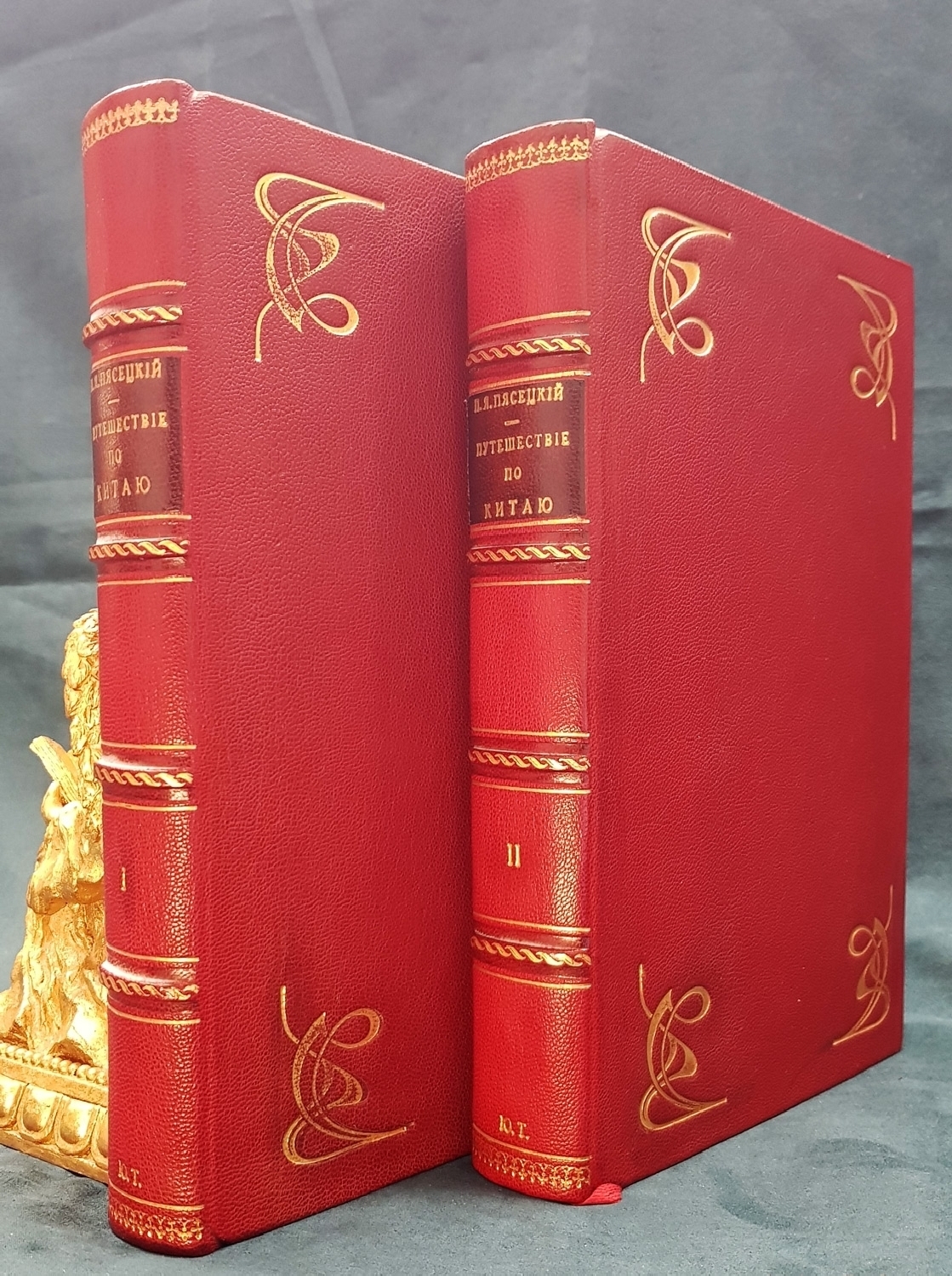 Два тома в красивых цельнокожаных переплетах красного цвета с золотым тиснением орнамента на уголках крышки. Золототисненная дублюра, ляссе. В очень хорошем состоянии.